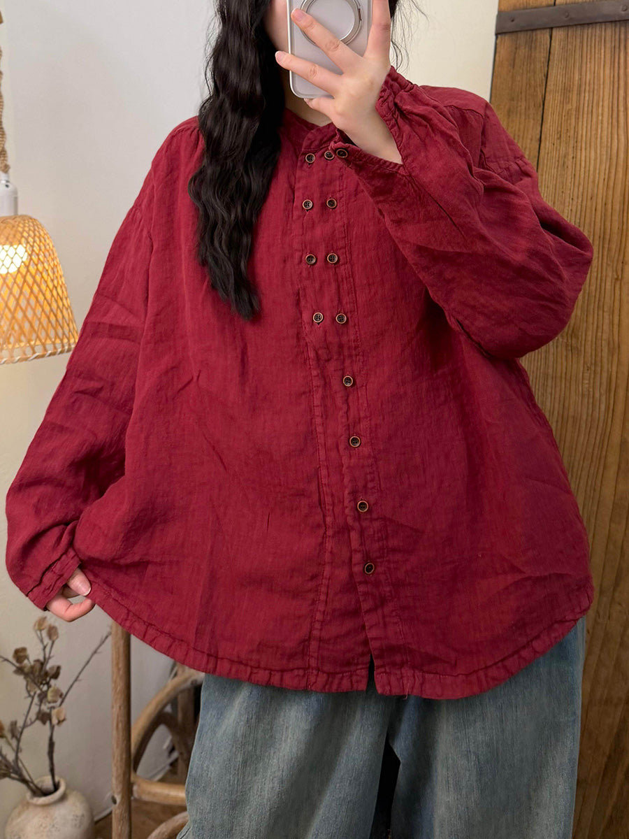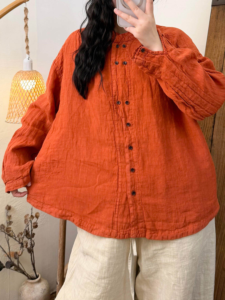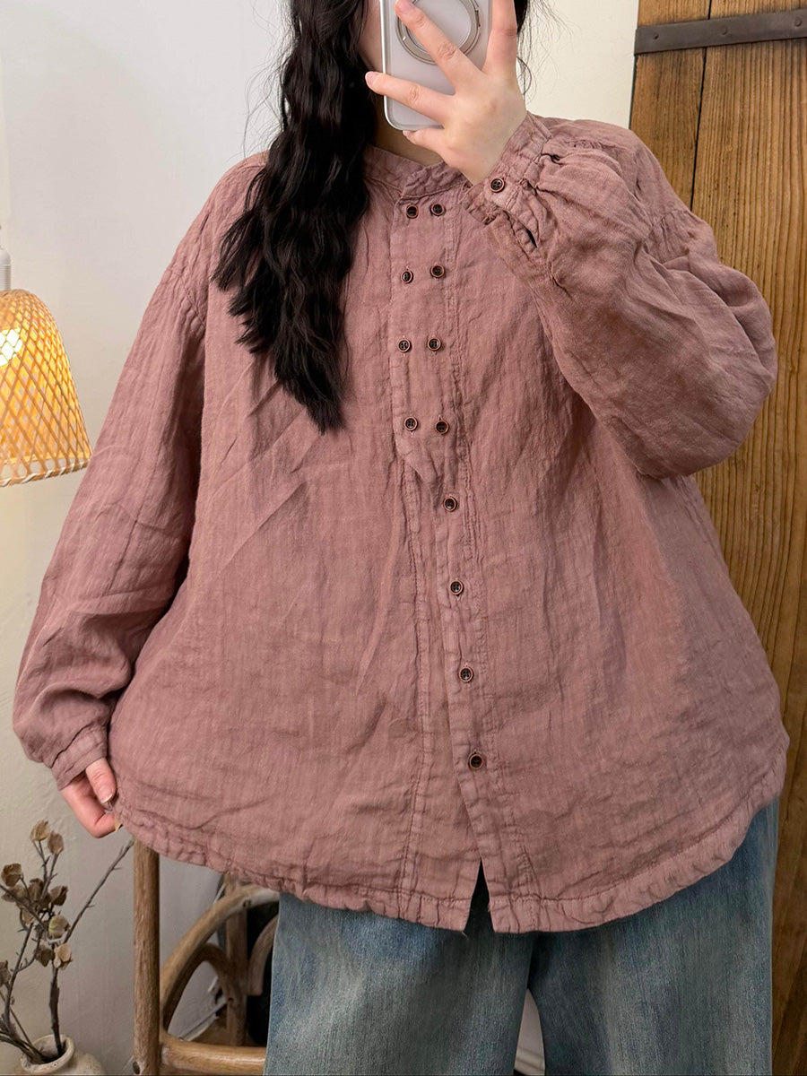 女士秋季復古純色亞麻立領襯衫