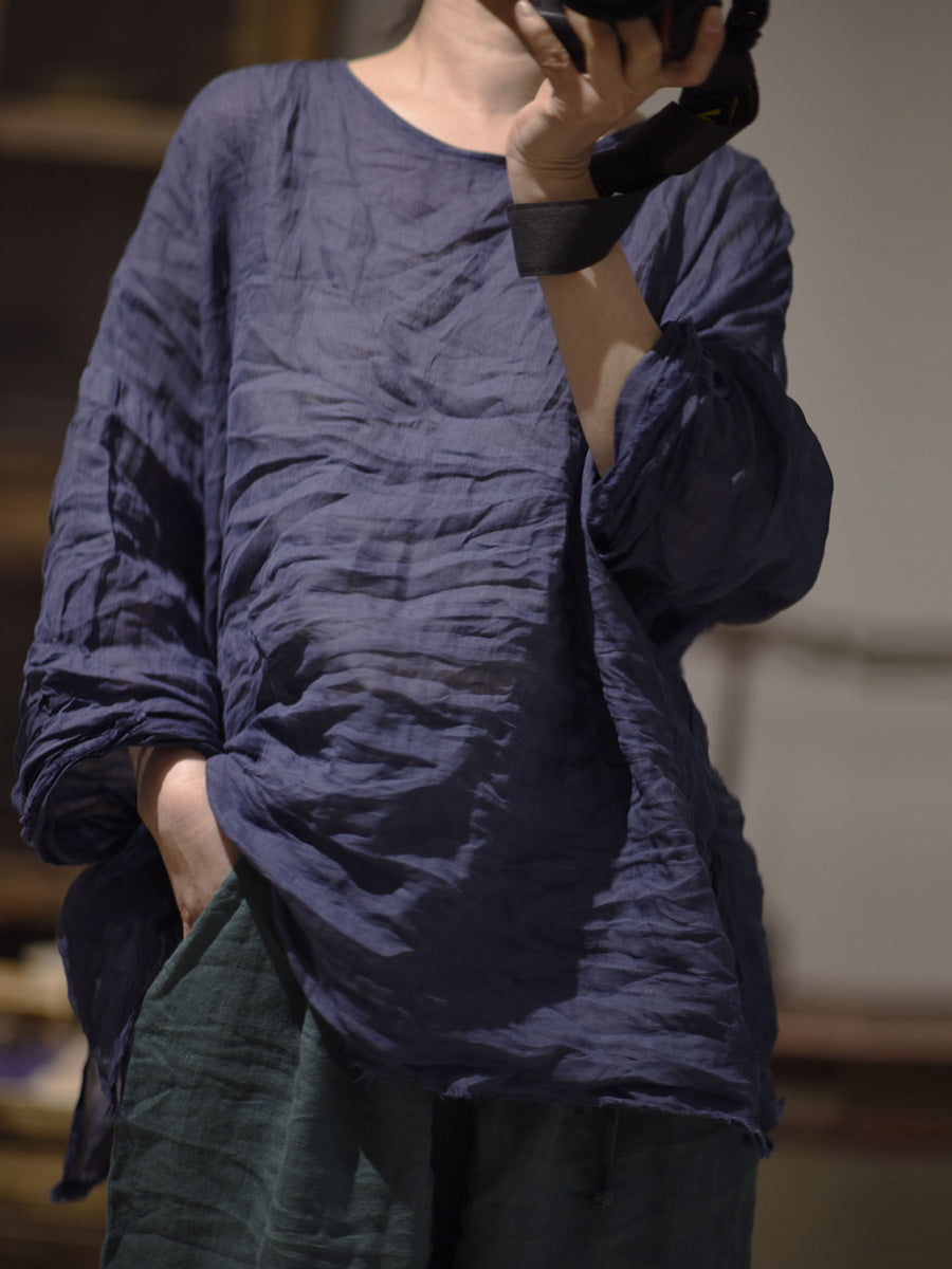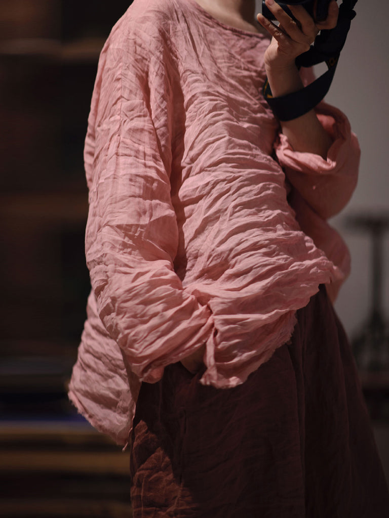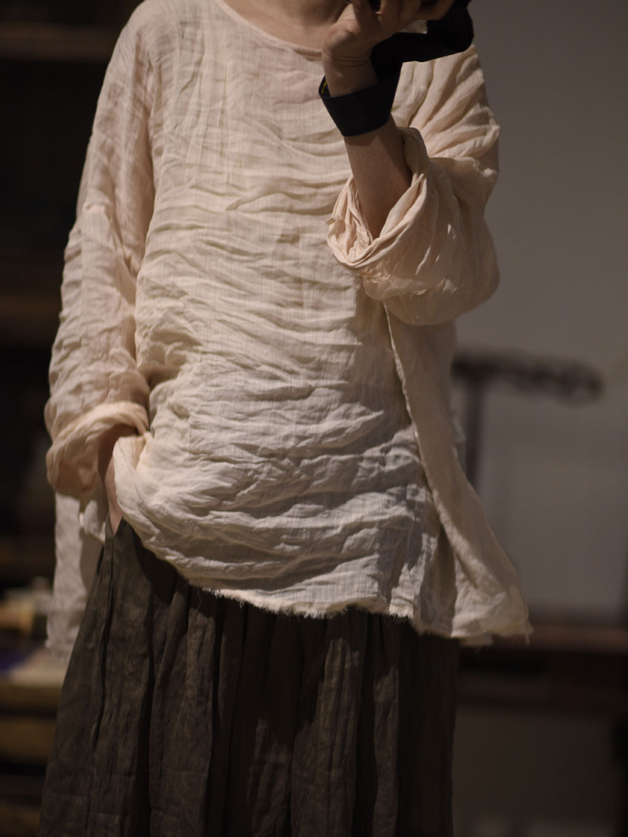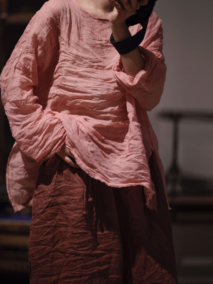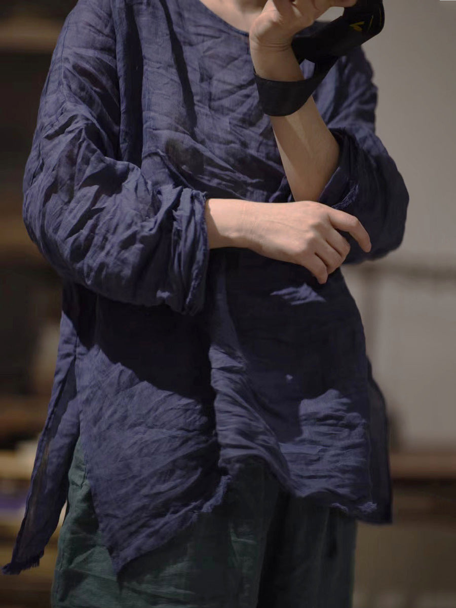 女款秋季純色復古 O 領苧麻襯衫
