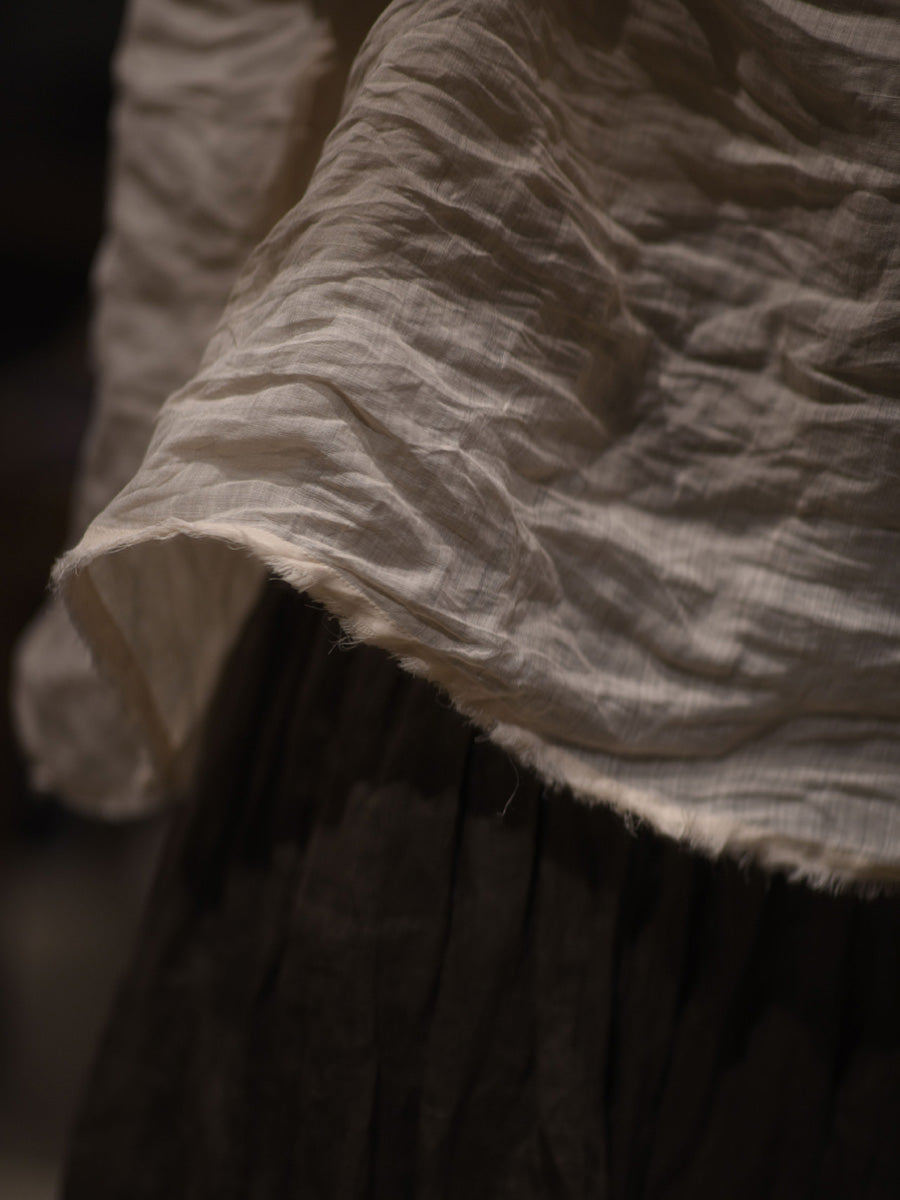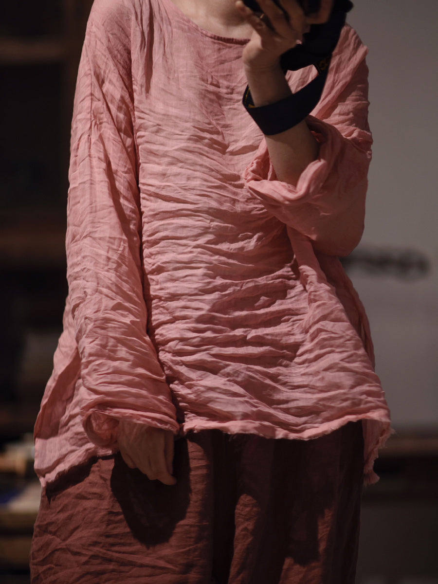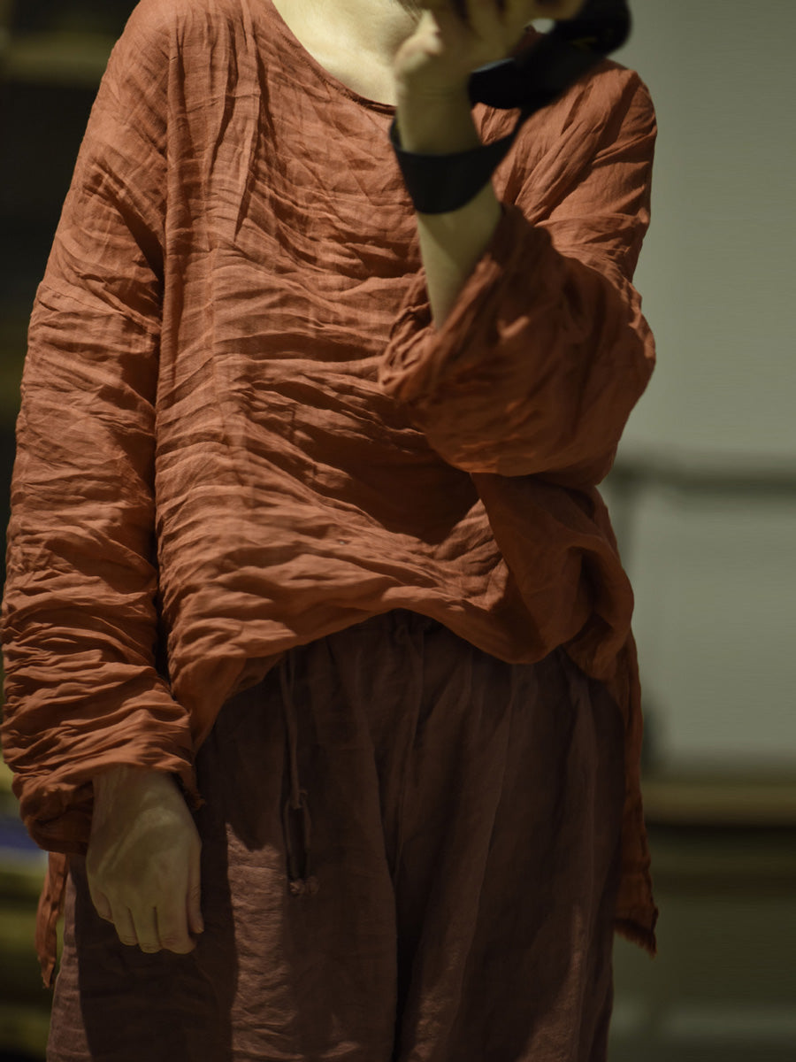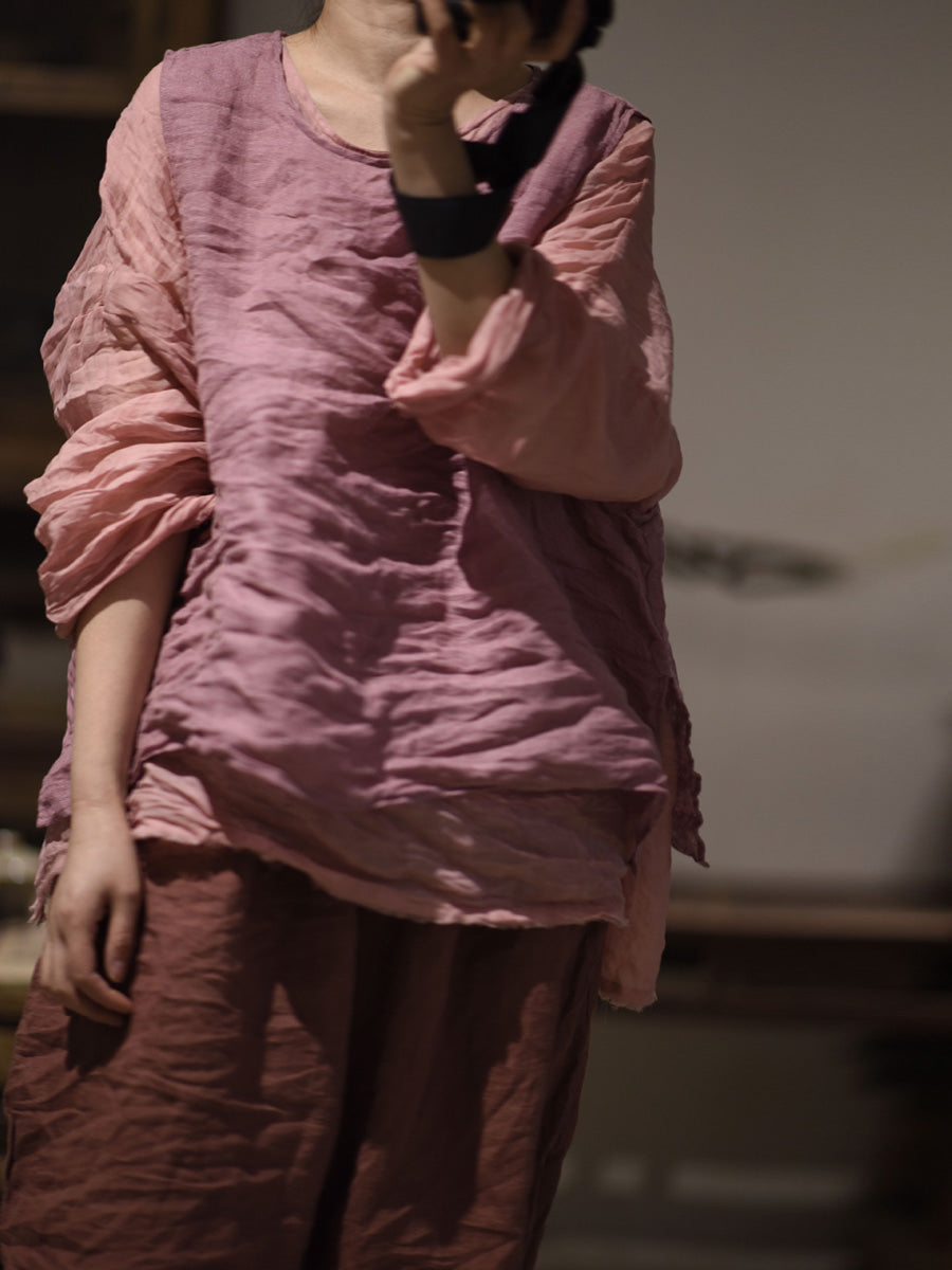 女款秋季純色復古 O 領苧麻襯衫
