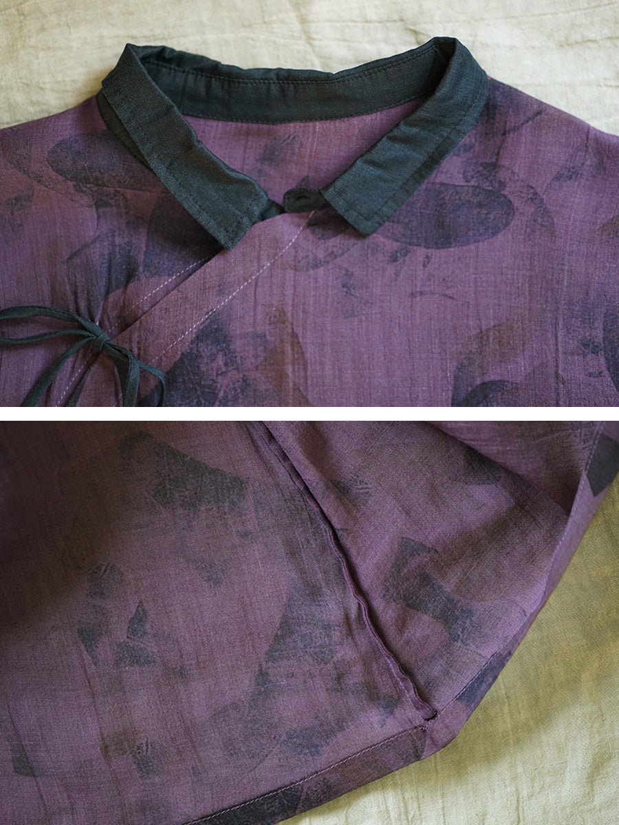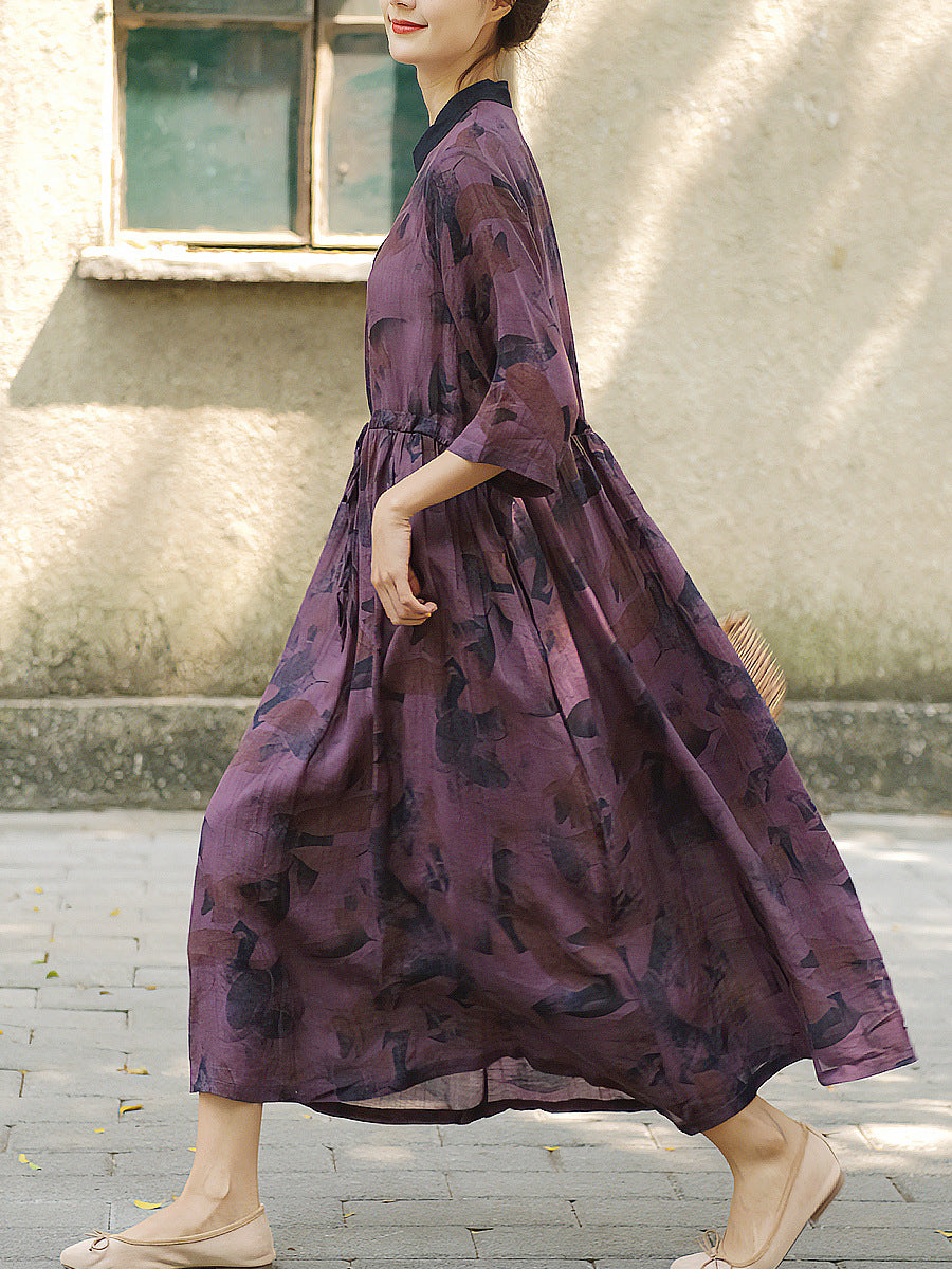 大尺碼女中國風抽繩印花寬鬆連身裙