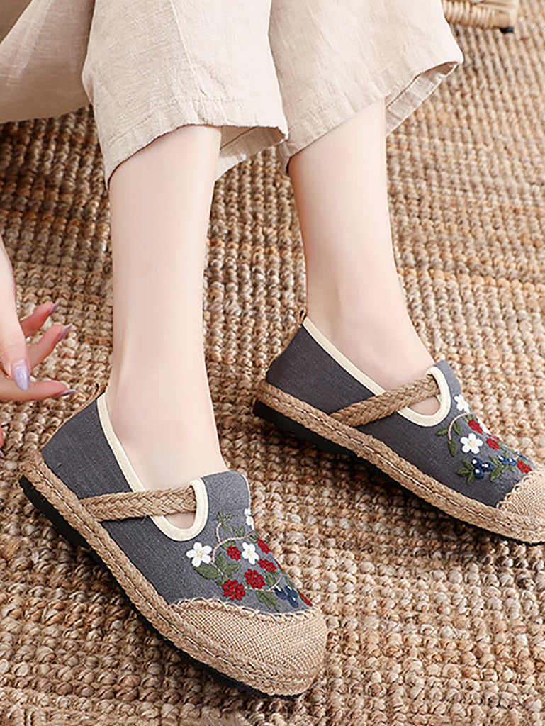 女士民族花卉刺繡平底亞麻鞋