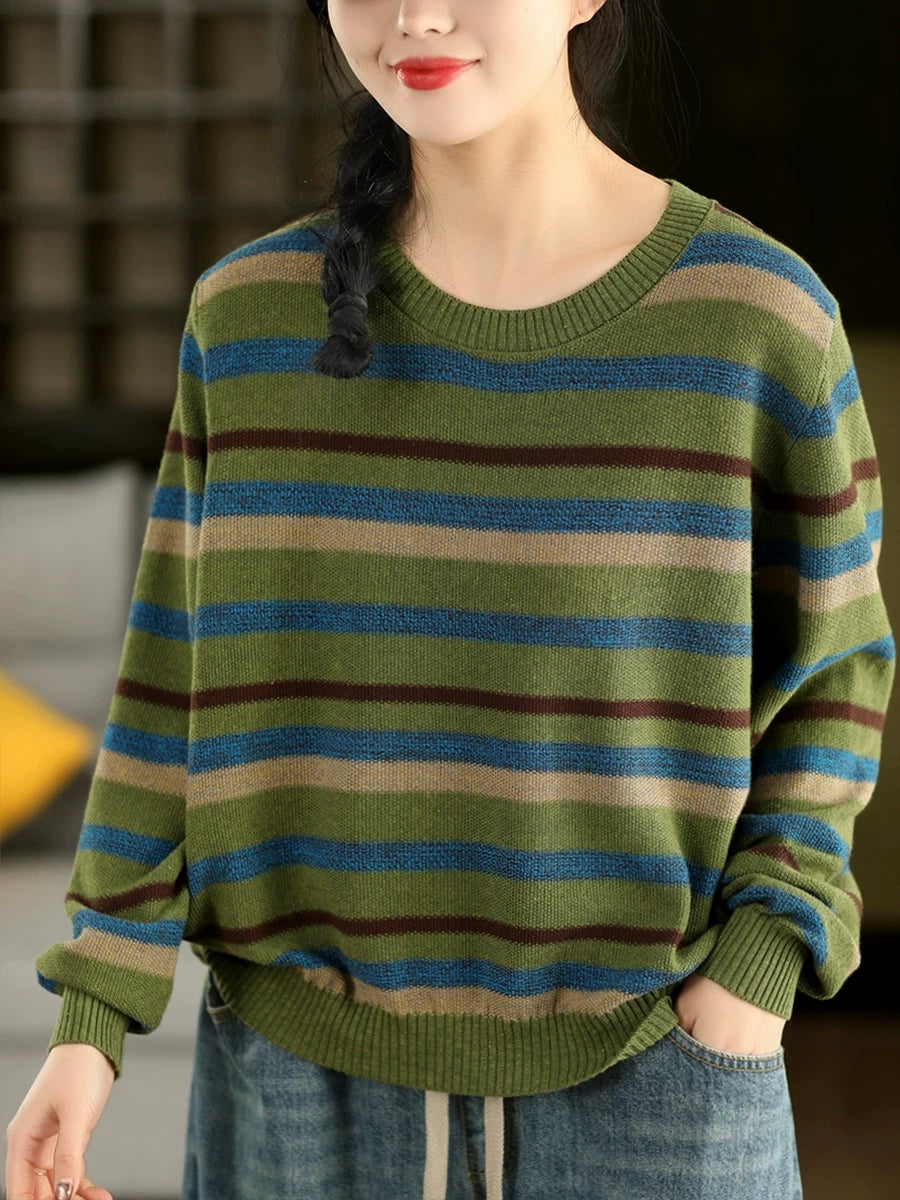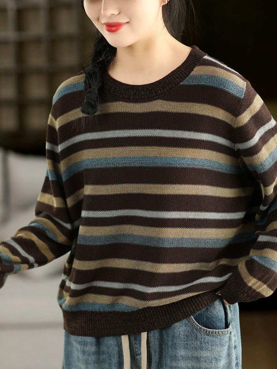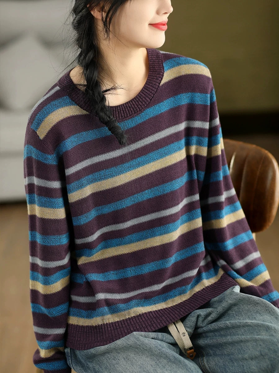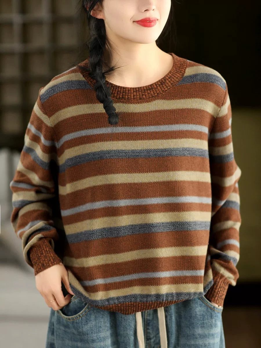 女士復古春季條紋圓領毛衣