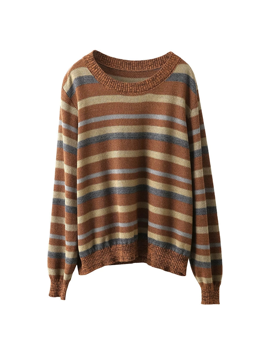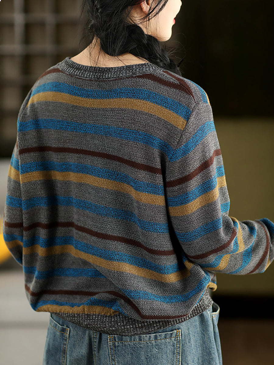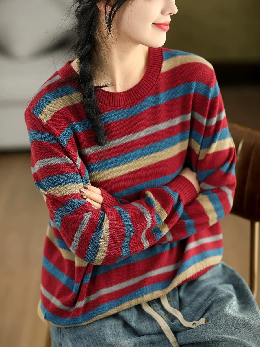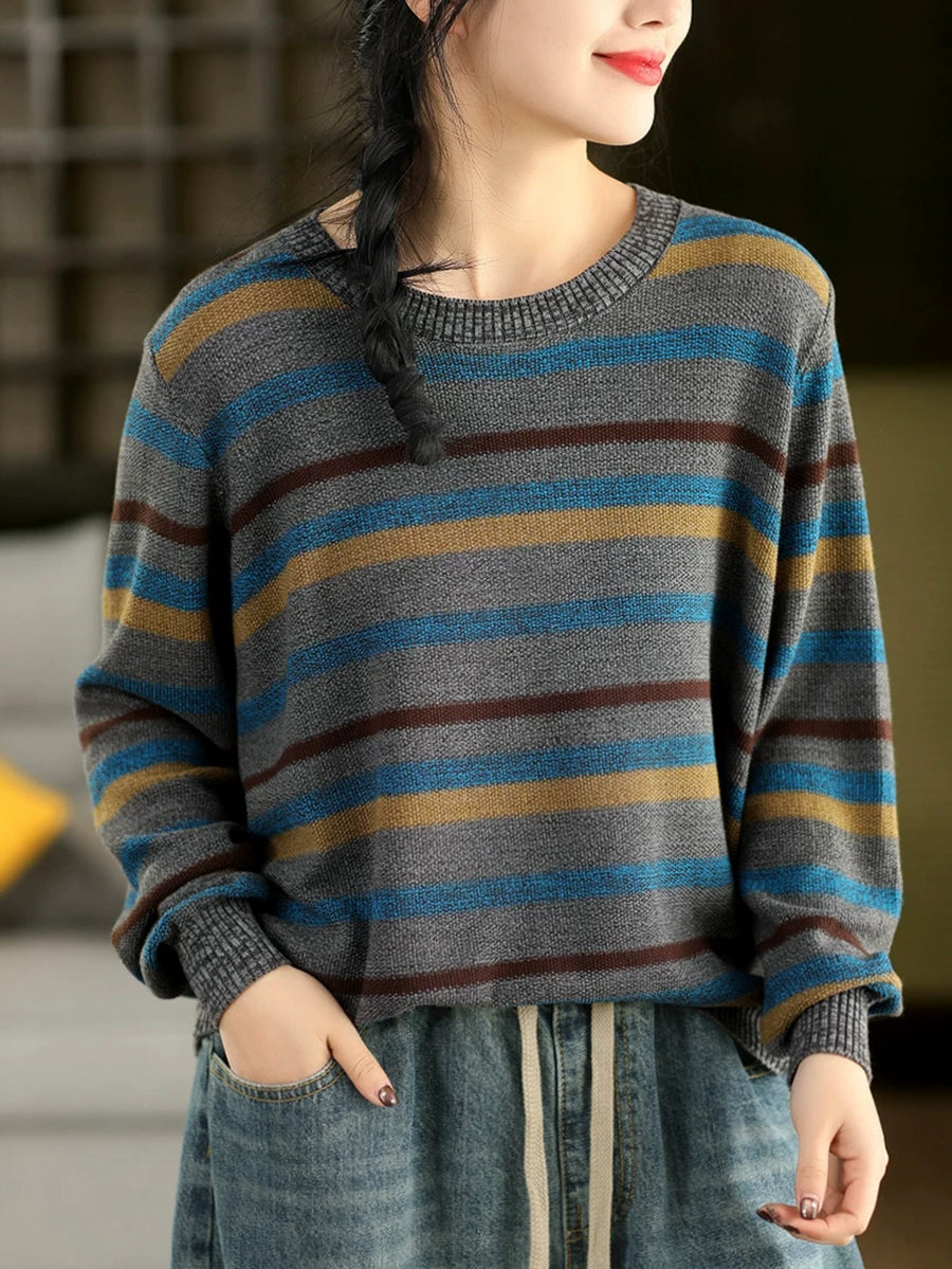 女士復古春季條紋圓領毛衣