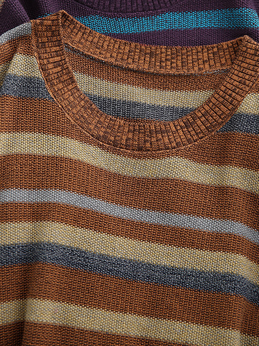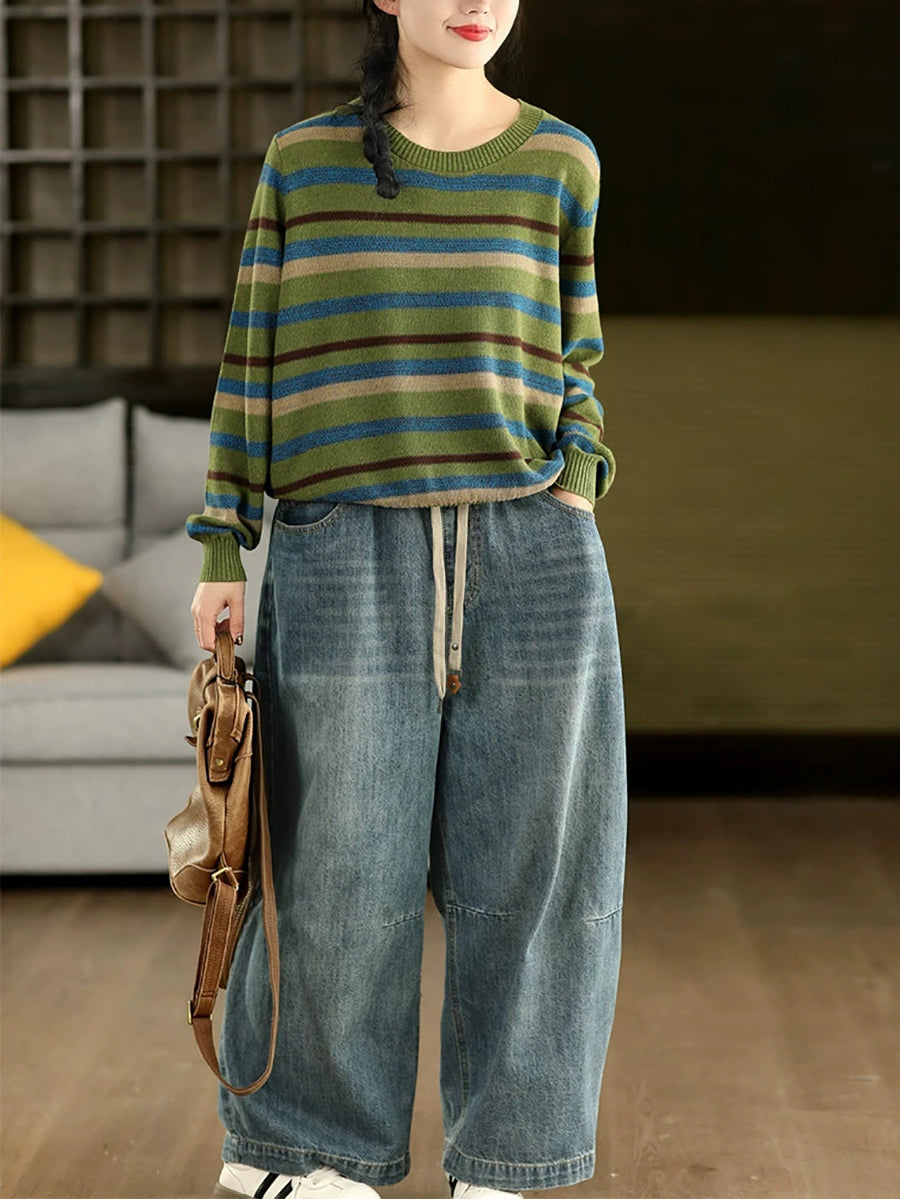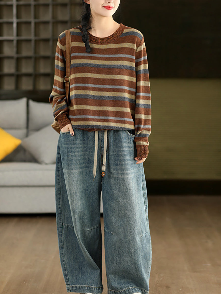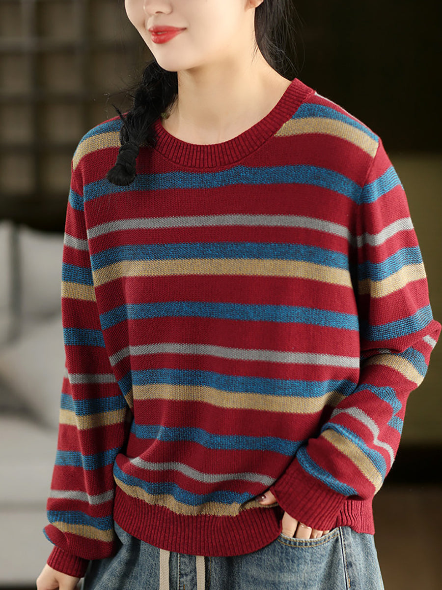 女士復古春季條紋圓領毛衣