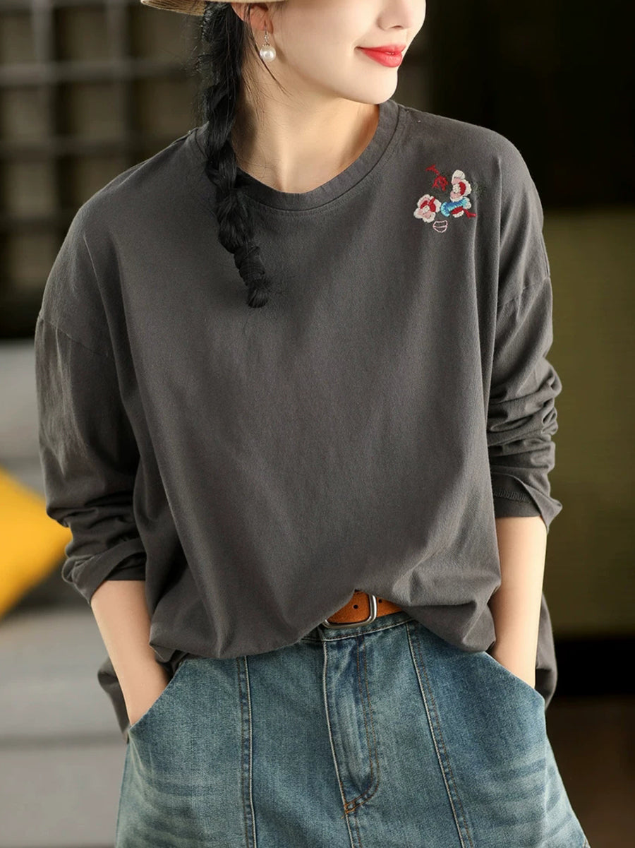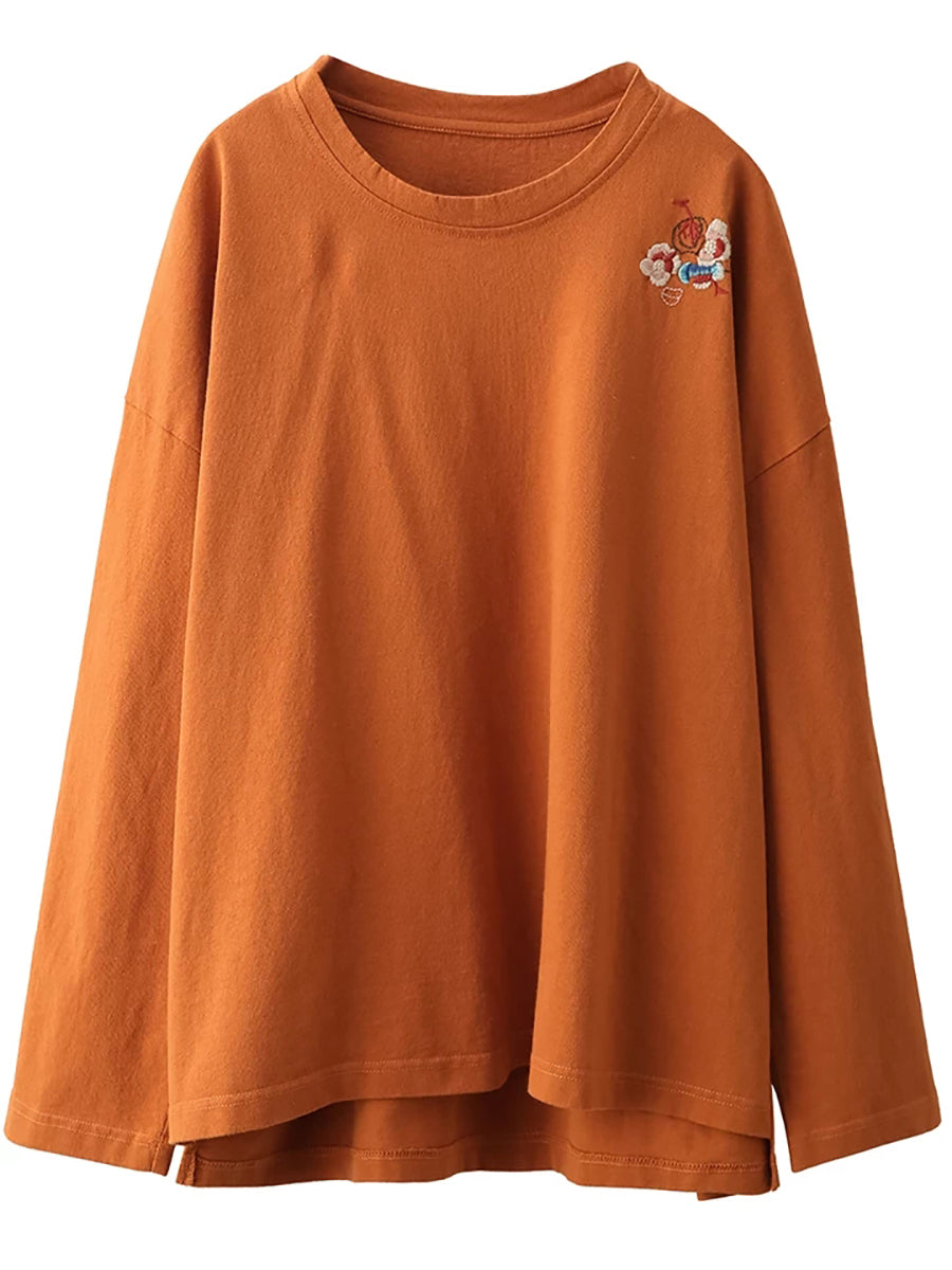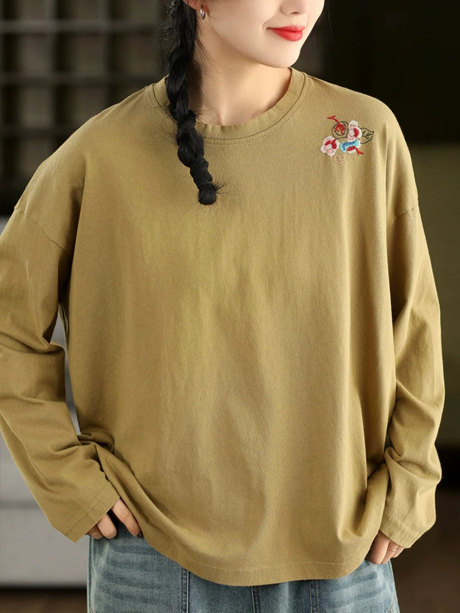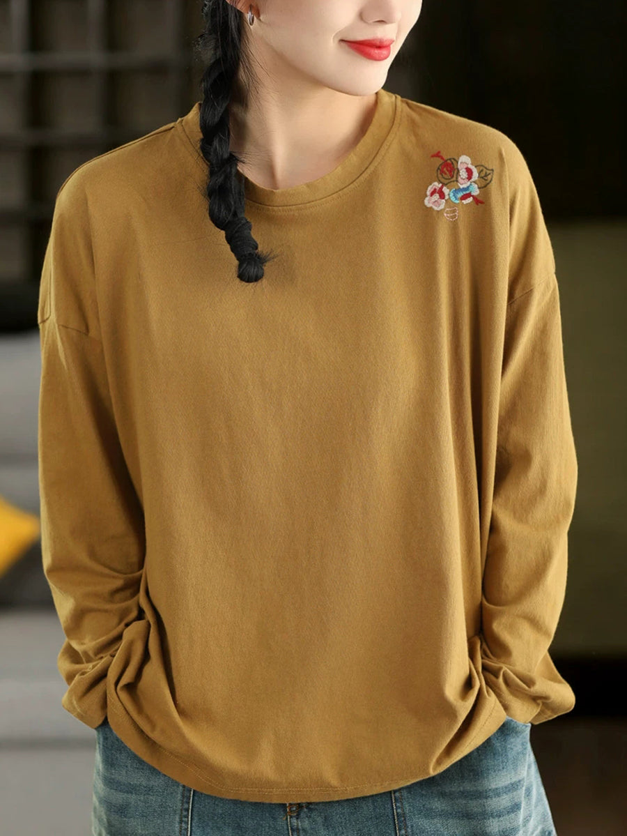 女士春季藝術刺繡100%純棉圓領襯衫