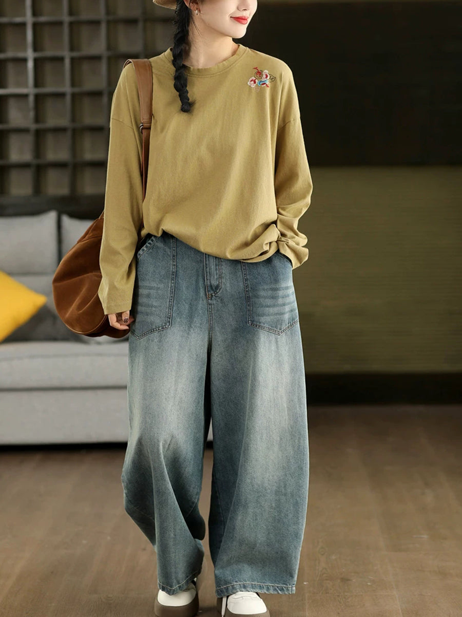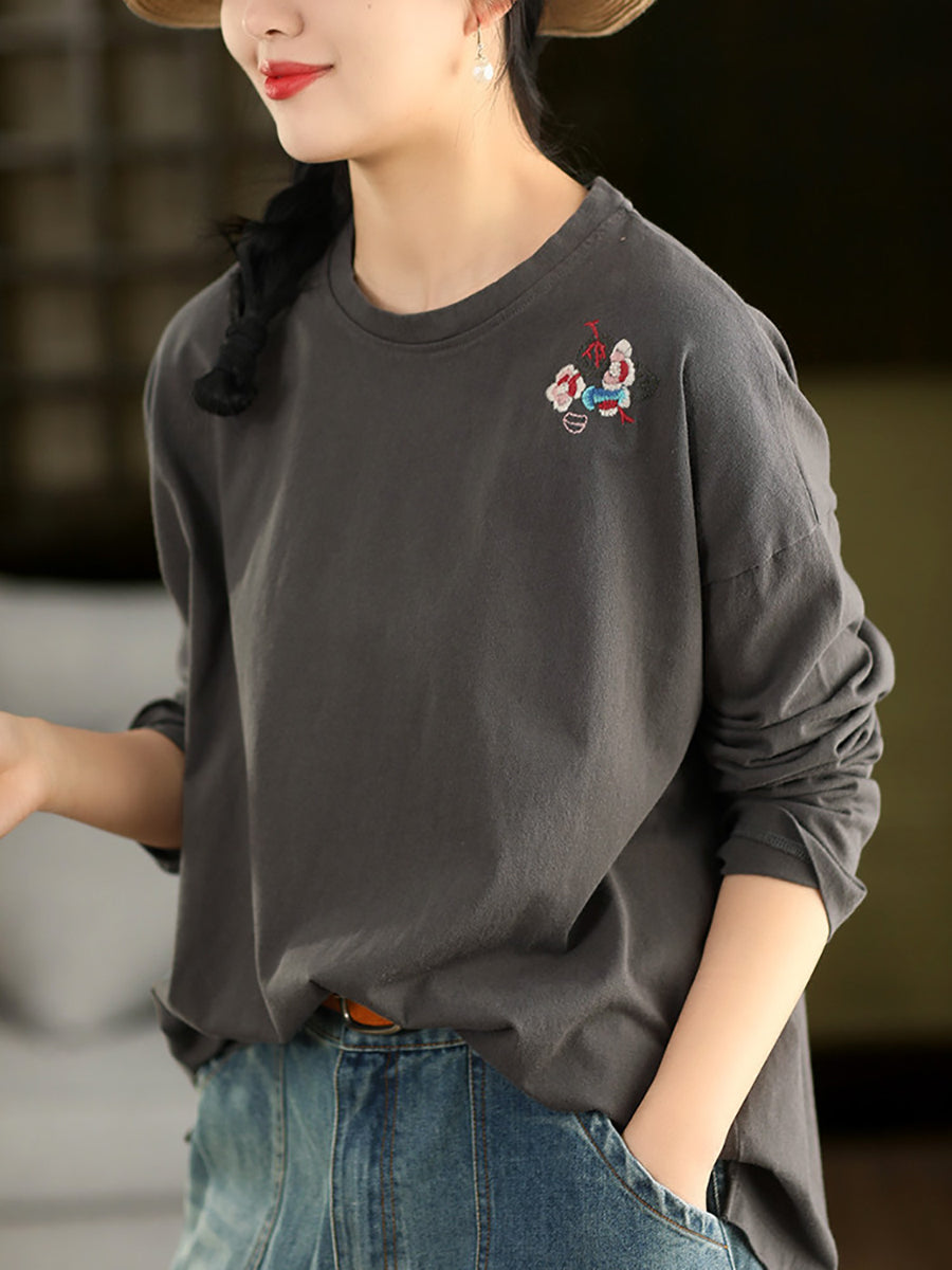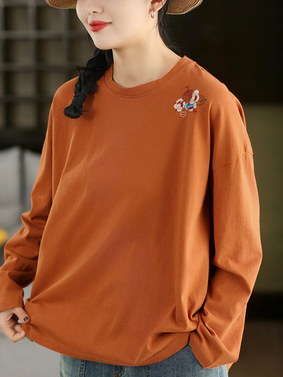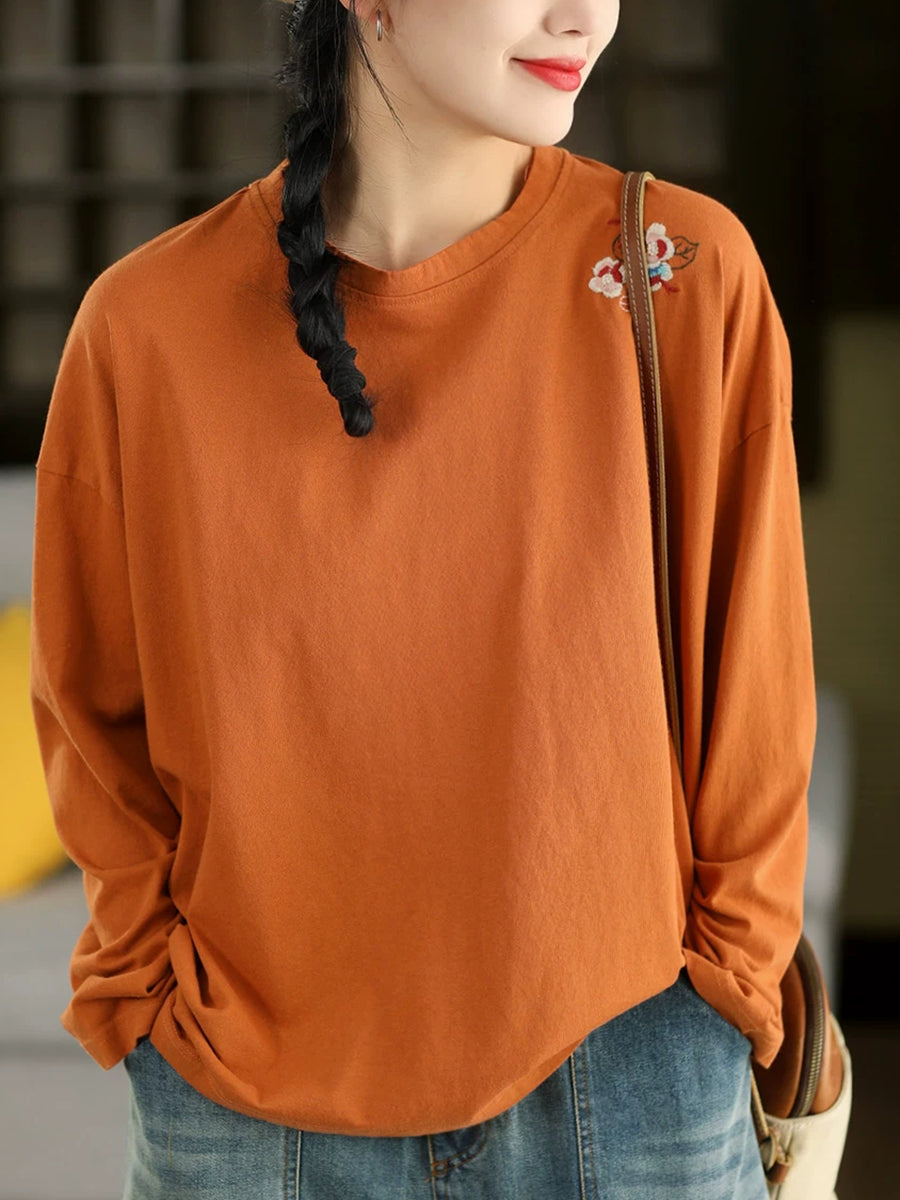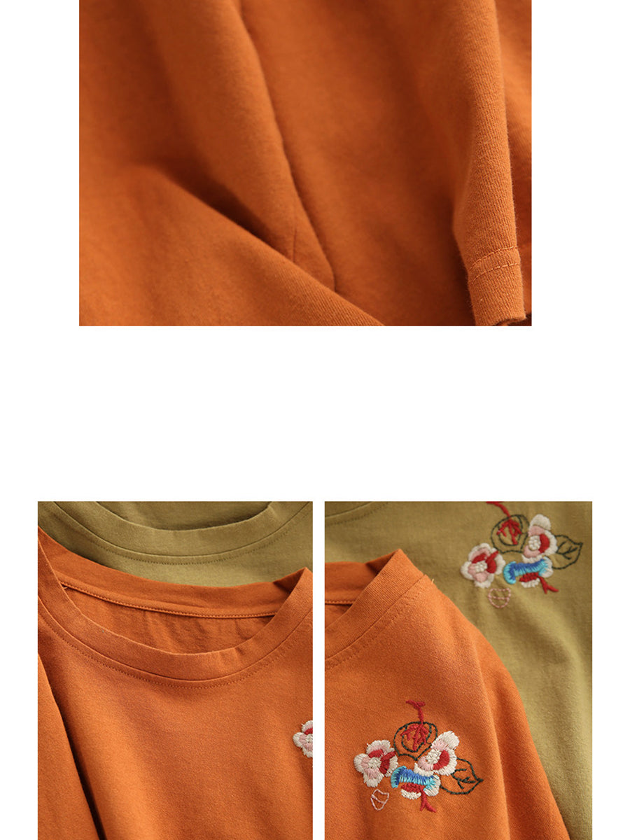 女士春季藝術刺繡100%純棉圓領襯衫