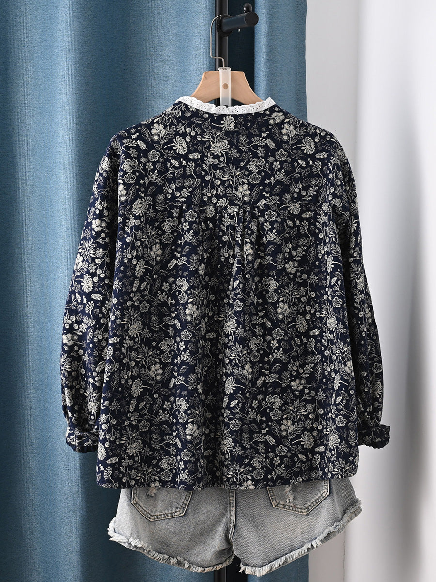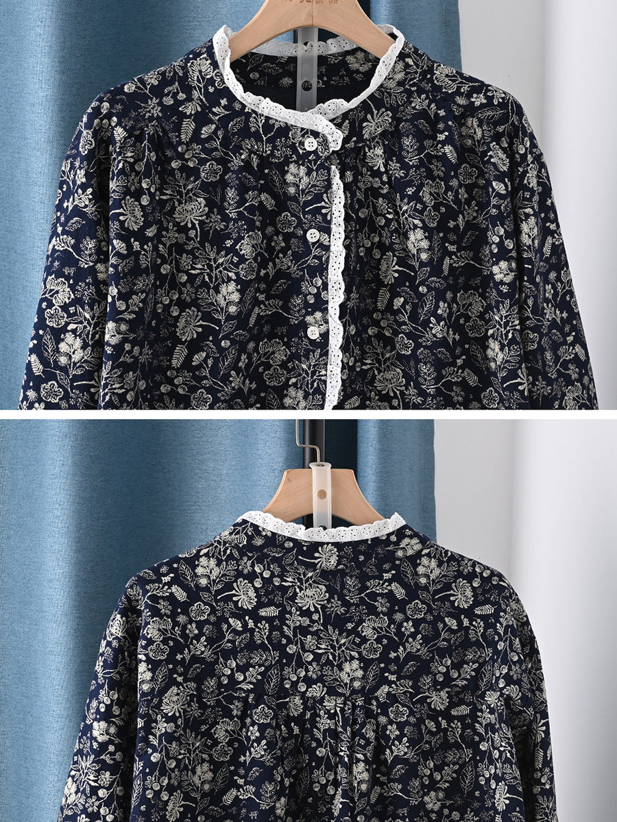女士春季藝術風花卉圖案100%純棉立領襯衫