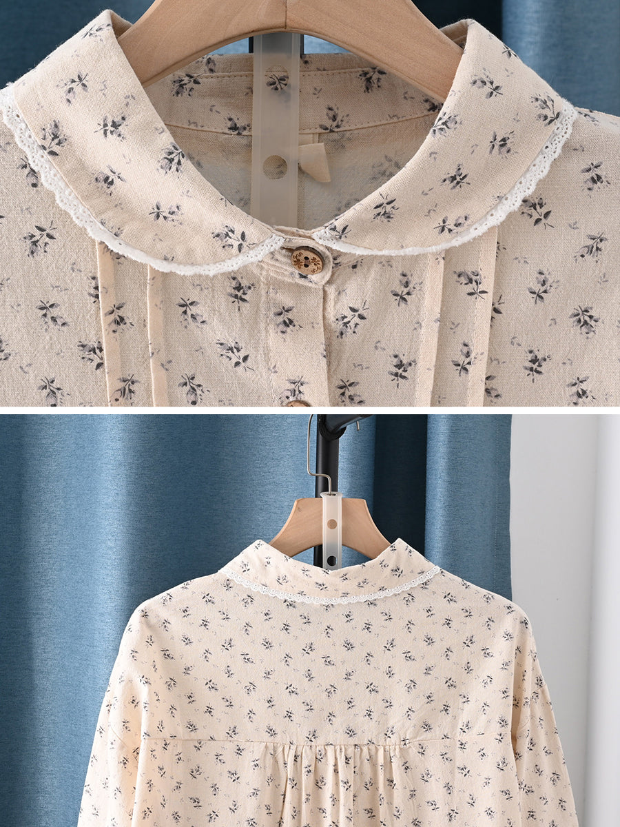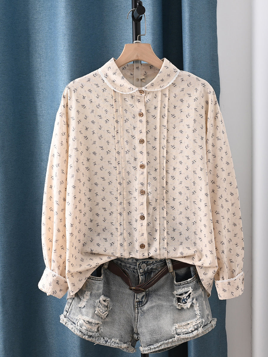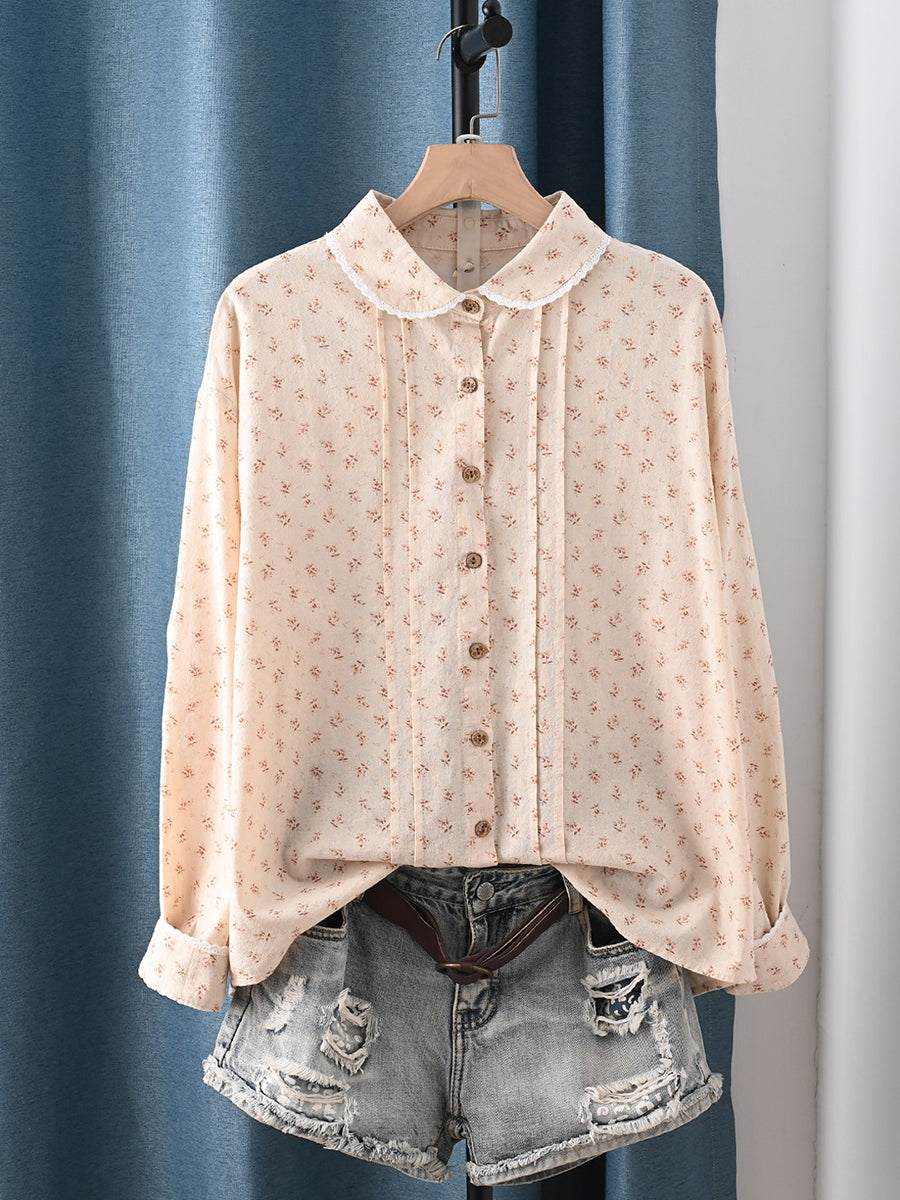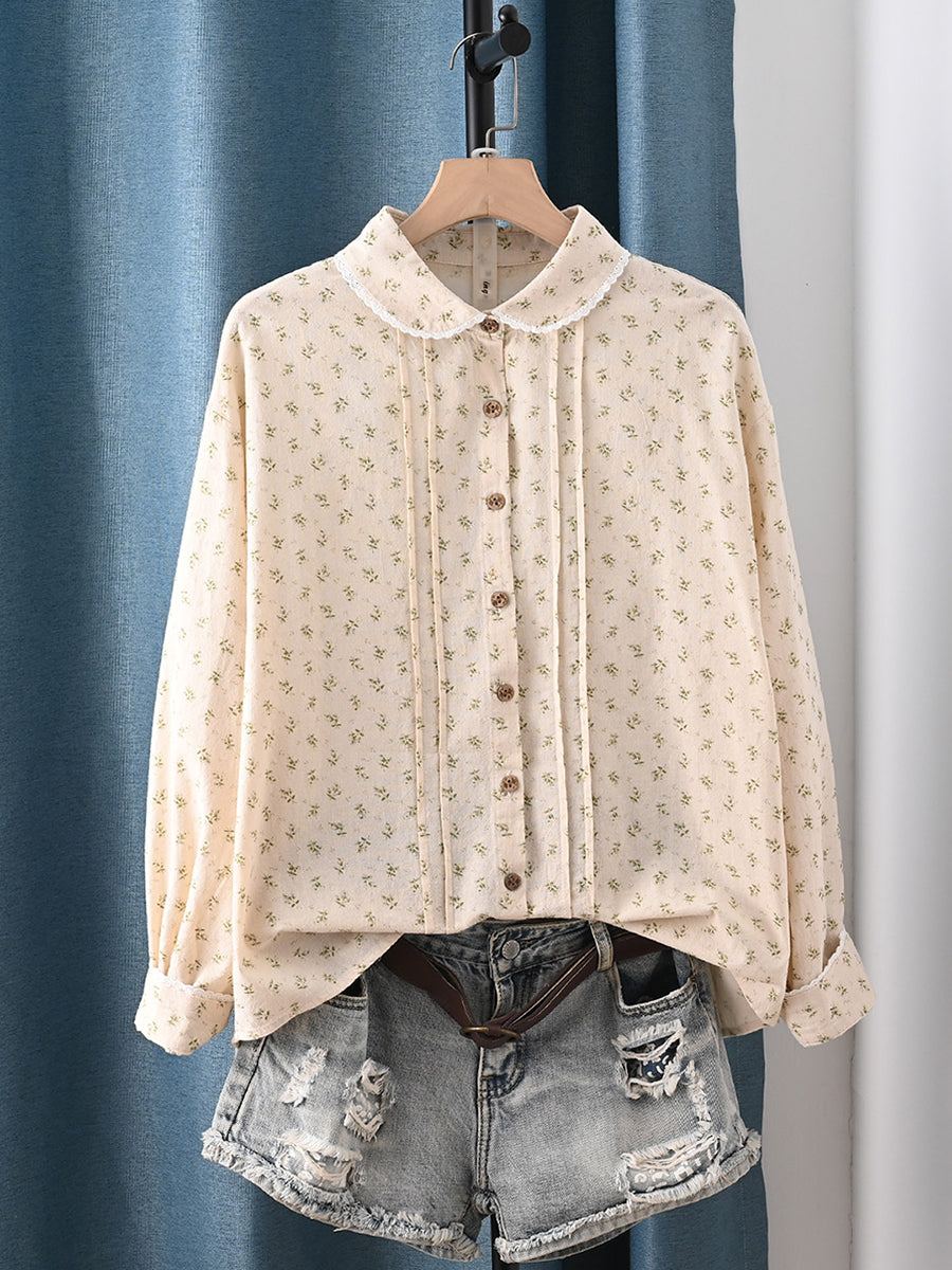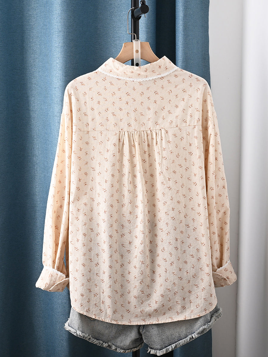 女士春季藝術風花卉圖案100%純棉翻領襯衫