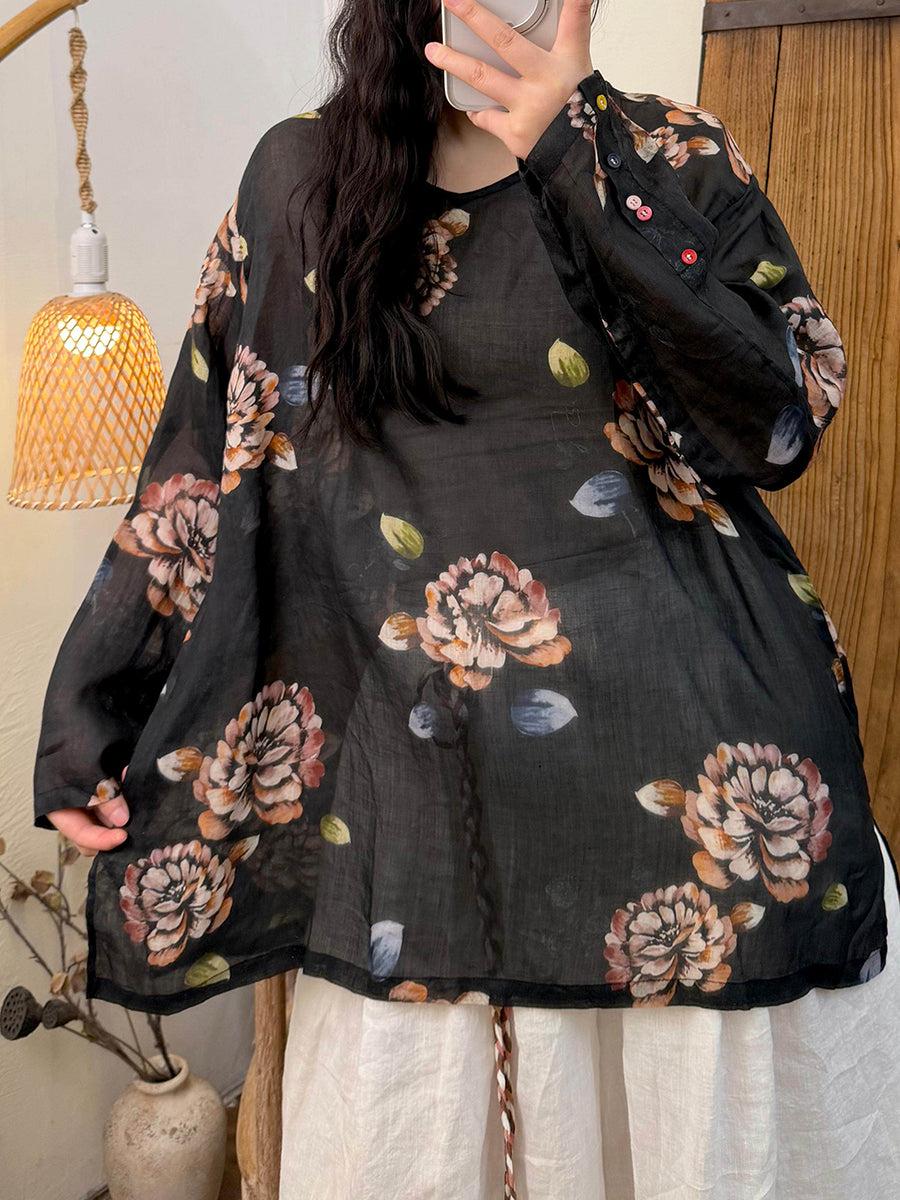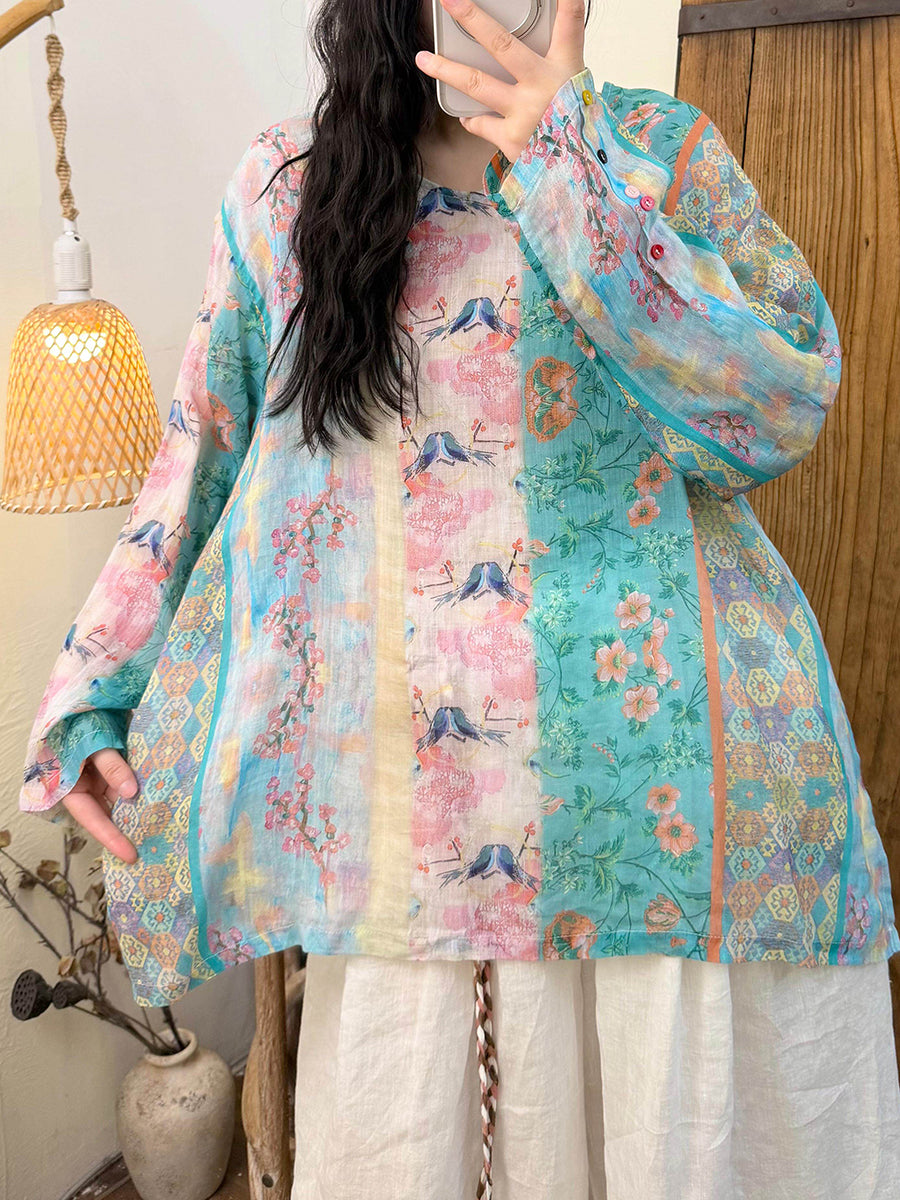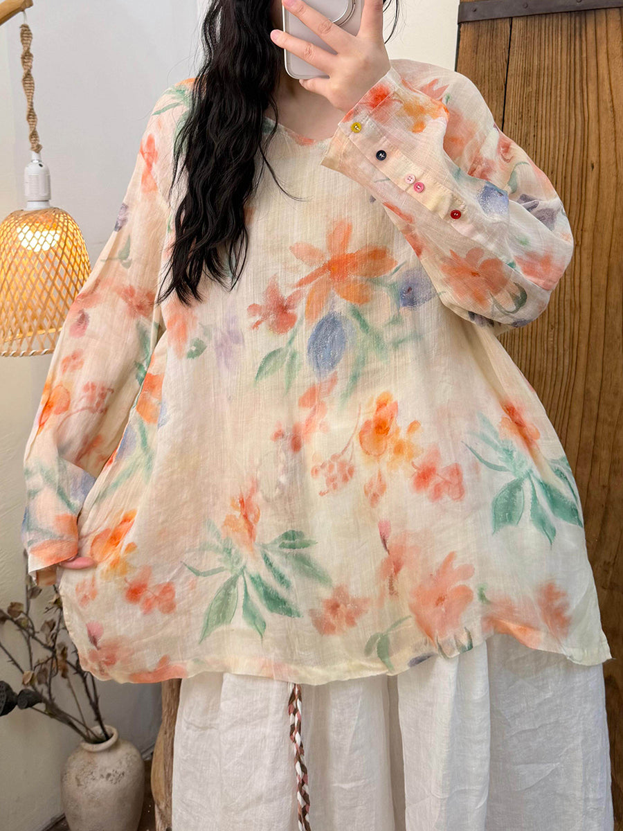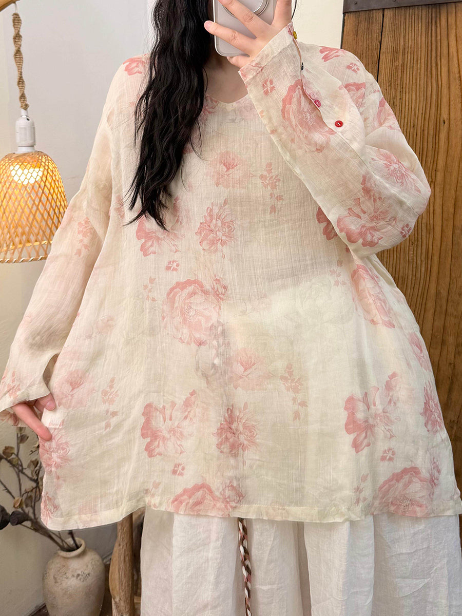 女士春季藝術風花卉V領苧麻襯衫