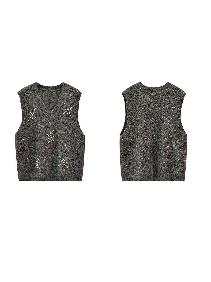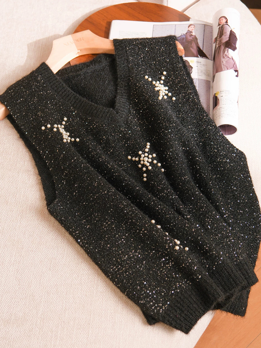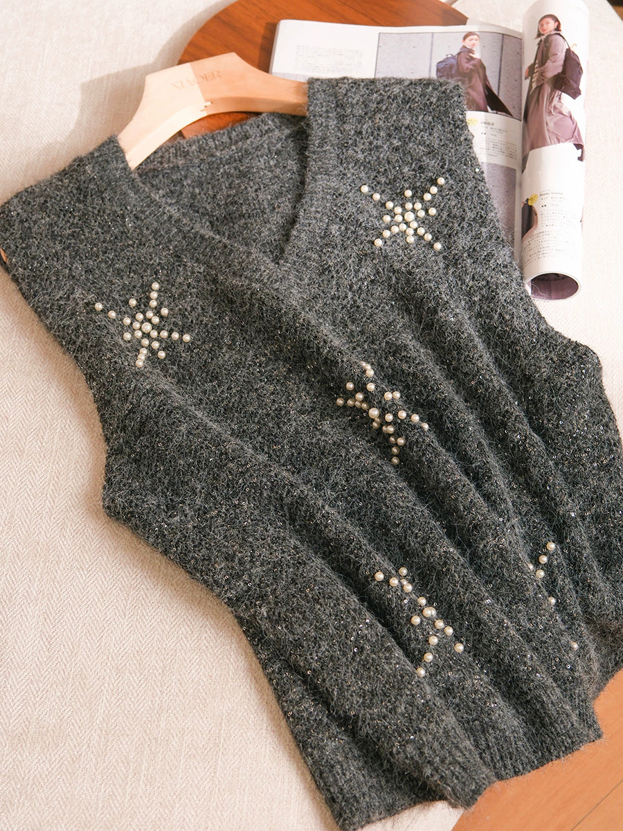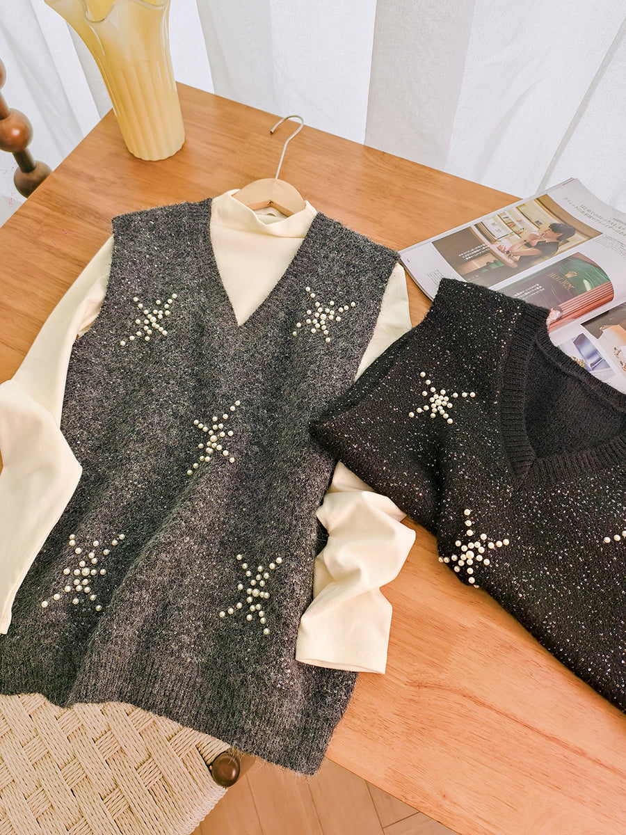 女士春季藝術純色珍珠V領背心