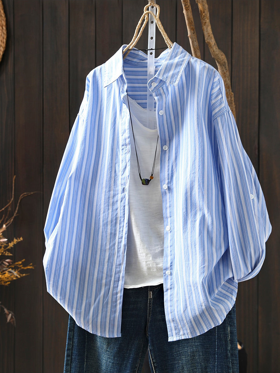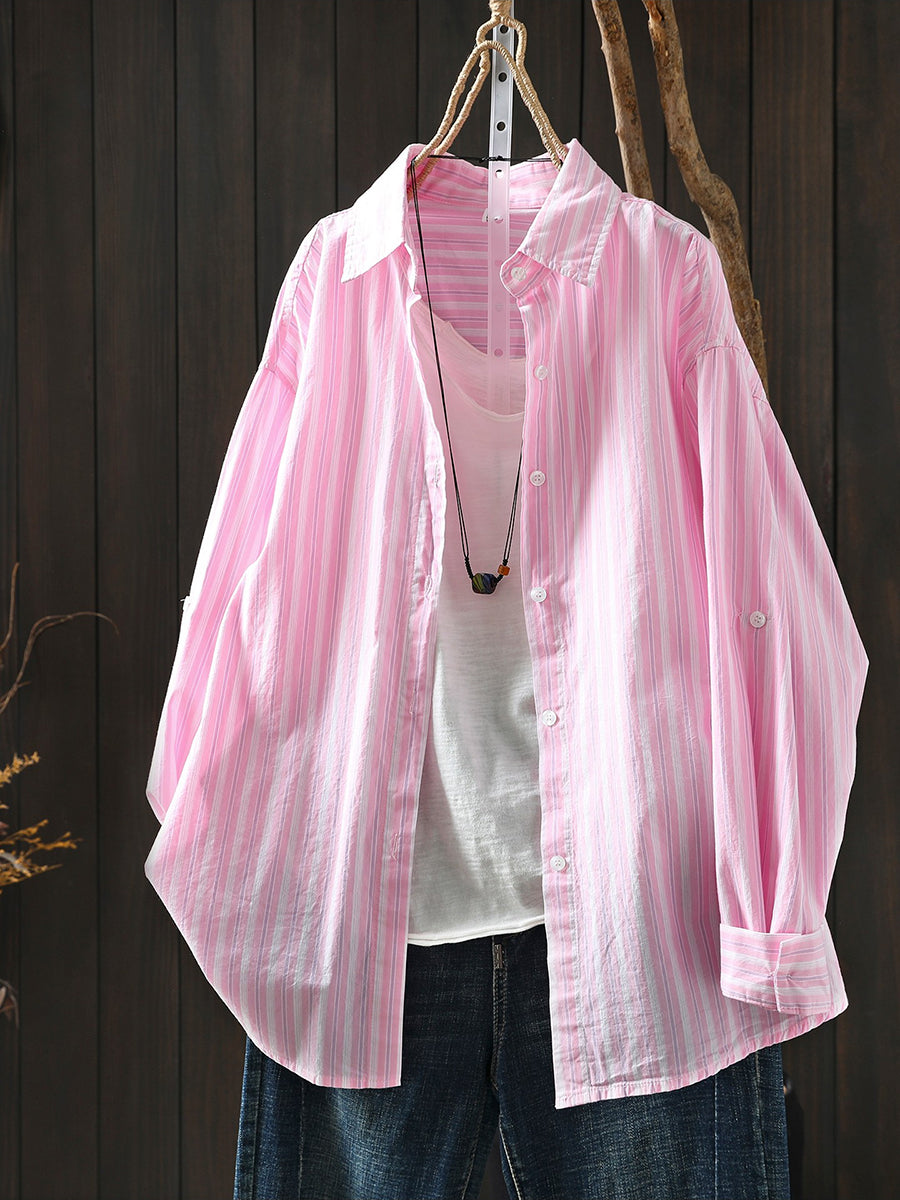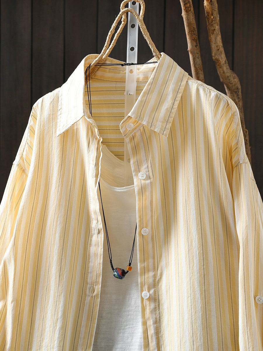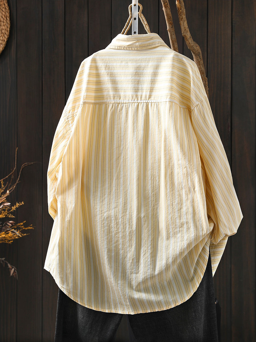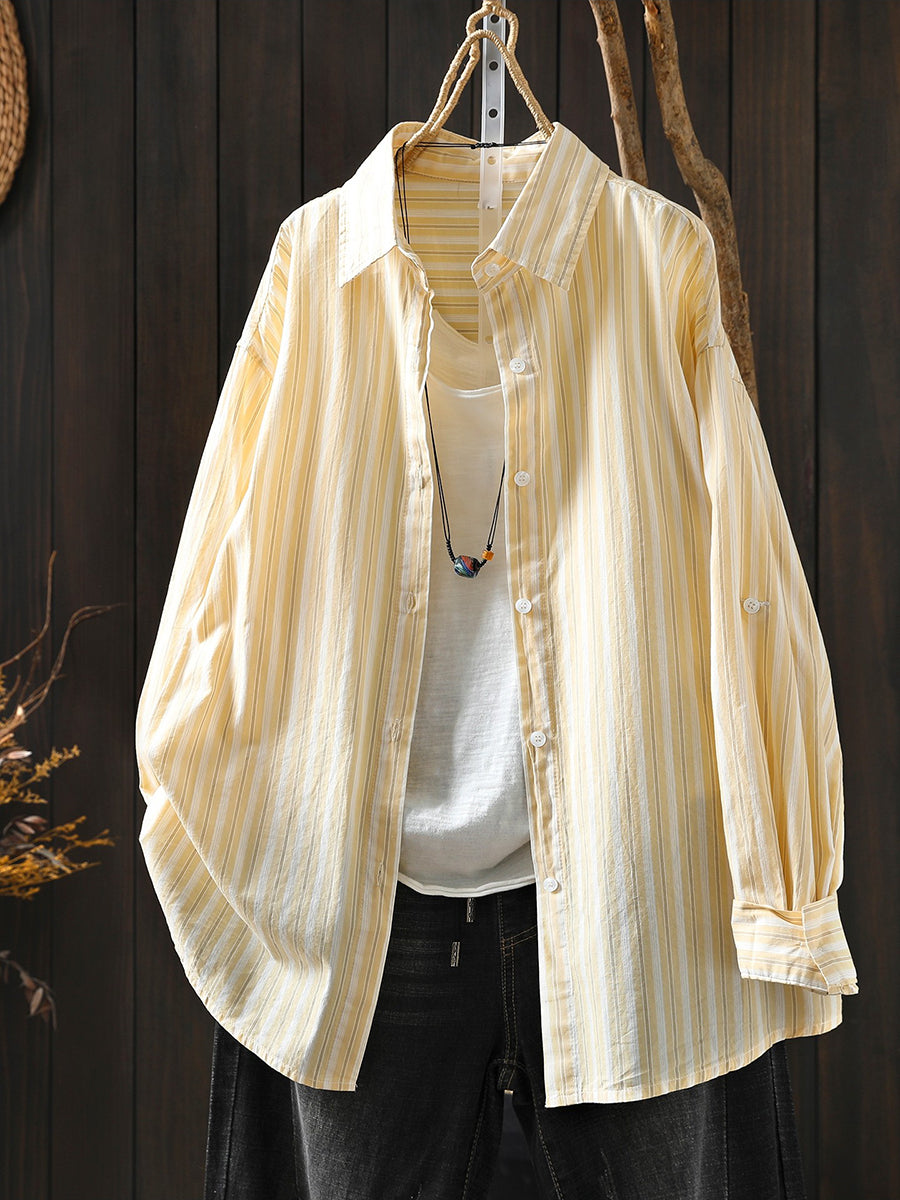 女士春季藝術條紋100%純棉翻領襯衫