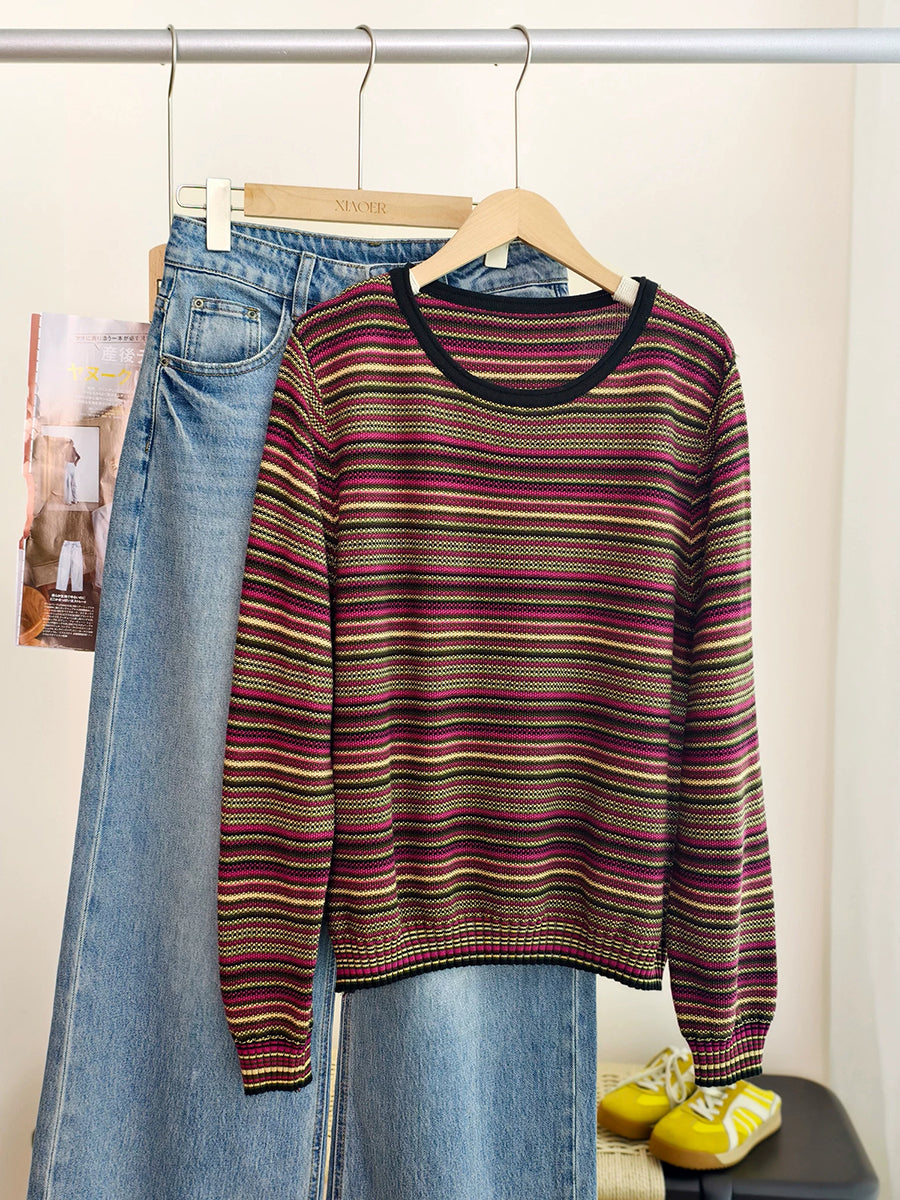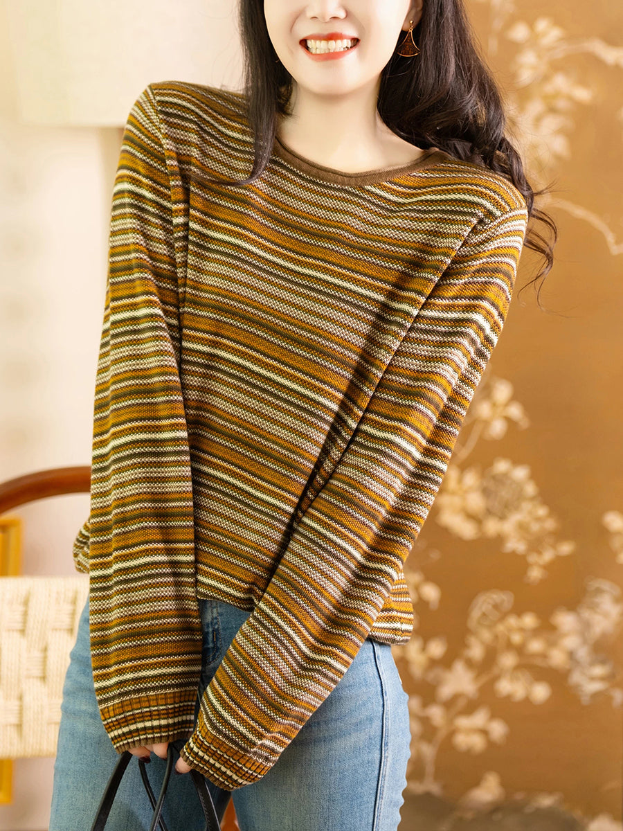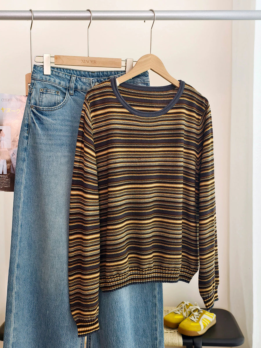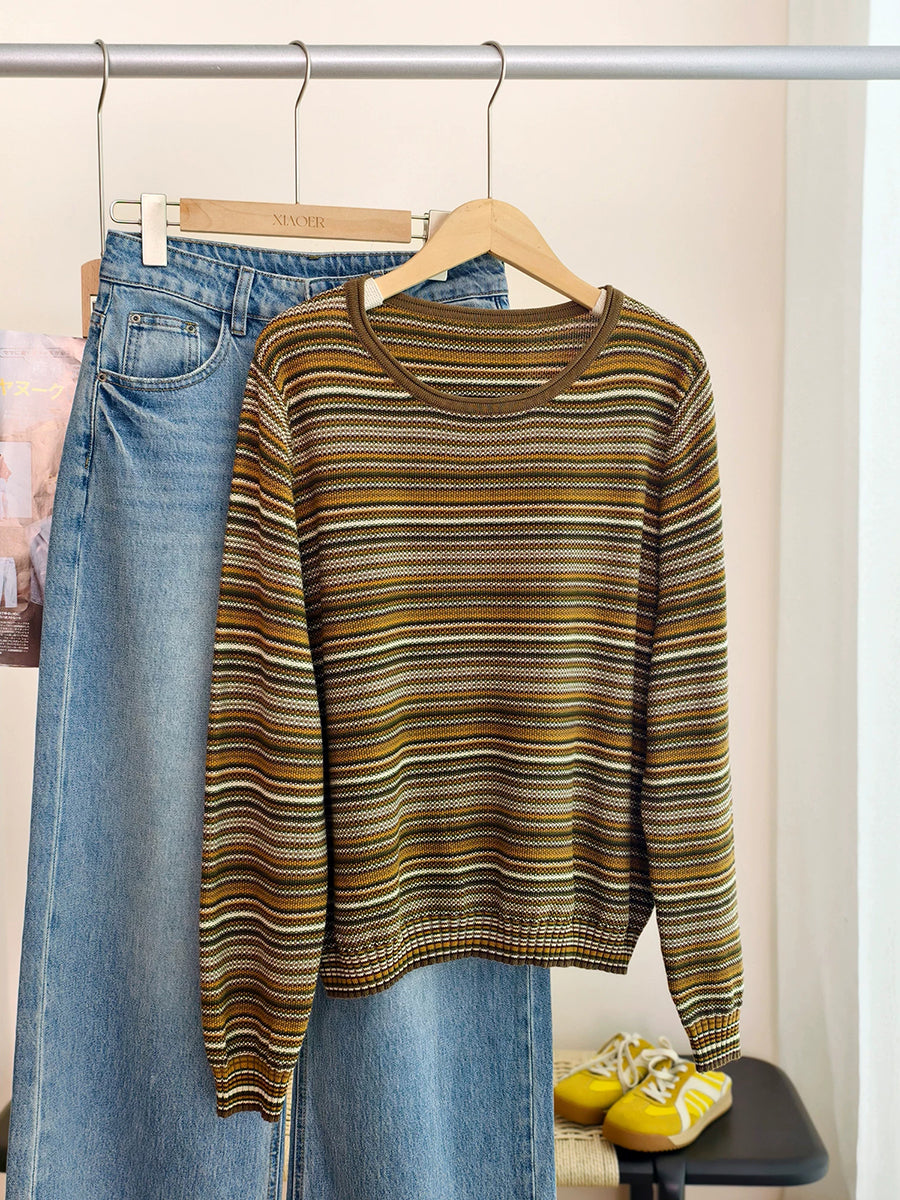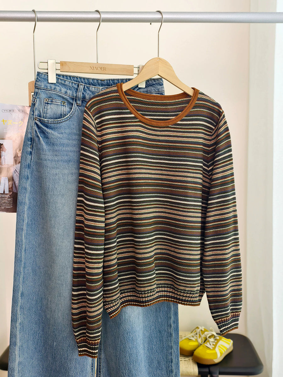 女士春季休閒條紋棉質圓領襯衫