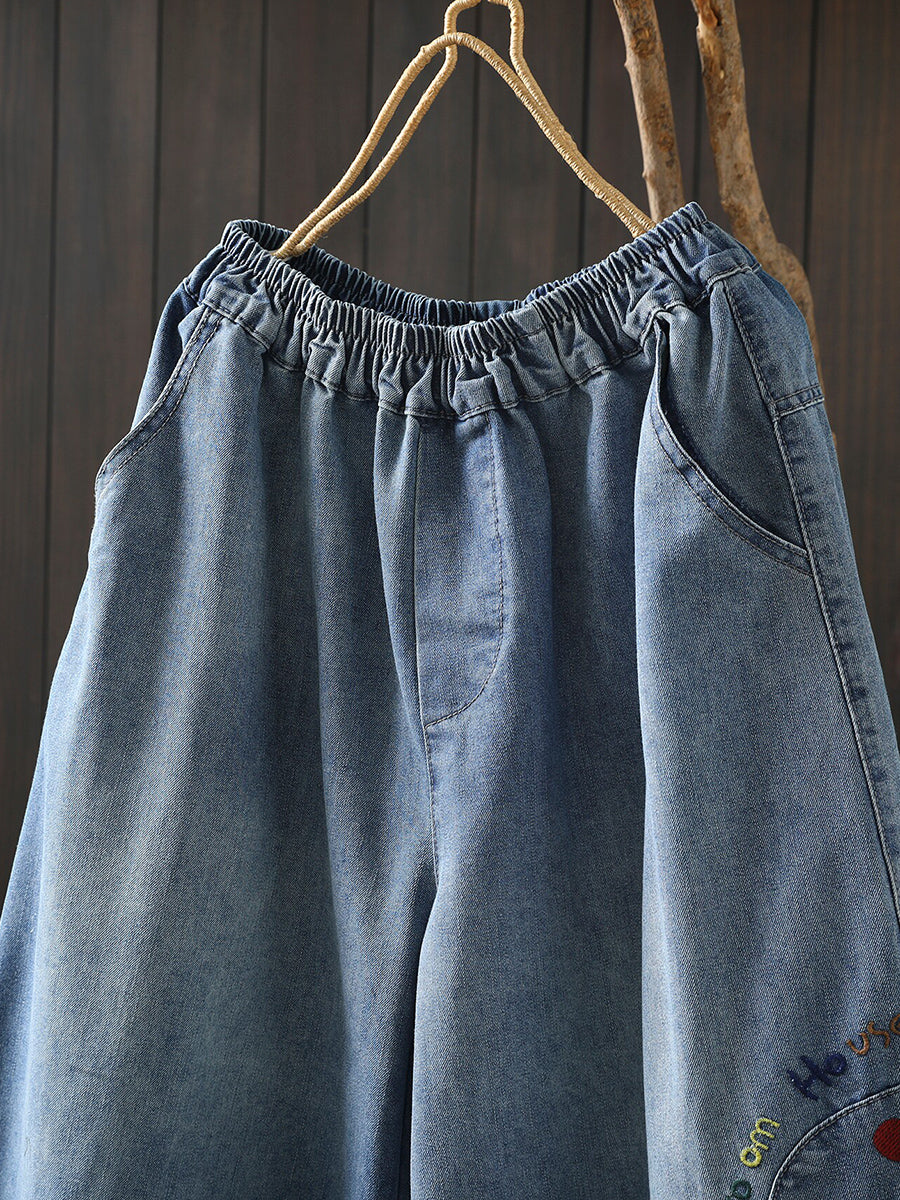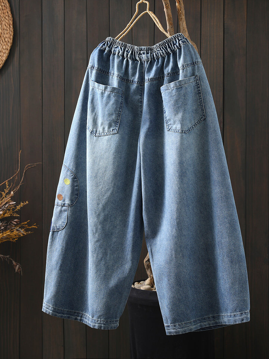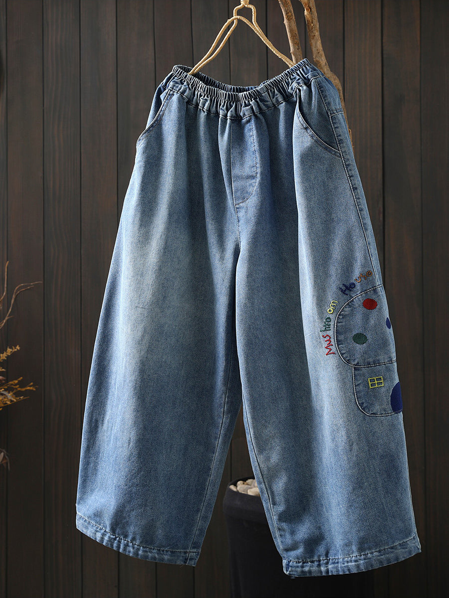 女士春季復古刺繡牛仔闊腿褲