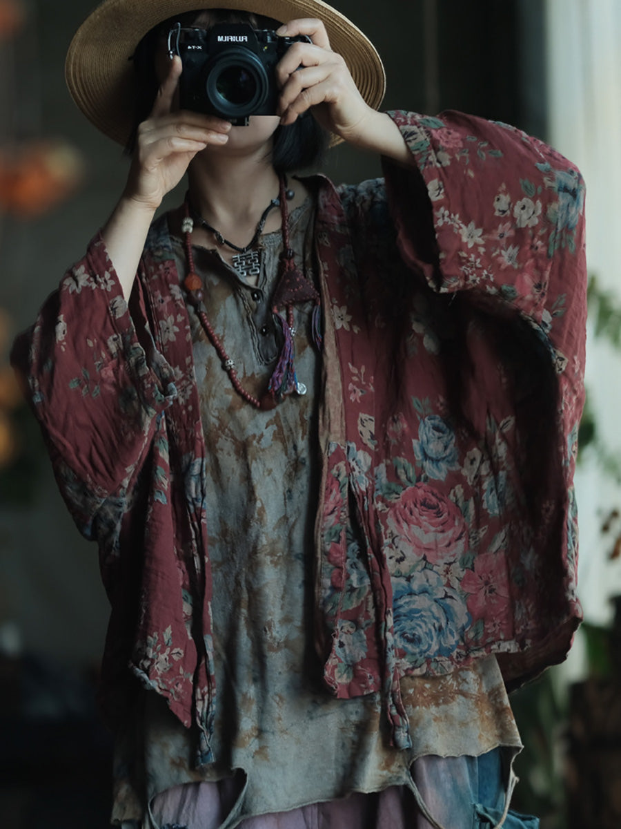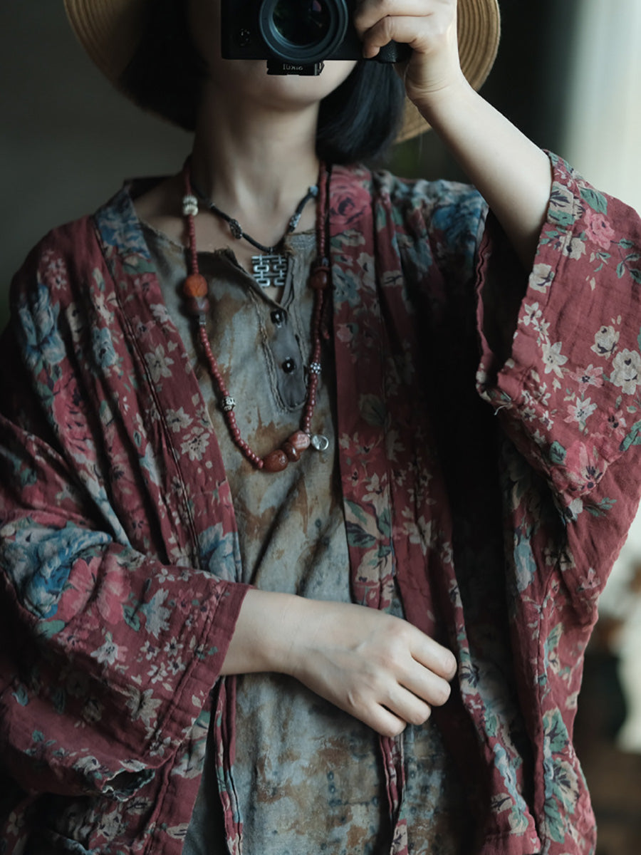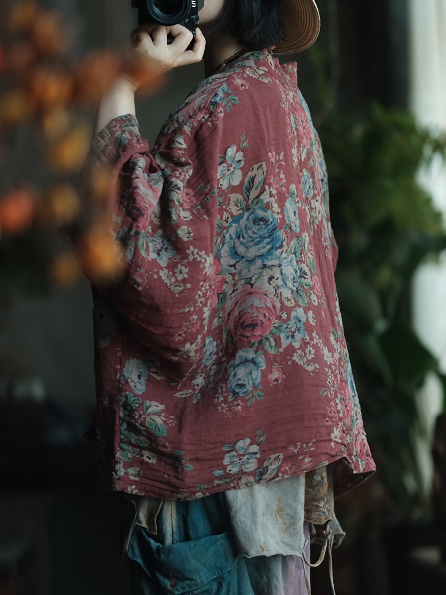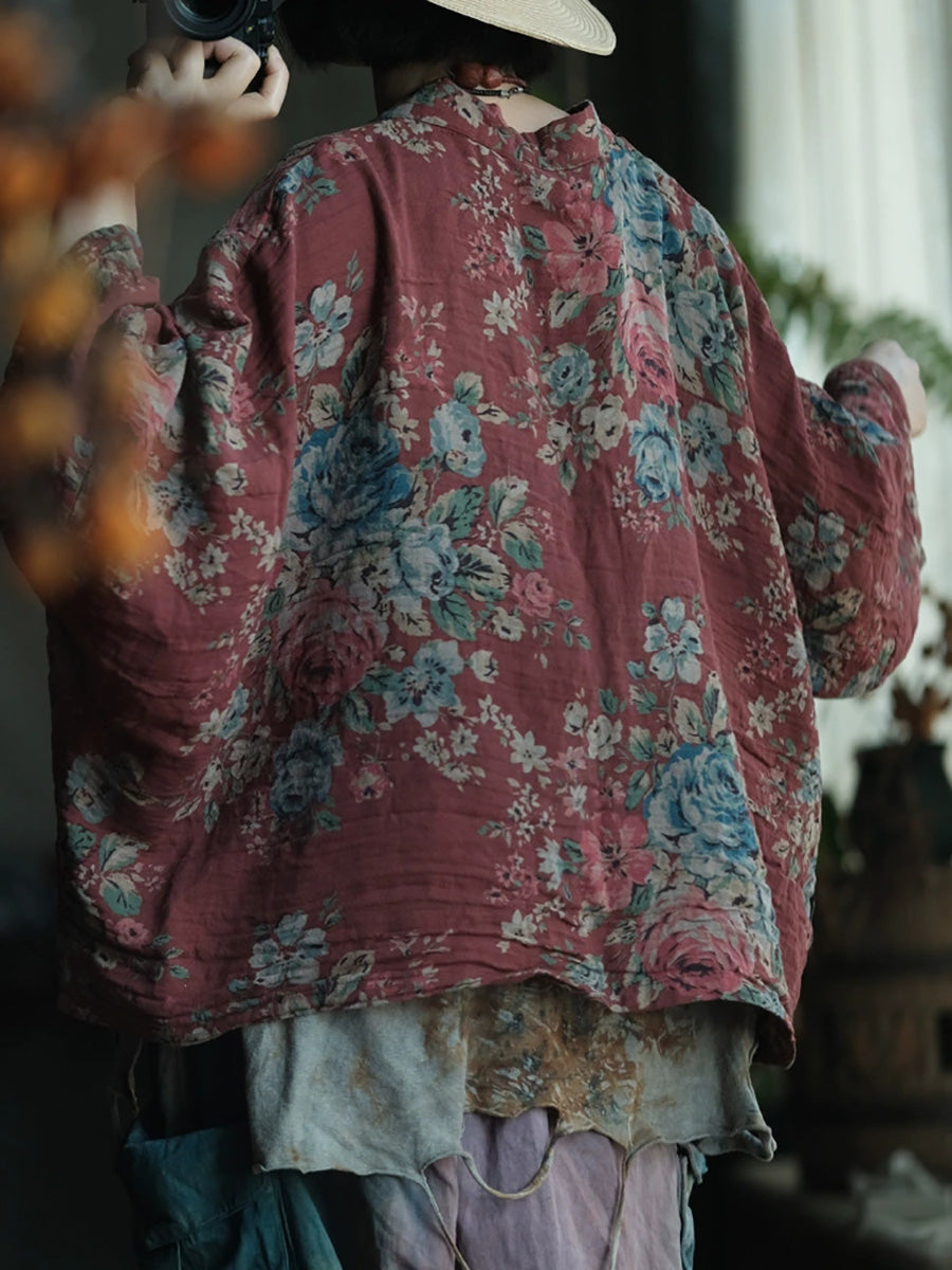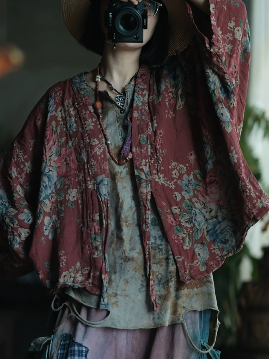 女士春季復古碎花V領棉質襯衫外套