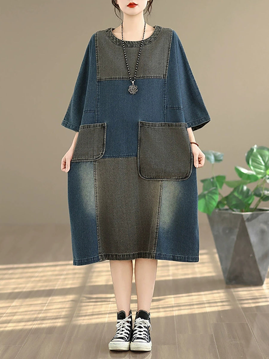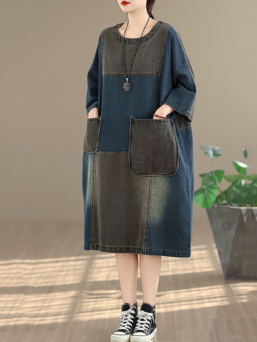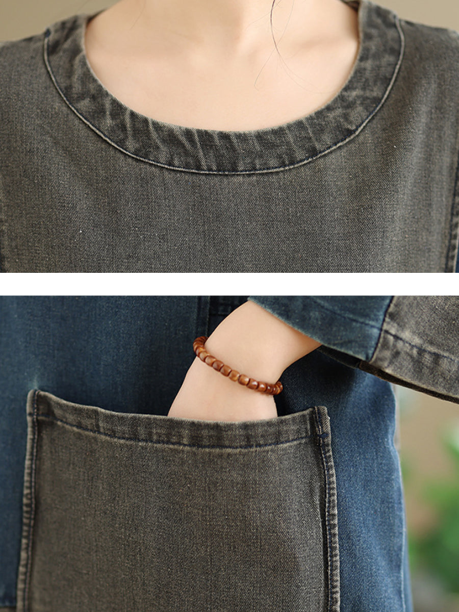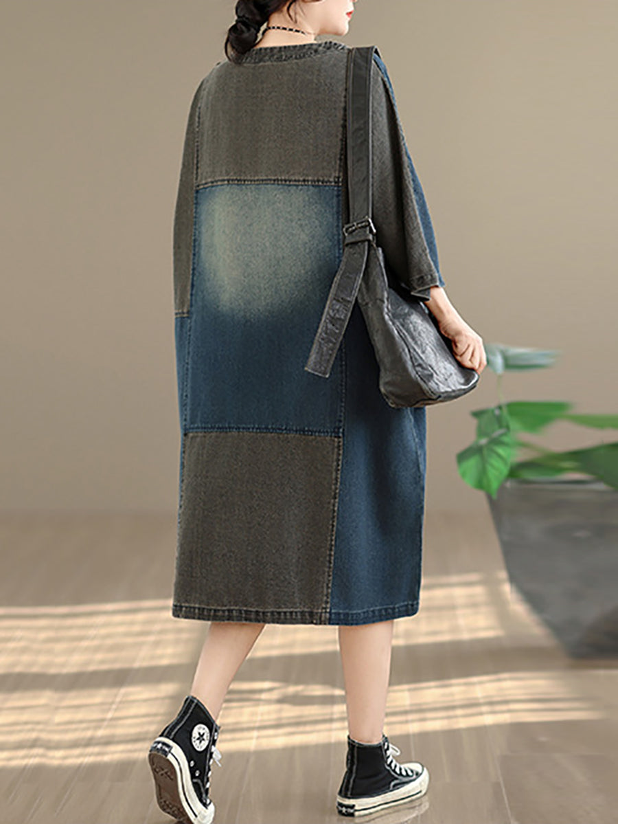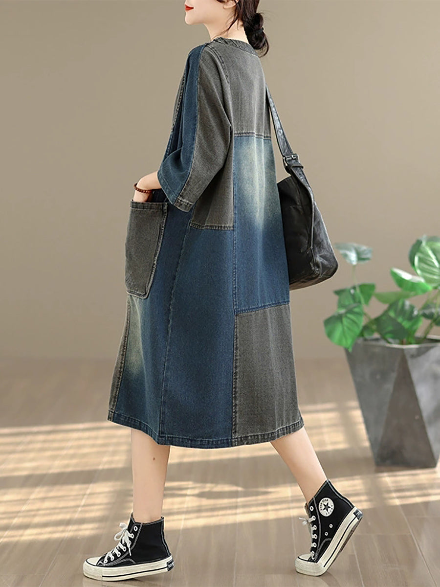 女士春季復古拼接牛仔連身裙