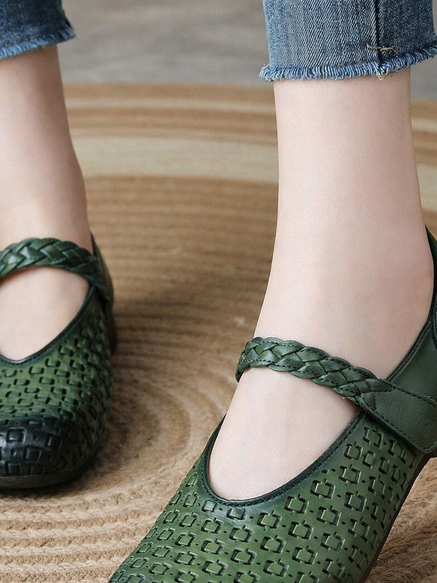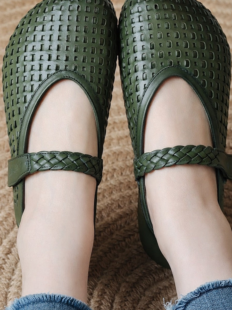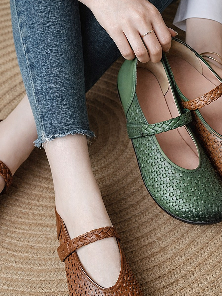 純手工打造的復古瑪莉珍平底鞋,採用真皮全粒面牛皮製成。優雅的鏤空設計與編織鞋帶,展現獨特藝術氣息。柔軟的乳膠鞋墊和柔韌的橡膠鞋底,帶來全天候的舒適穿著體驗。