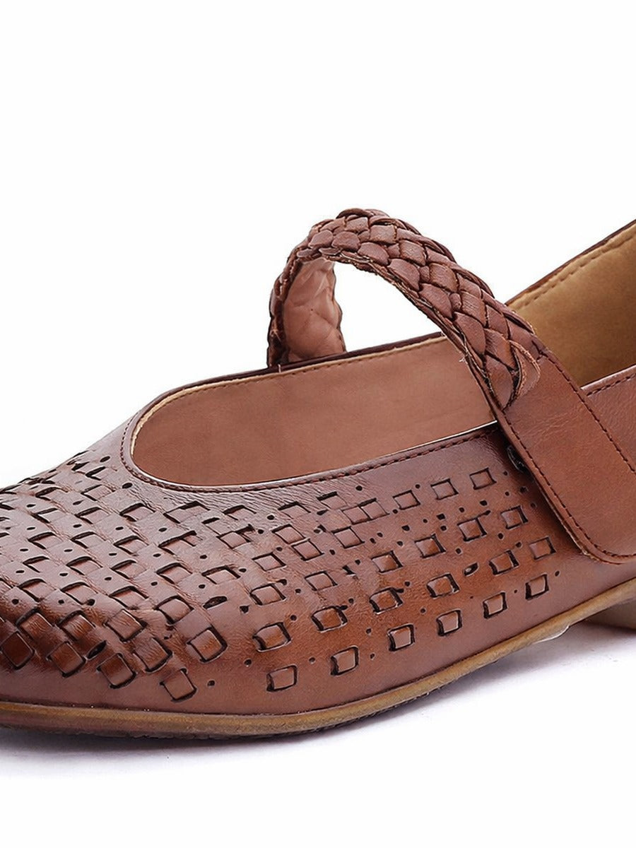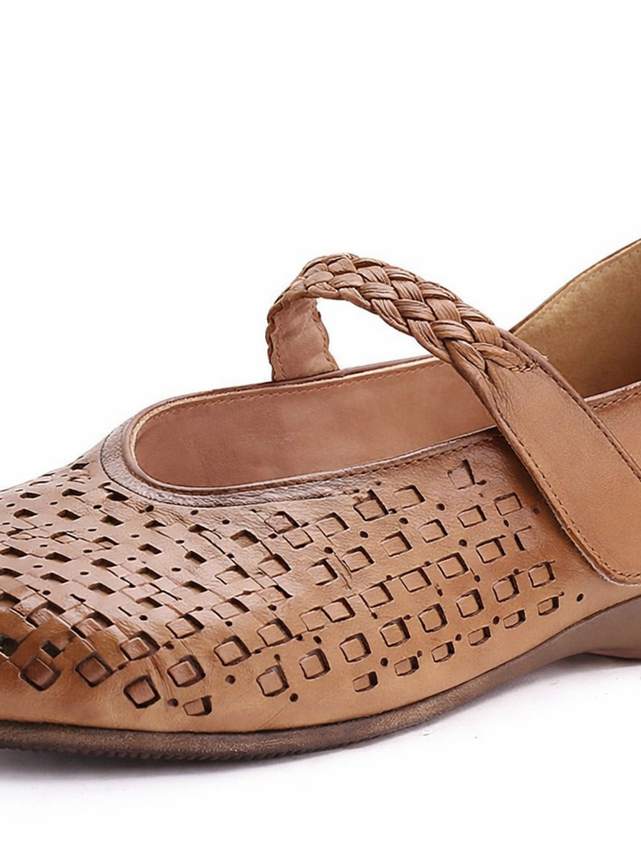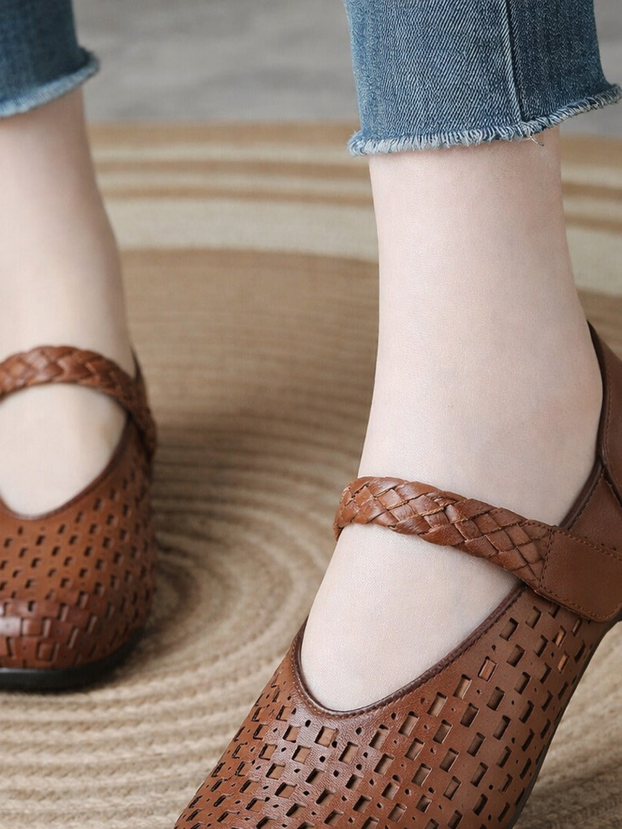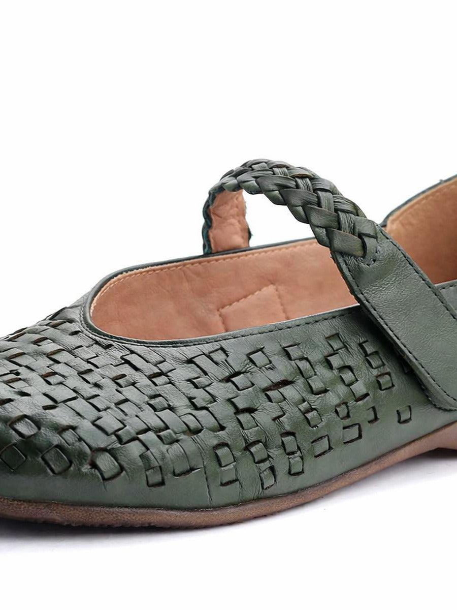 純手工打造的復古瑪莉珍平底鞋,採用真皮全粒面牛皮製成。優雅的鏤空設計與編織鞋帶,展現獨特藝術氣息。柔軟的乳膠鞋墊和柔韌的橡膠鞋底,帶來全天候的舒適穿著體驗。