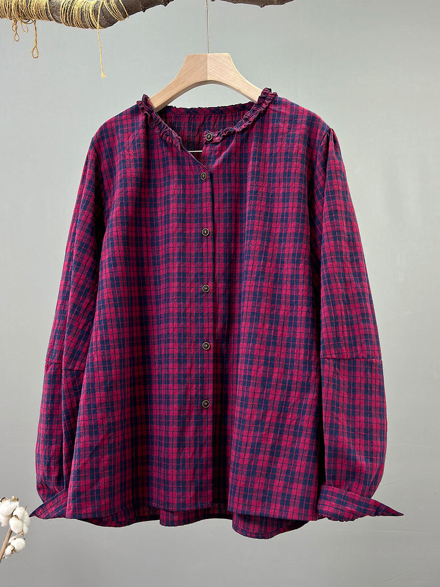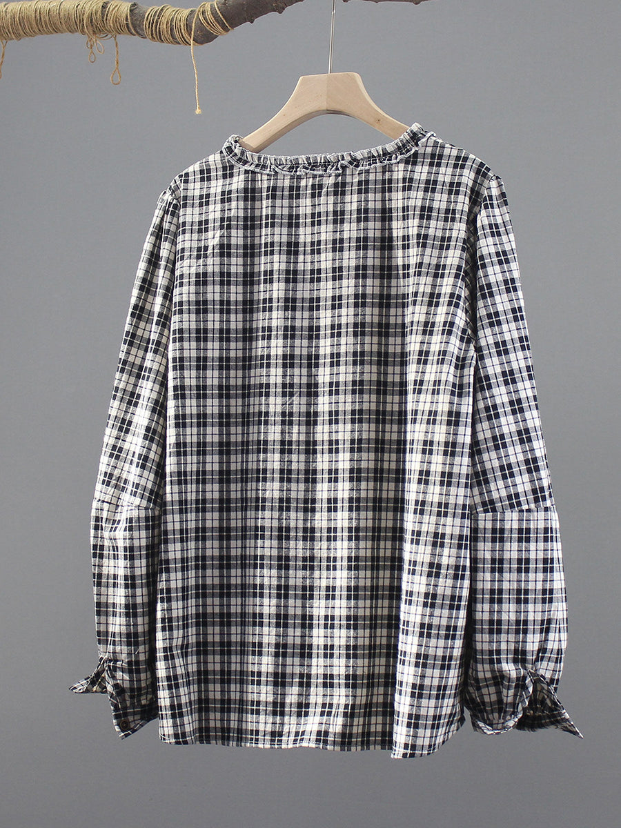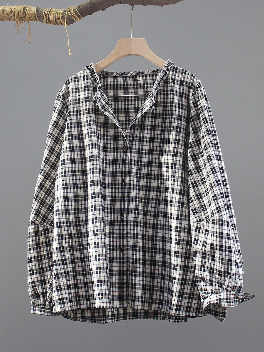女士春季復古格紋V領100%純棉襯衫
