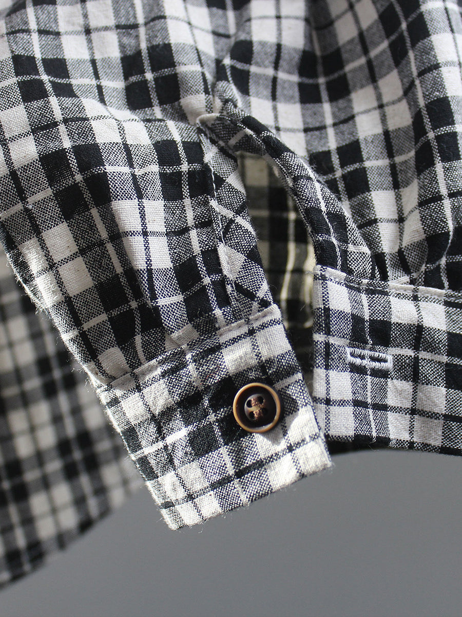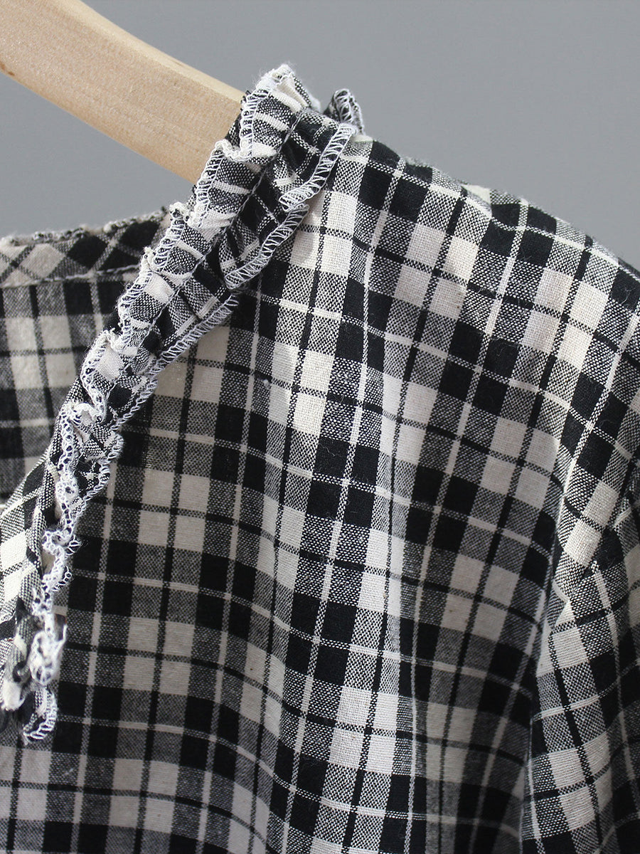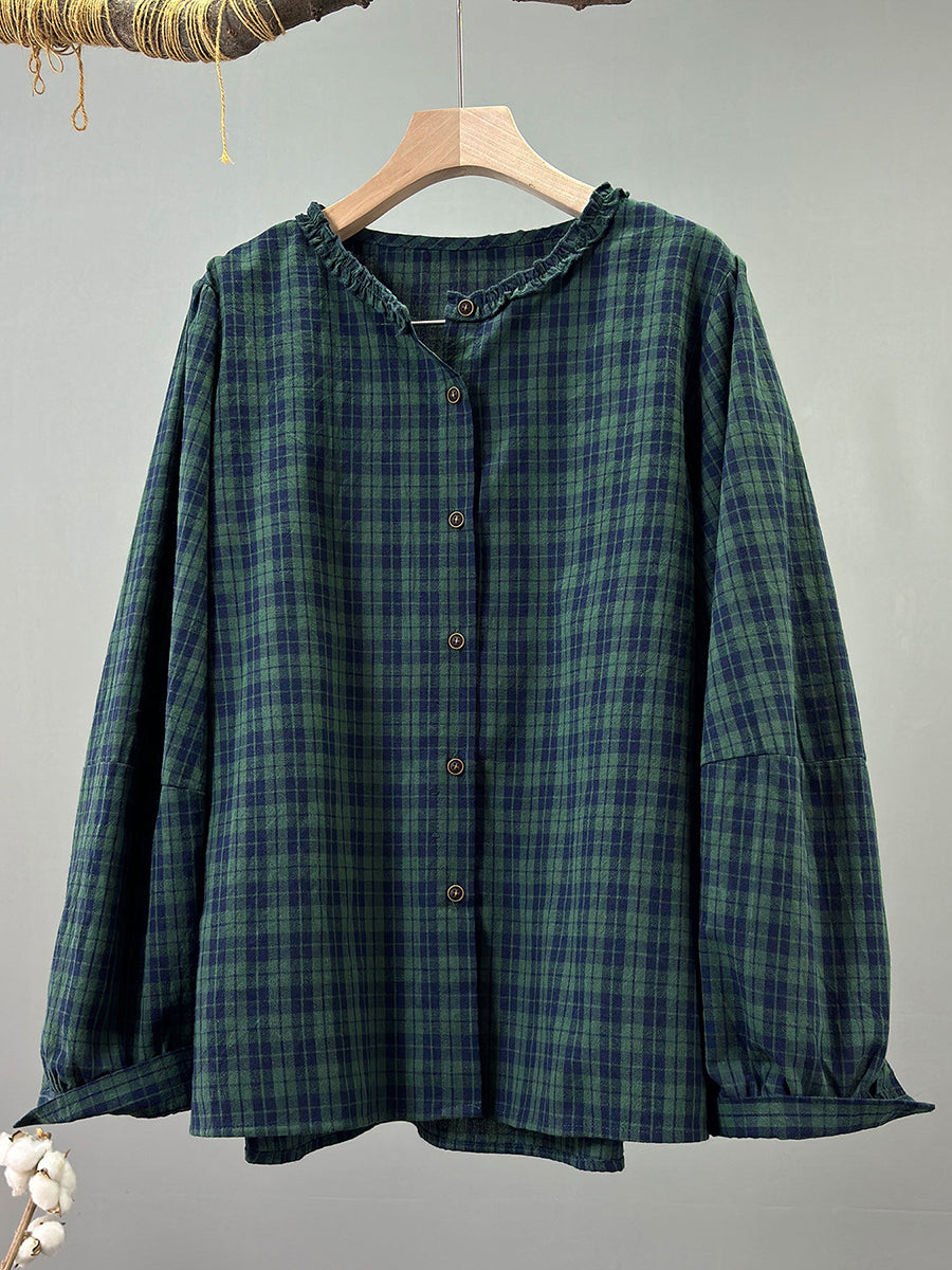 女士春季復古格紋V領100%純棉襯衫