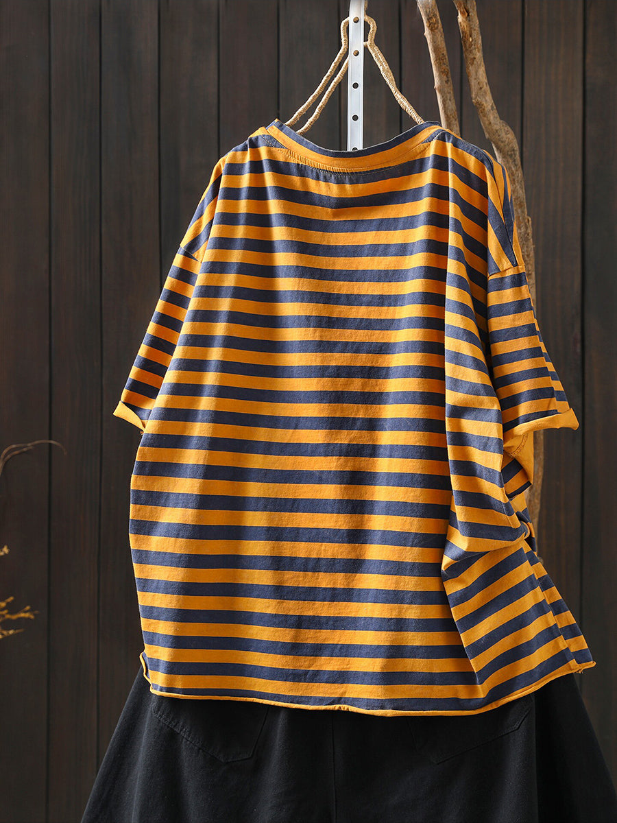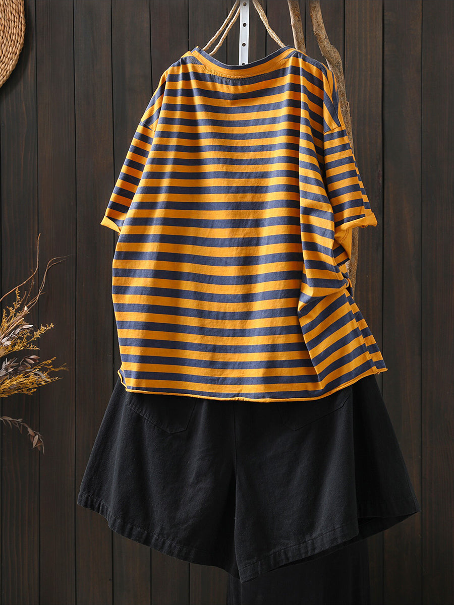 女士夏季藝術棉條紋圓領襯衫