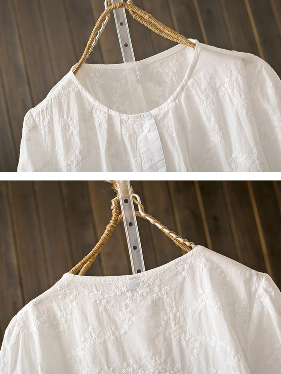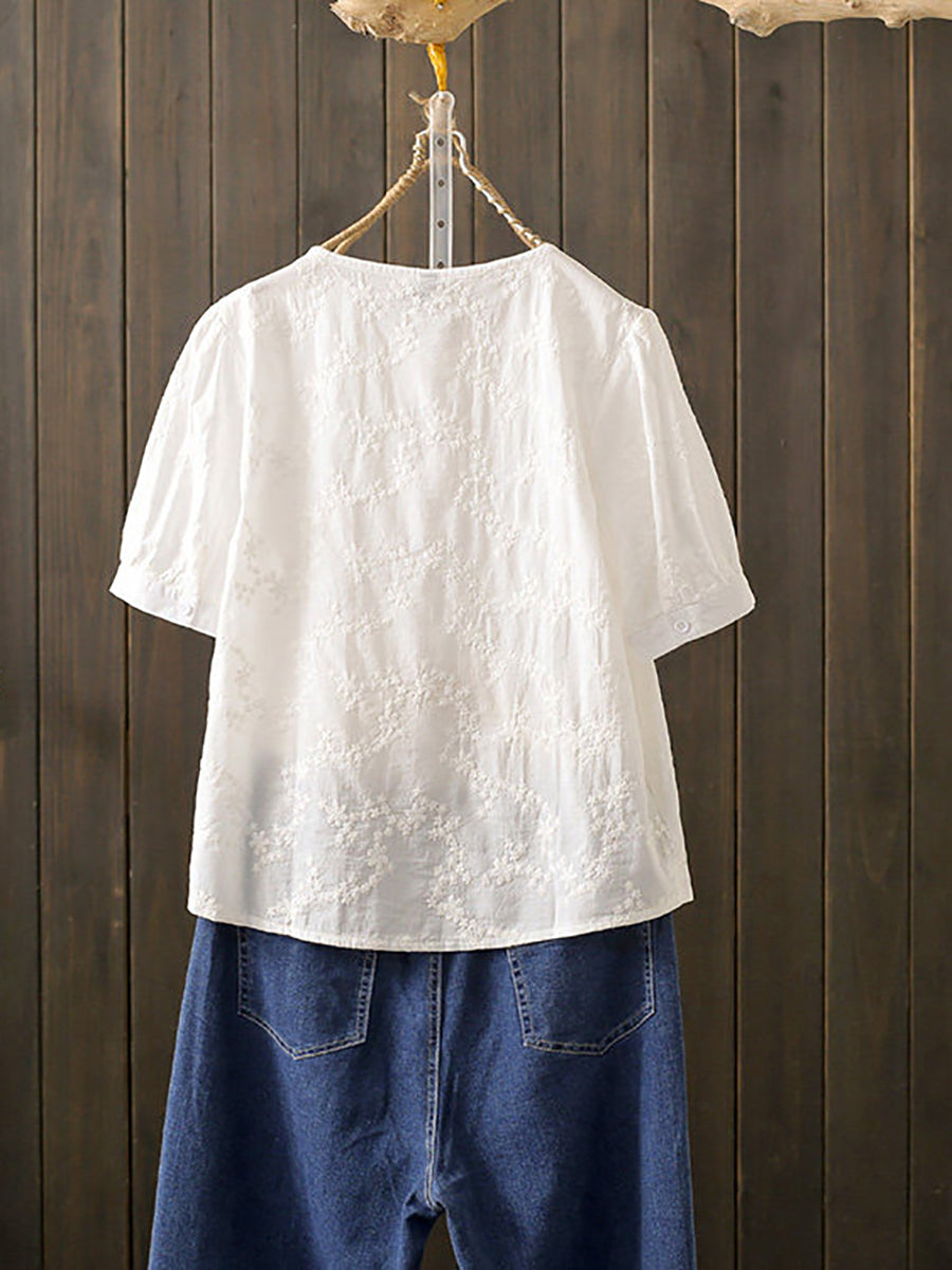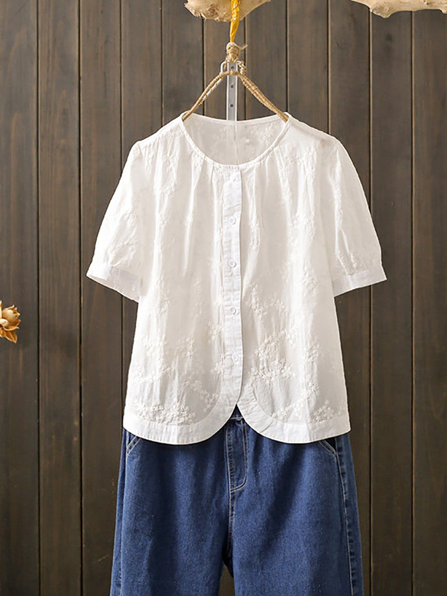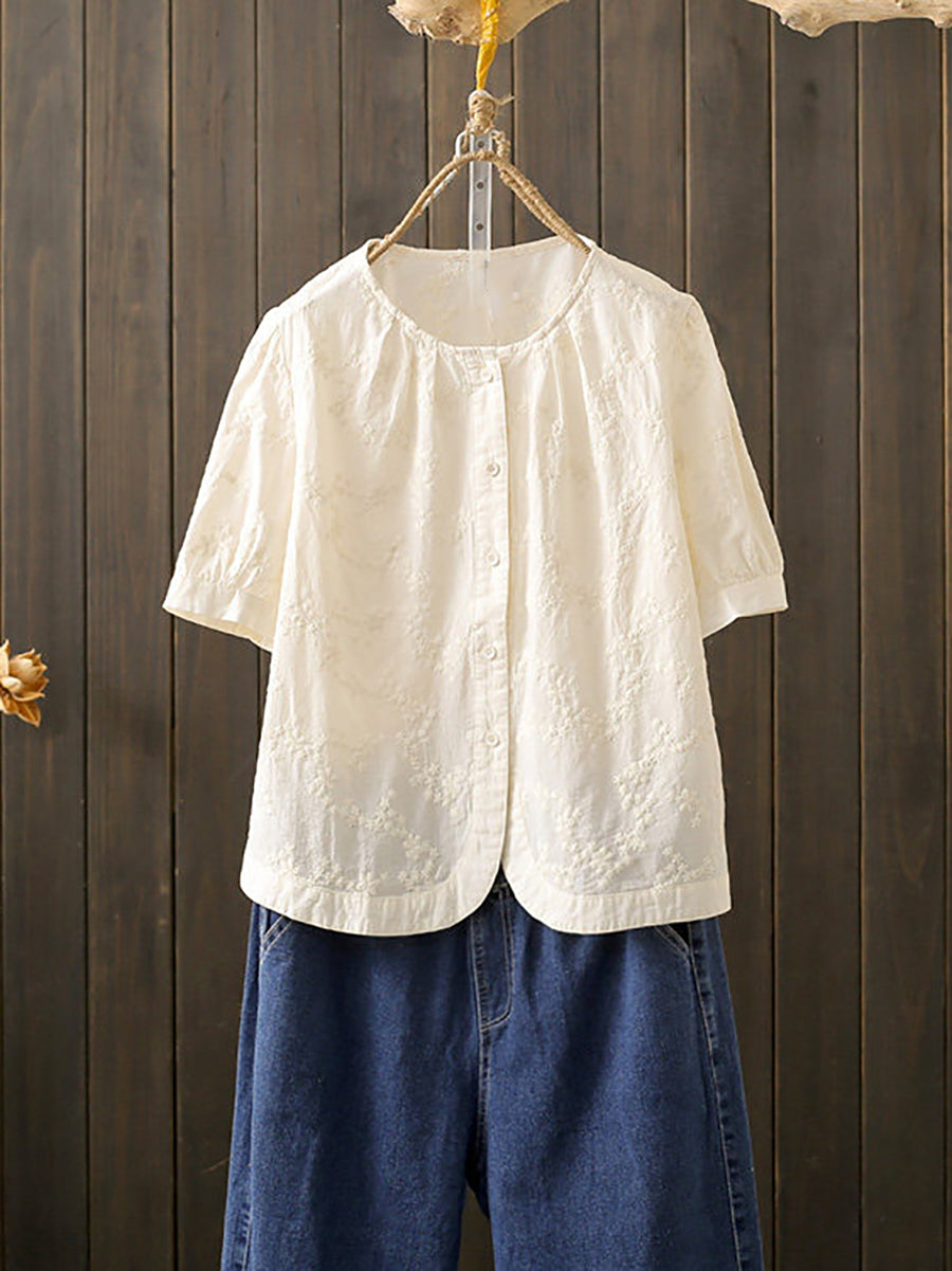 女士夏季藝術刺繡100%純棉圓領襯衫