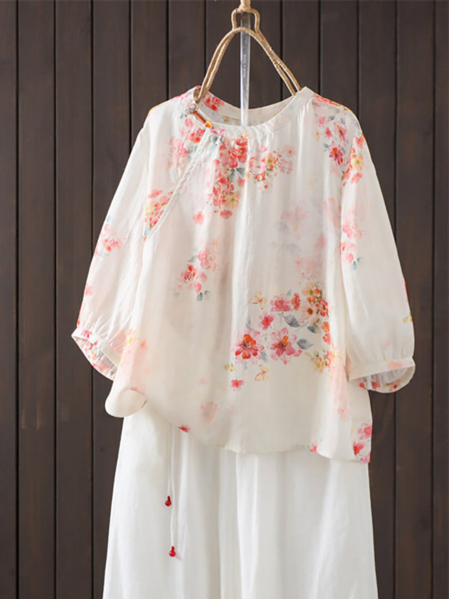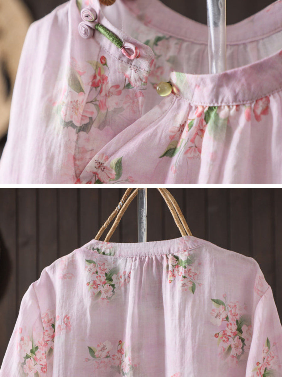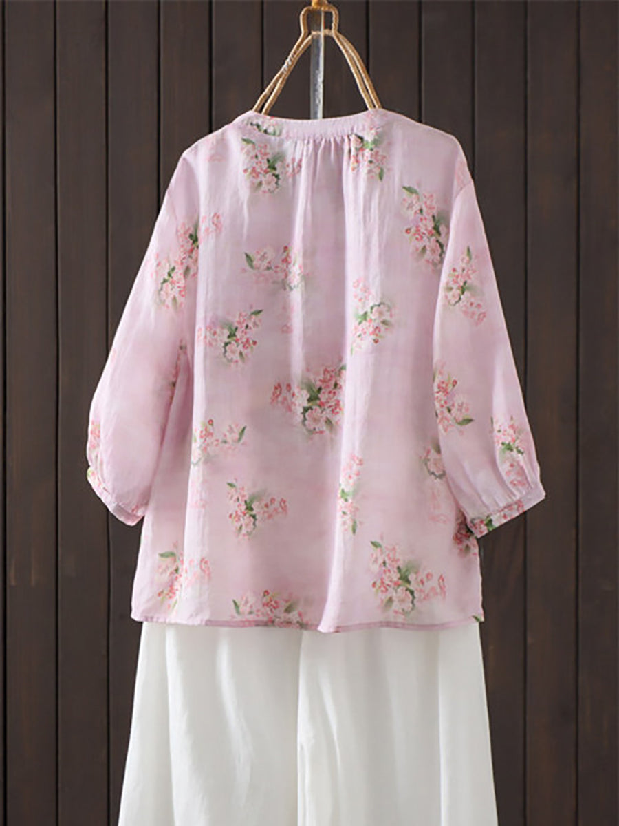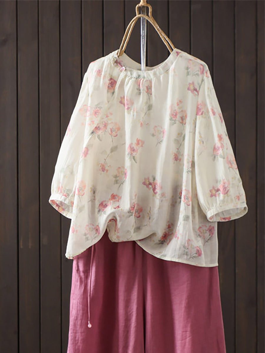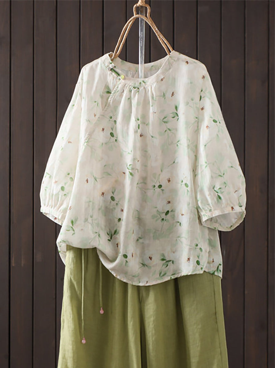 女士夏季藝術風花朵圓領100%苧麻襯衫