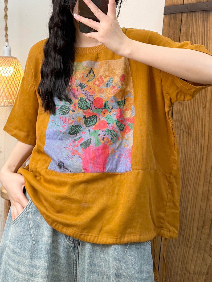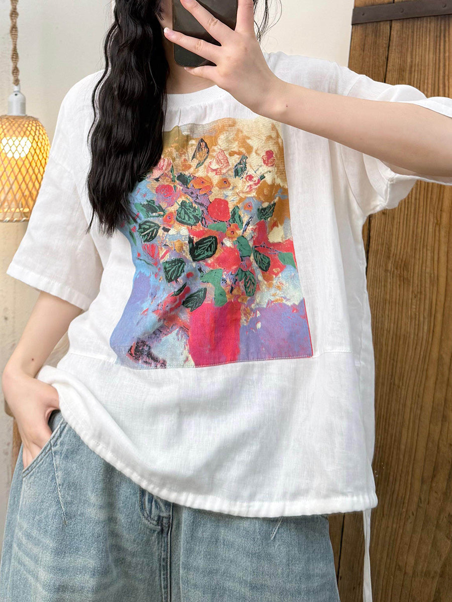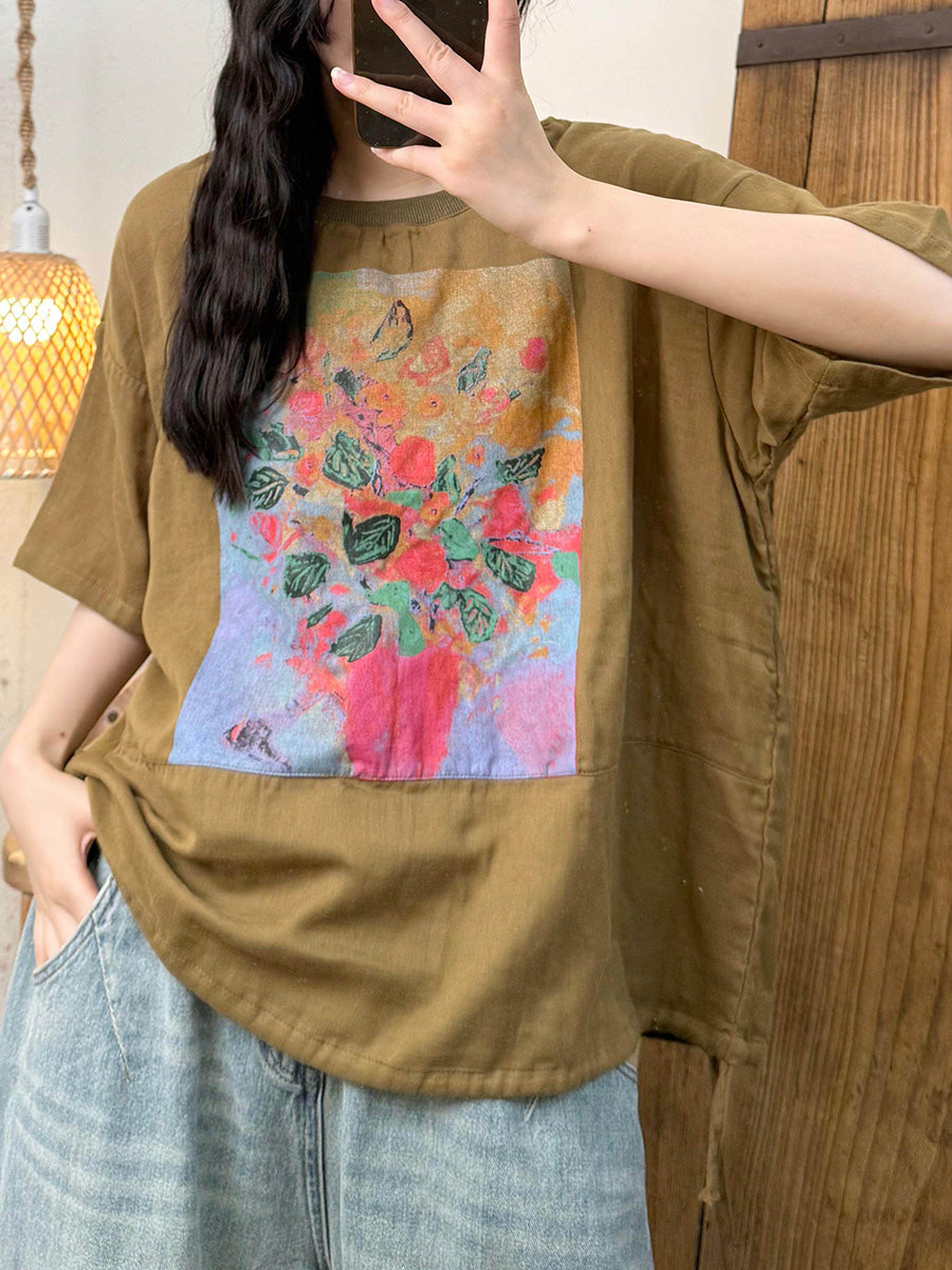 女士夏季藝術風花朵圓領襯衫