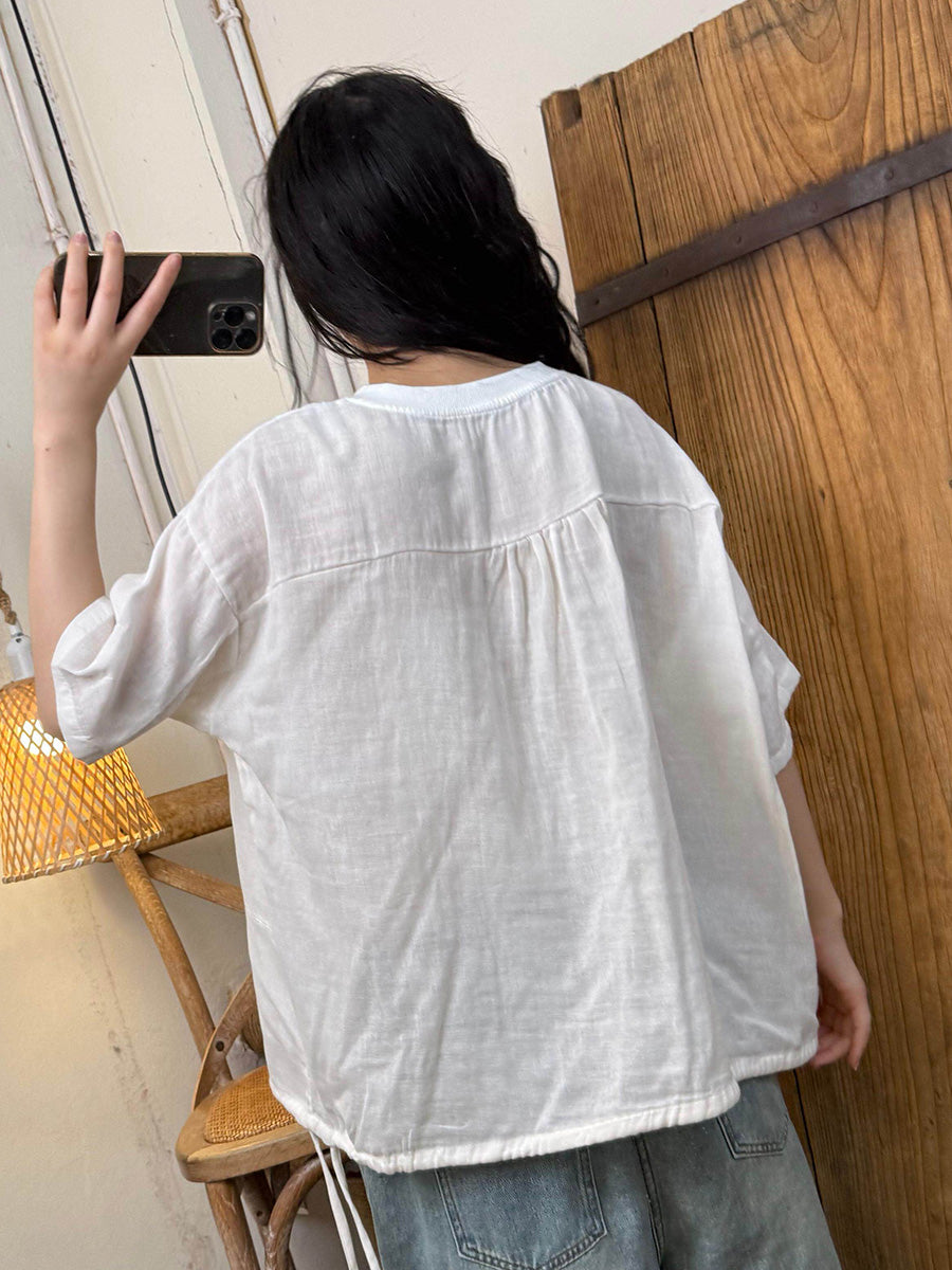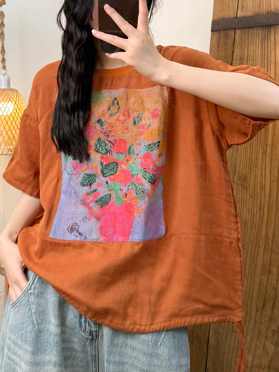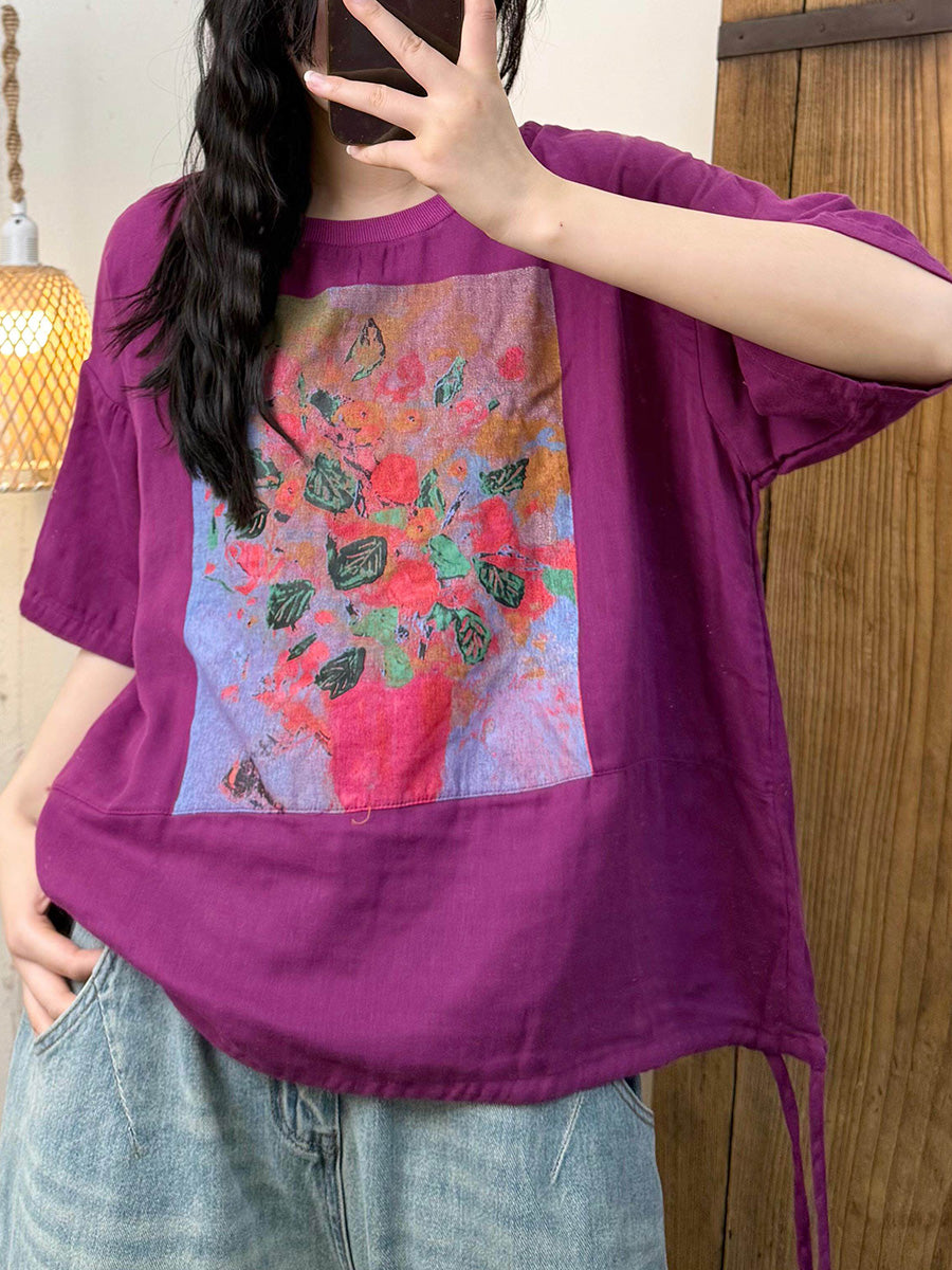 女士夏季藝術風花朵圓領襯衫