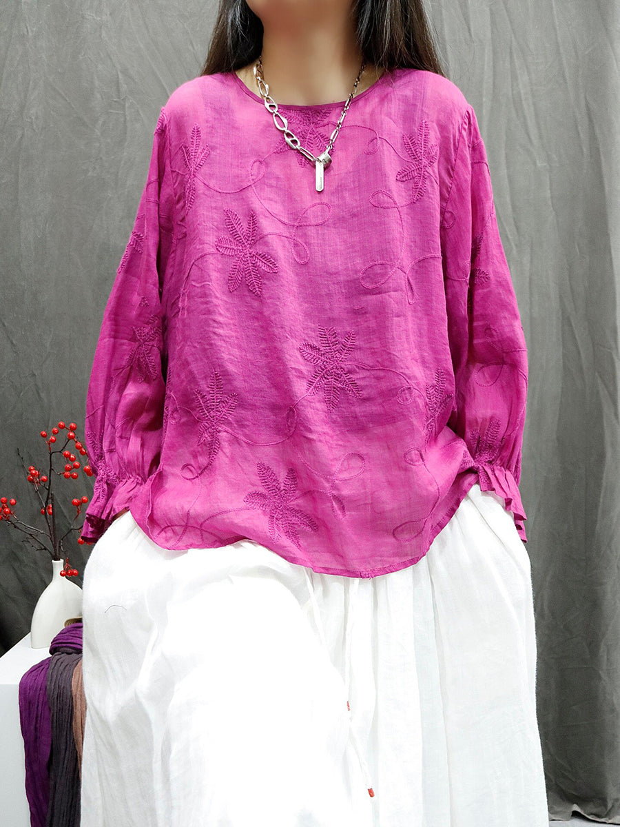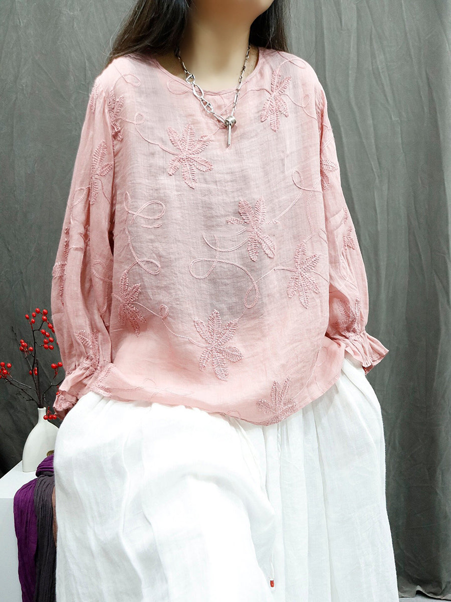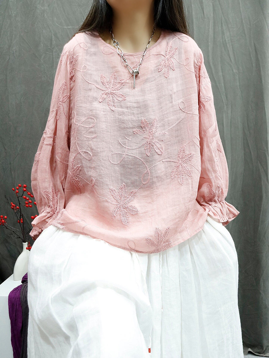 女士夏季藝術風圓領刺繡100%苧麻襯衫