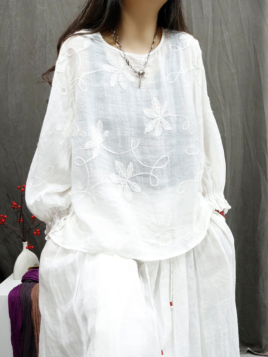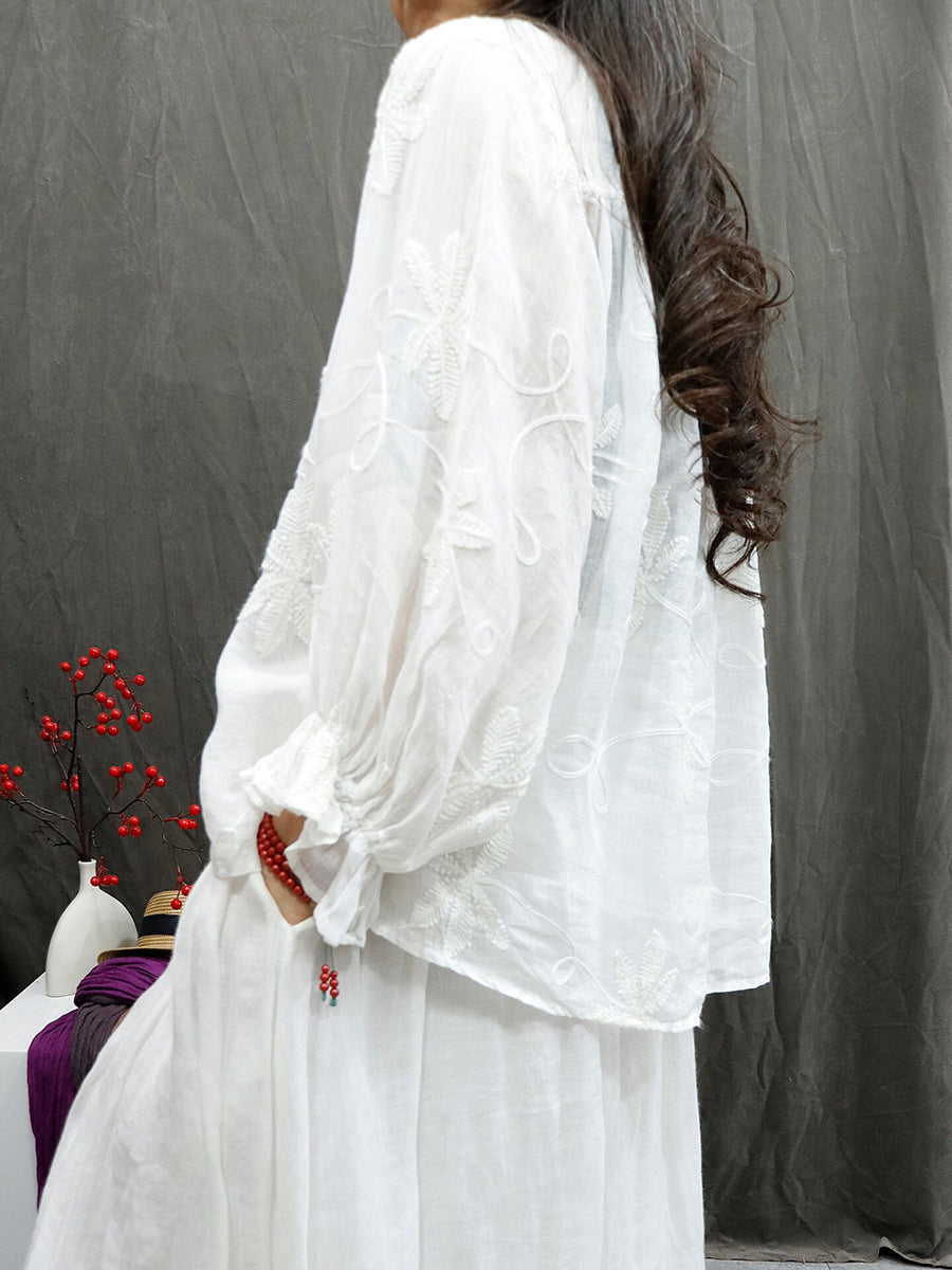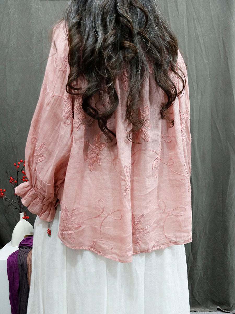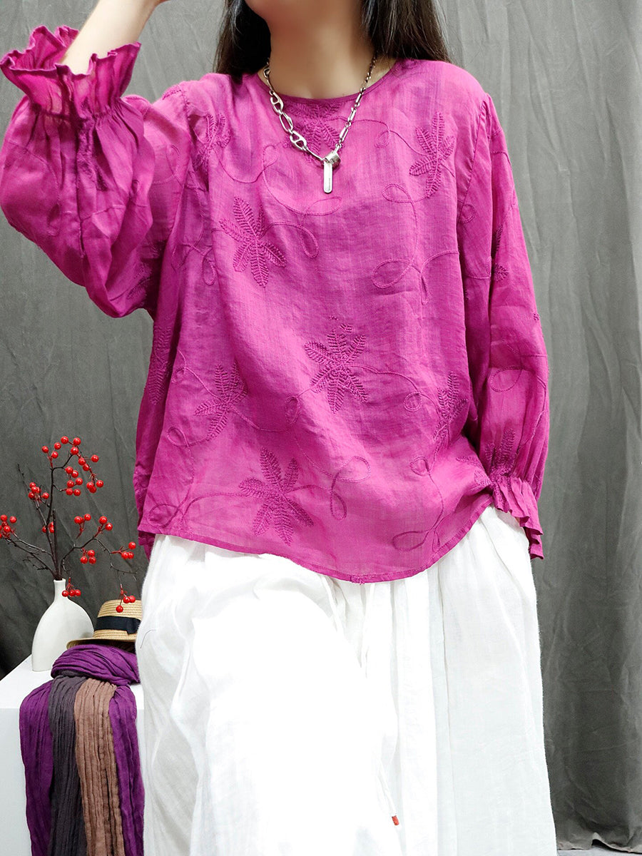女士夏季藝術風圓領刺繡100%苧麻襯衫