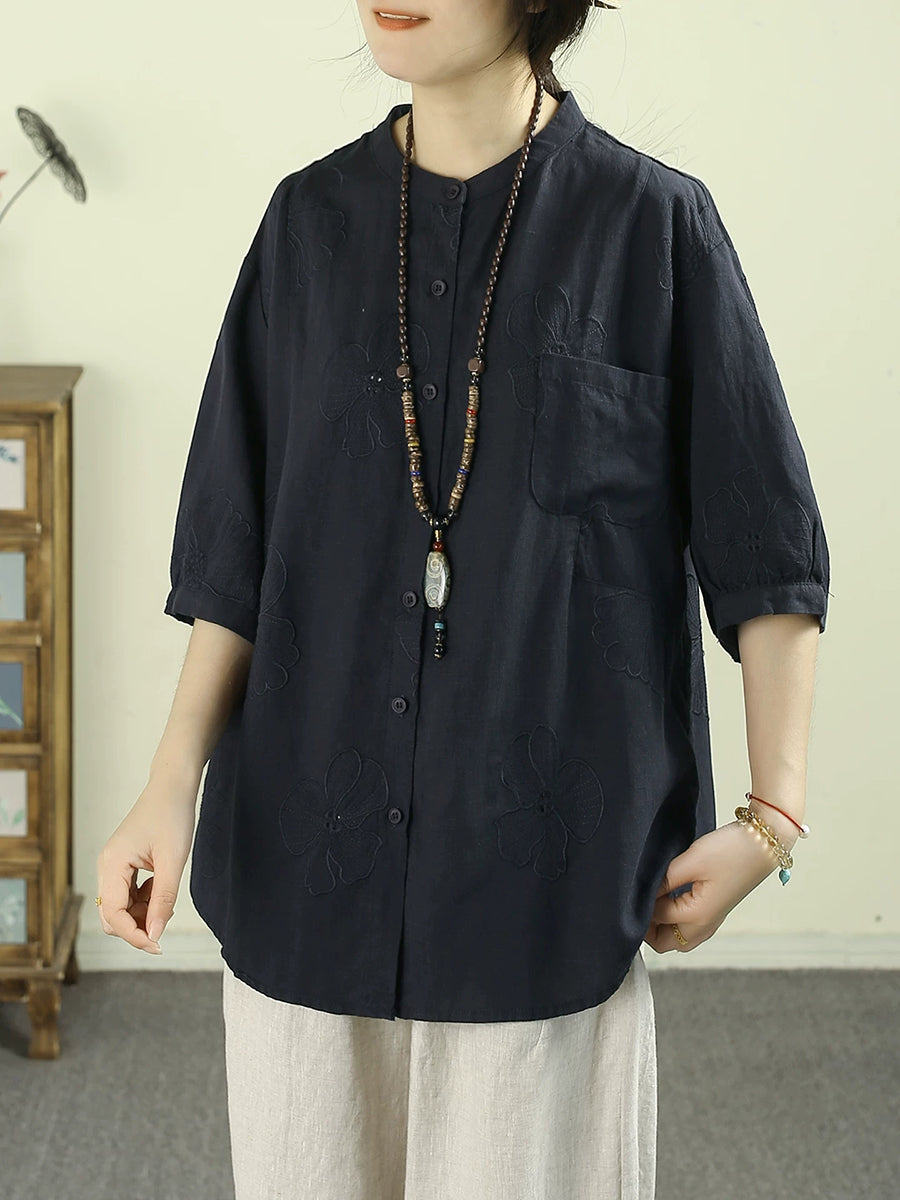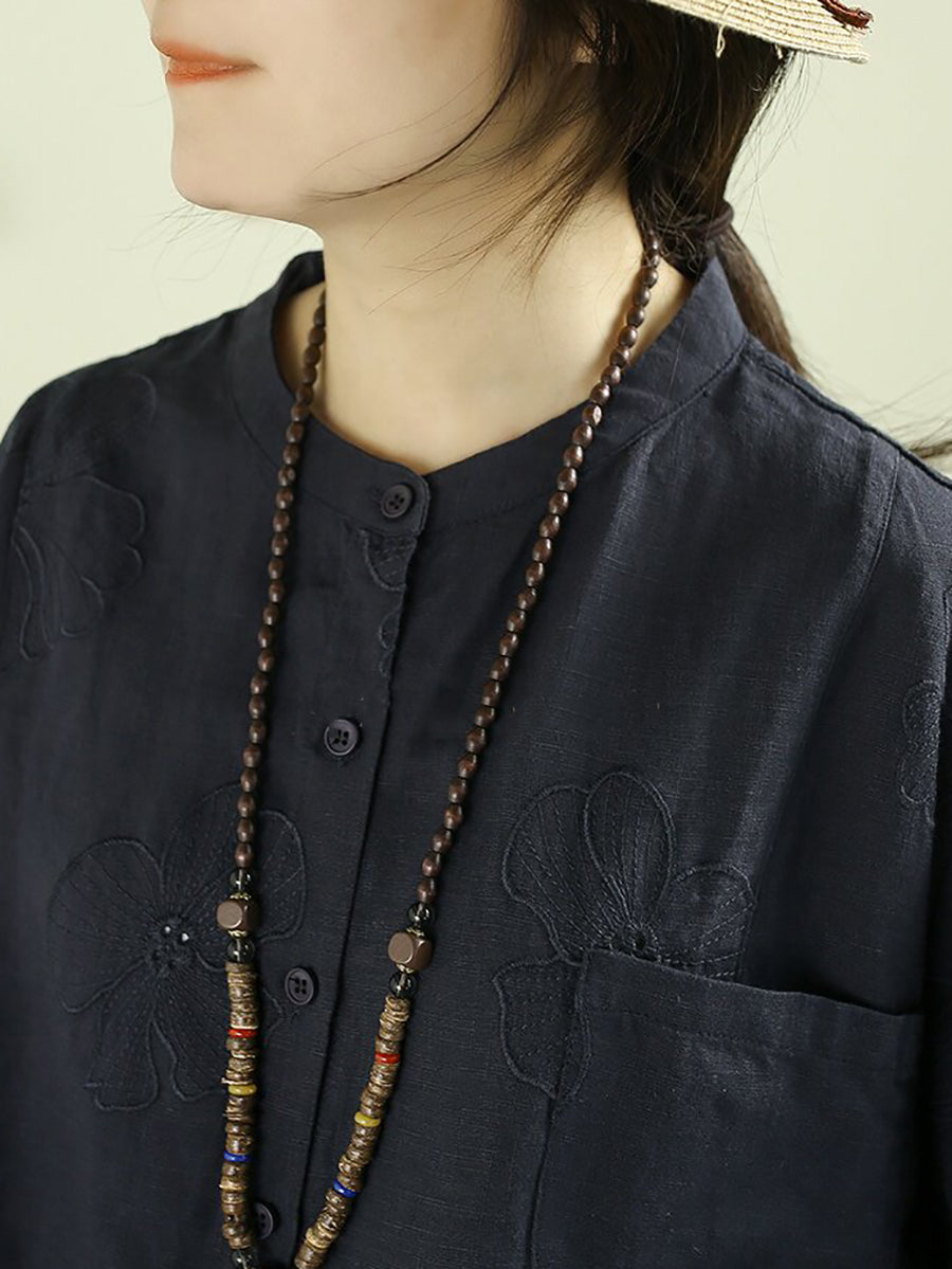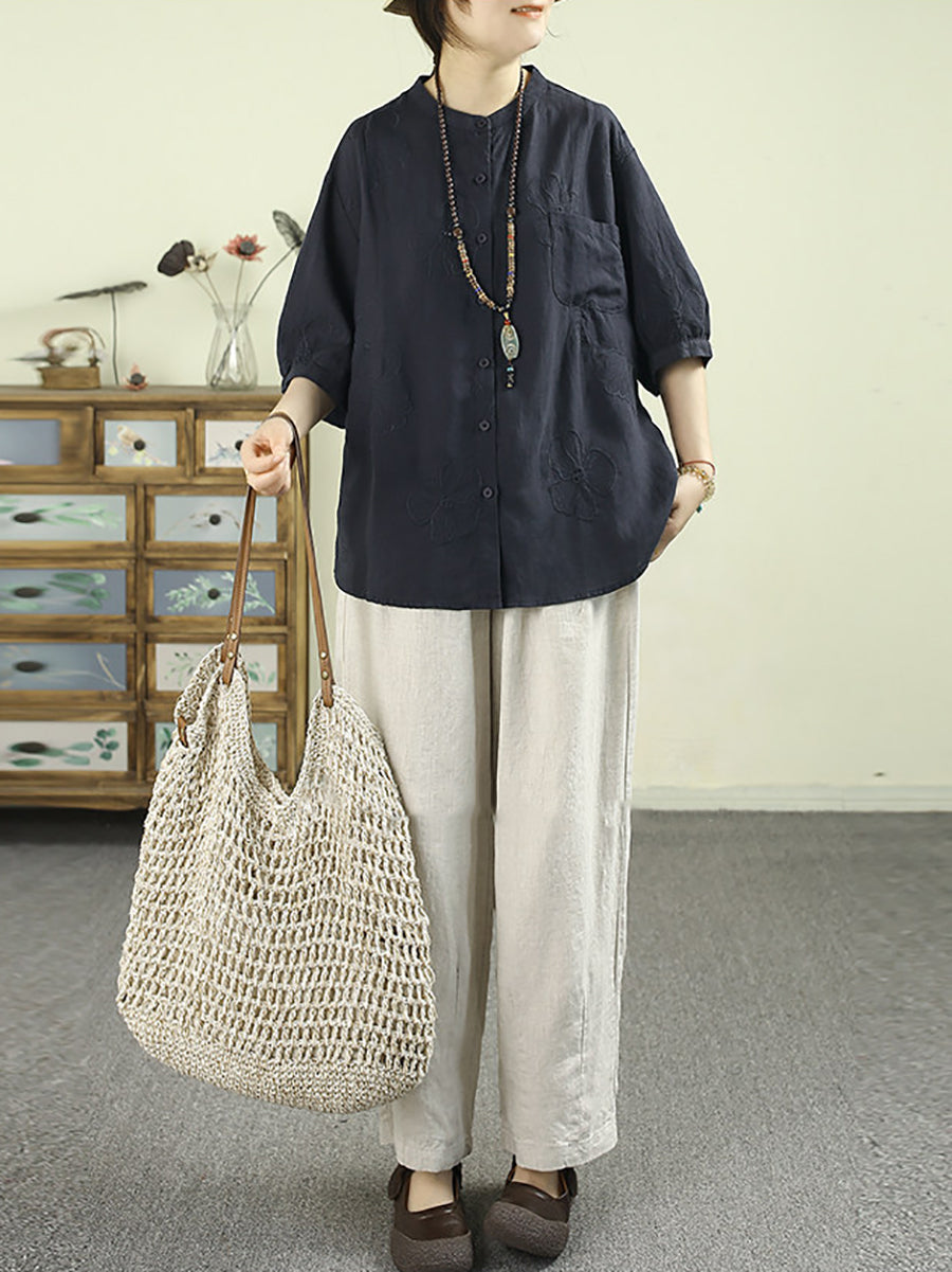 女士夏季藝術風立領100%亞麻襯衫