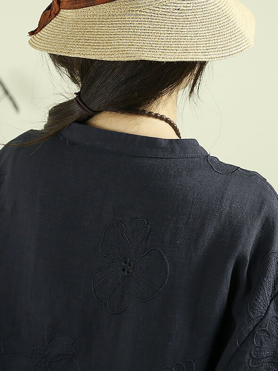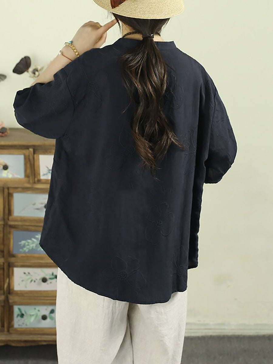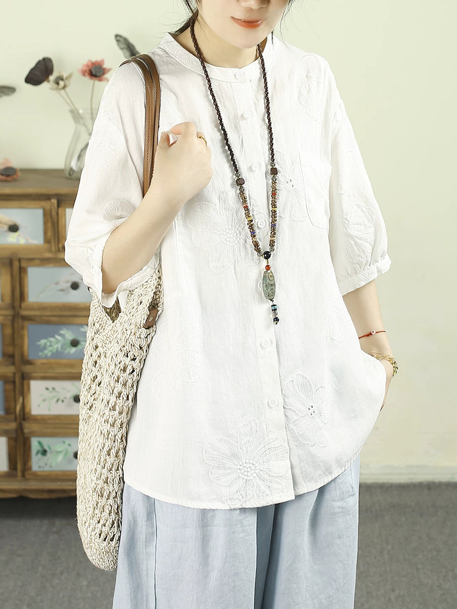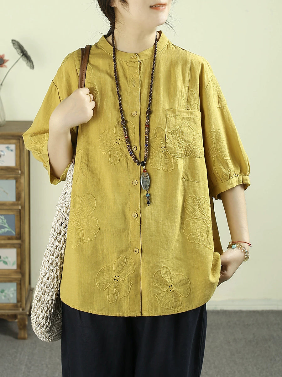 女士夏季藝術風立領100%亞麻襯衫