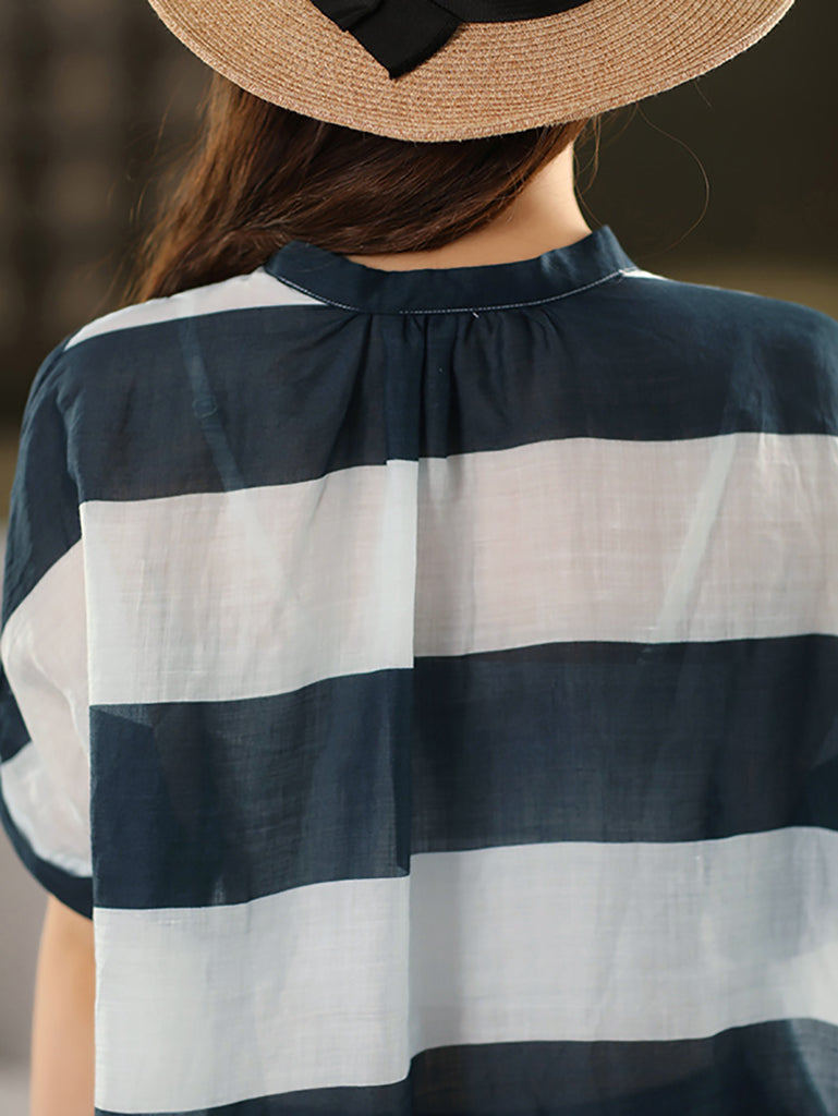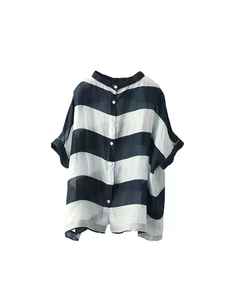 女士夏季藝術條紋立領 100% 苧麻薄襯衫