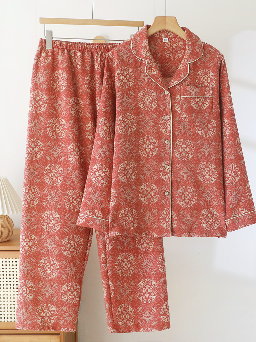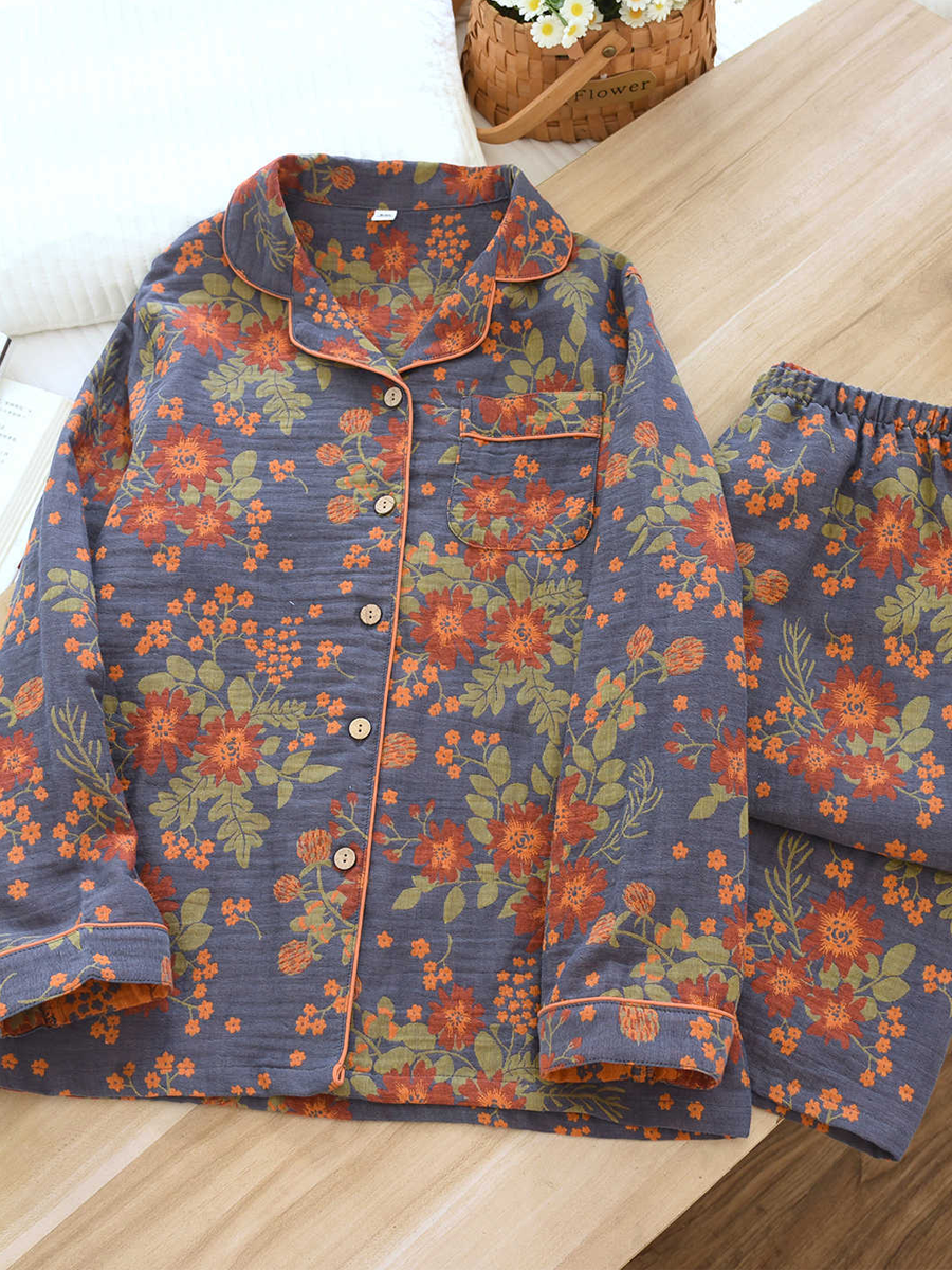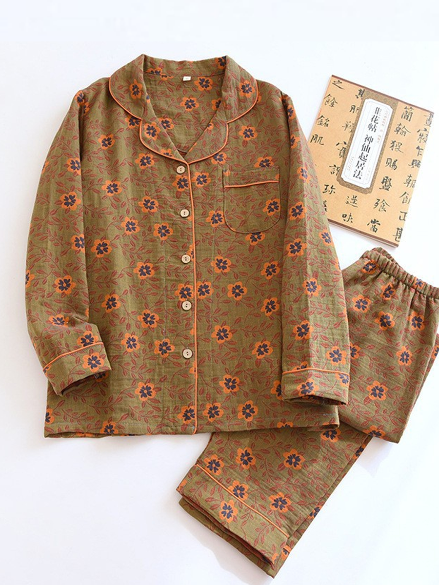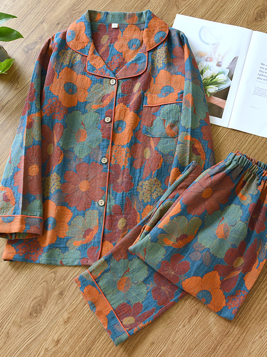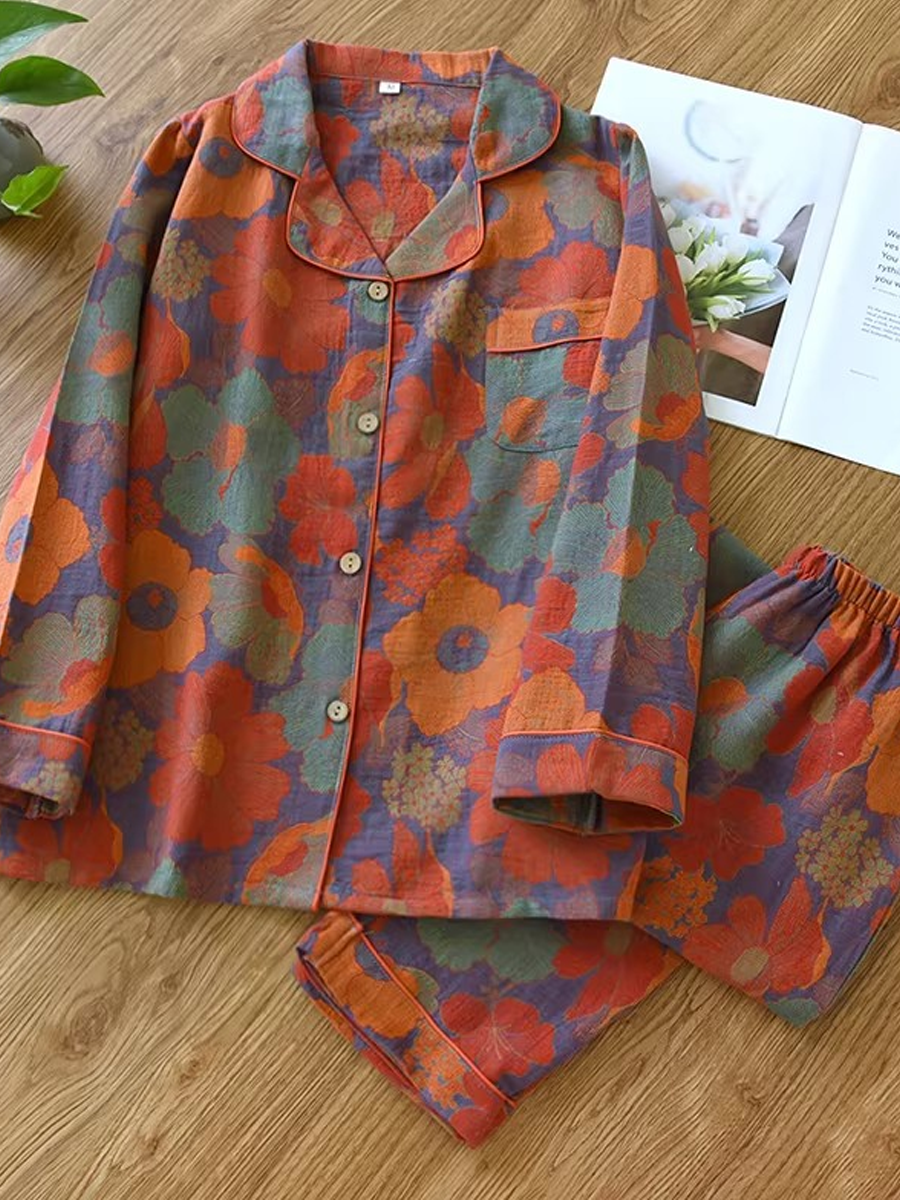 女士夏季花卉家居睡衣套裝 這款時尚套裝採用柔軟的提花紗布製成,穿著舒適。它擁有V領、花卉圖案、長袖和鬆緊腰帶,搭配長褲,非常適合居家休閒穿著。