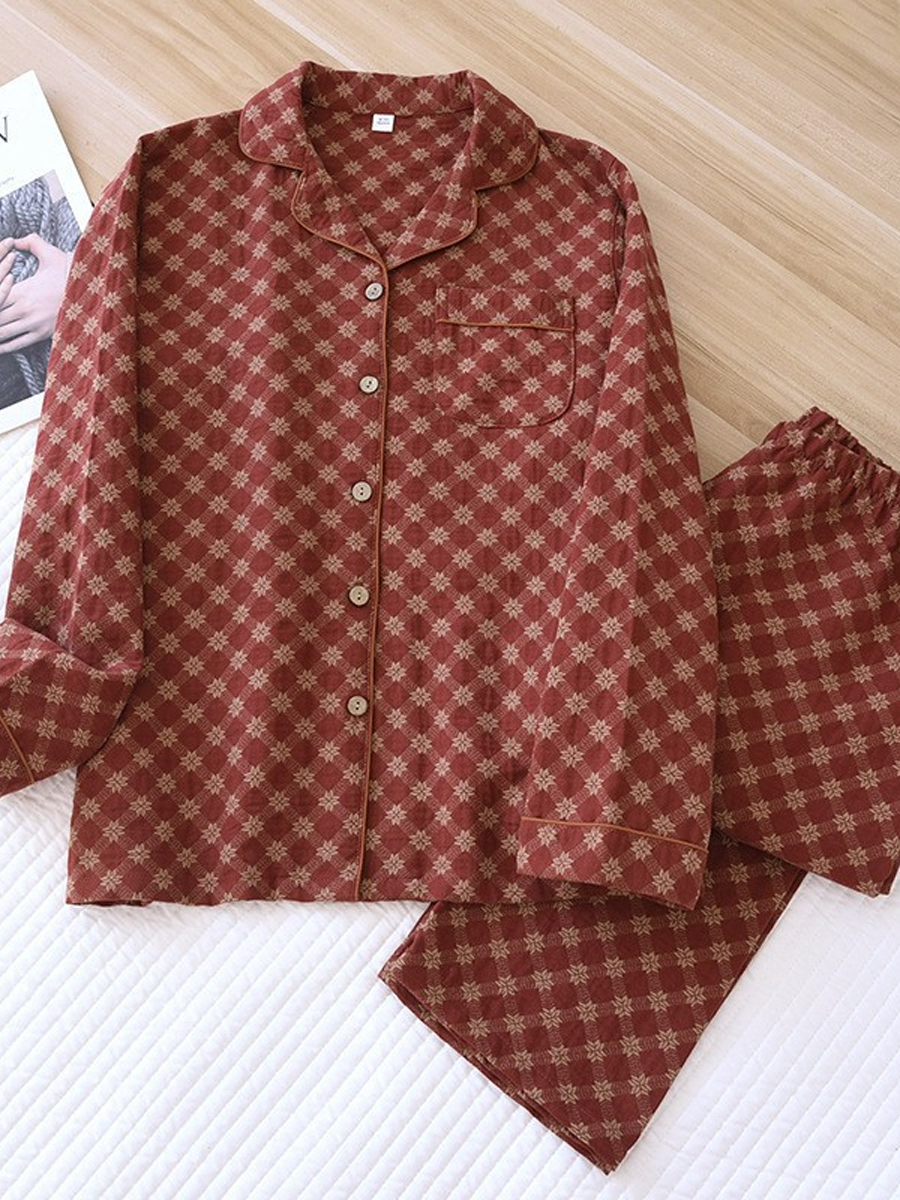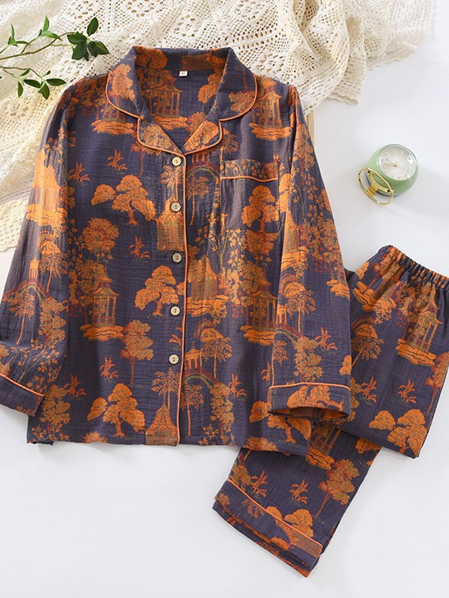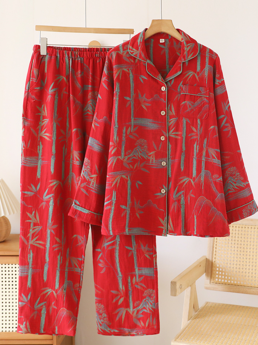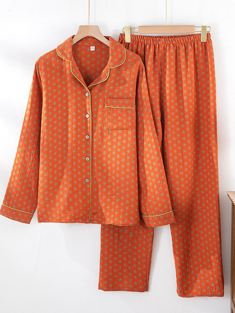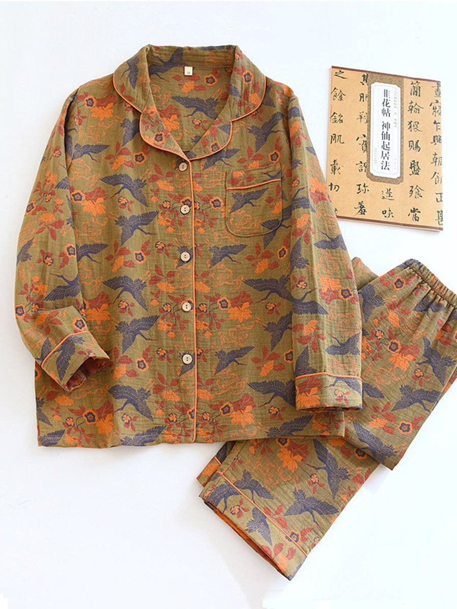 女士夏季花卉家居睡衣套裝 這款時尚套裝採用柔軟的提花紗布製成,穿著舒適。它擁有V領、花卉圖案、長袖和鬆緊腰帶,搭配長褲,非常適合居家休閒穿著。