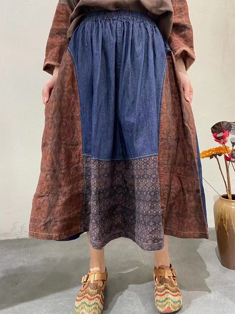 女夏季民族貼片拼接A字裙