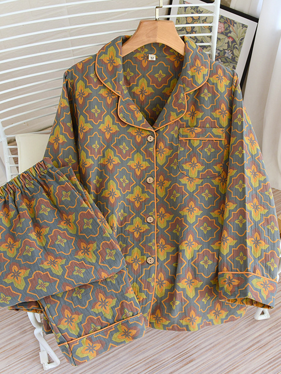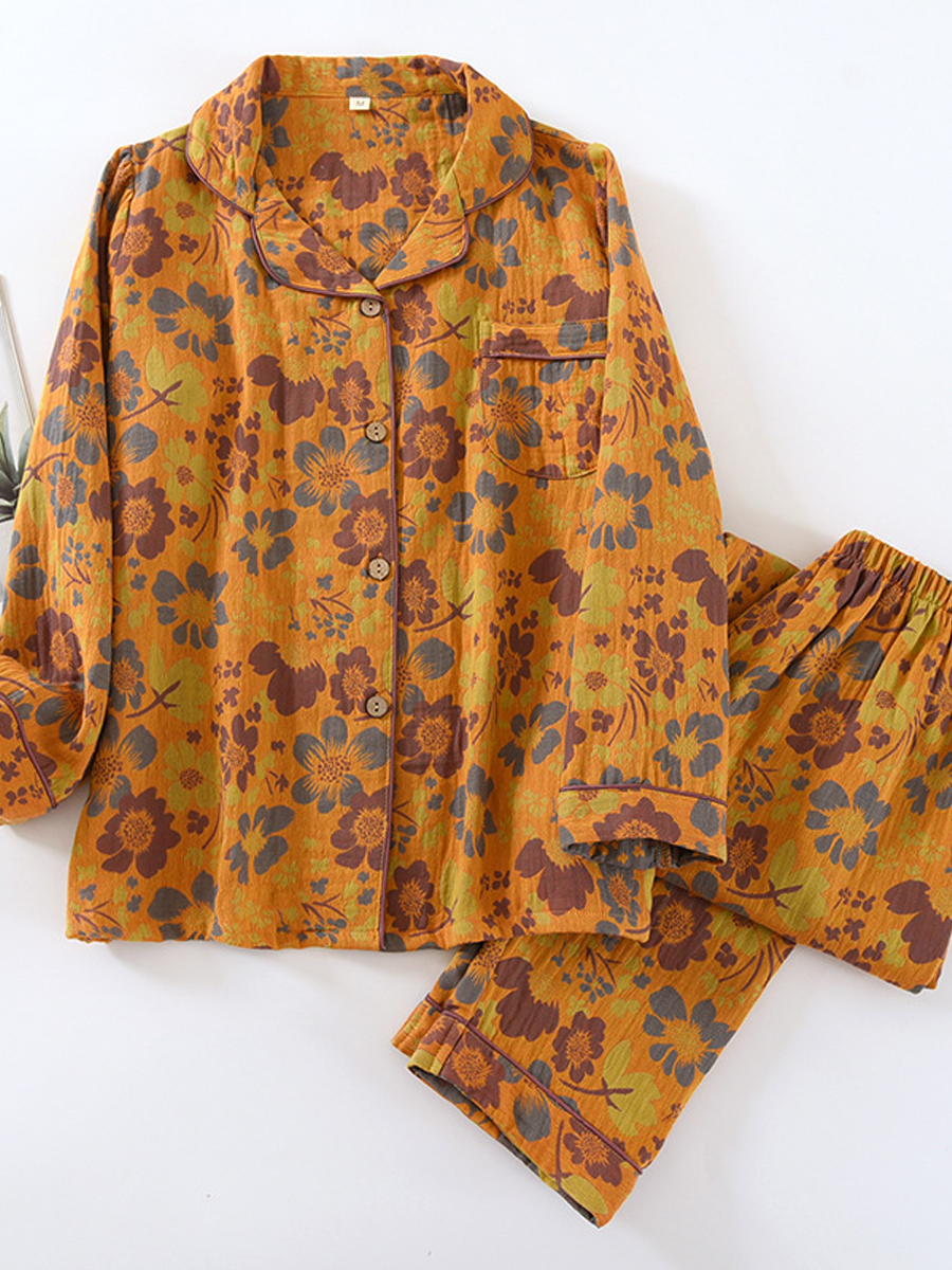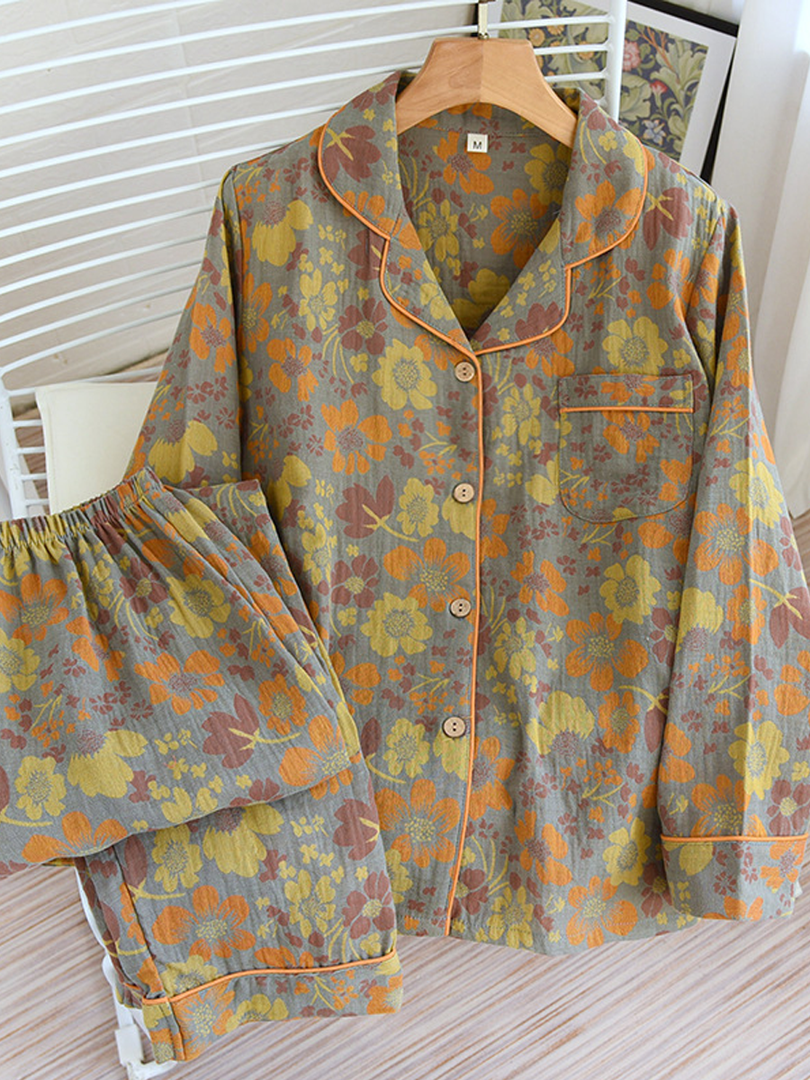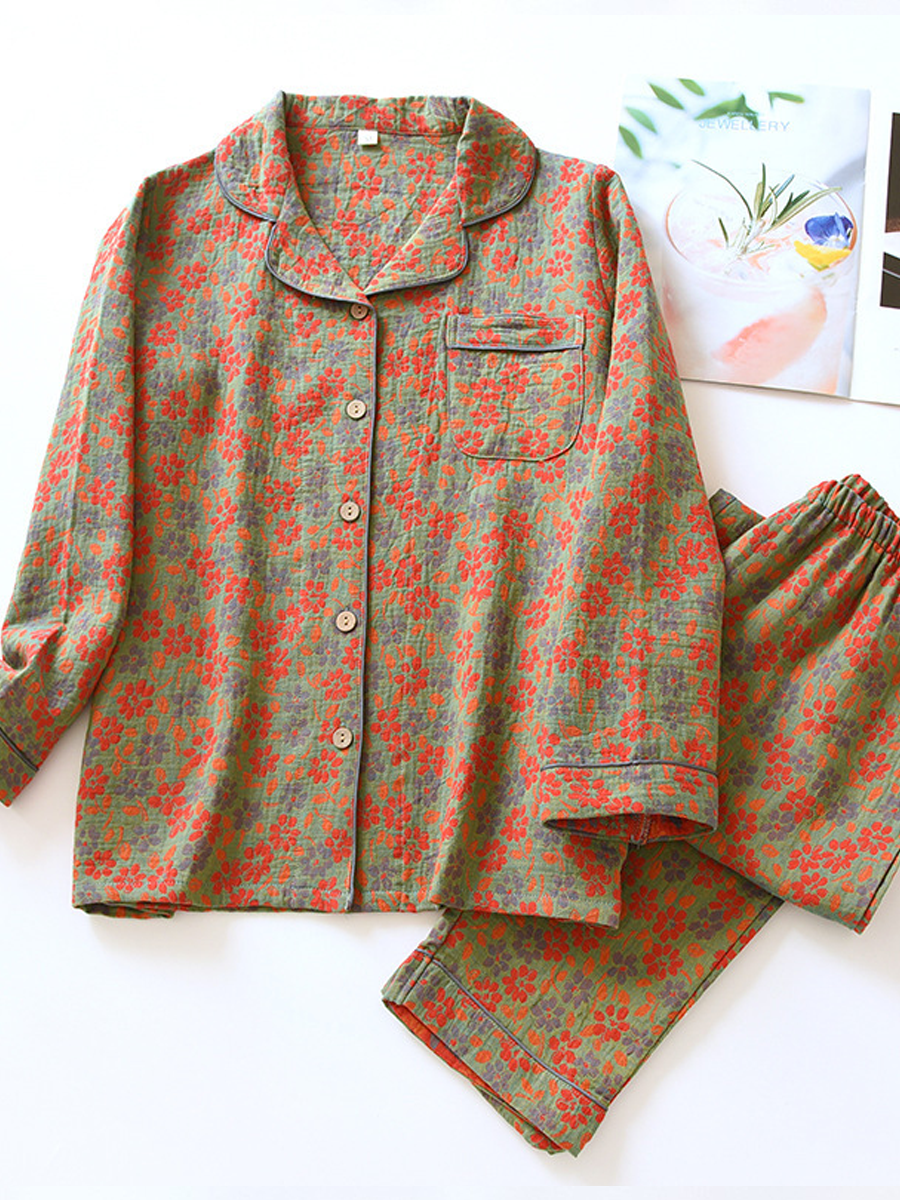 這 女士夏季花卉家居睡衣套裝 這款時尚套裝採用柔軟的提花紗布製成,穿著舒適。它擁有V領、花卉圖案、長袖和鬆緊腰帶,搭配長褲,非常適合居家休閒穿著。