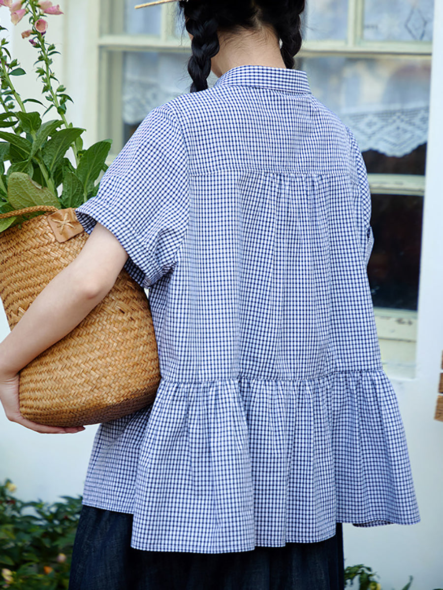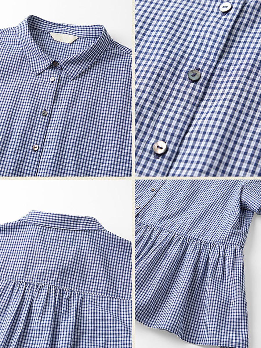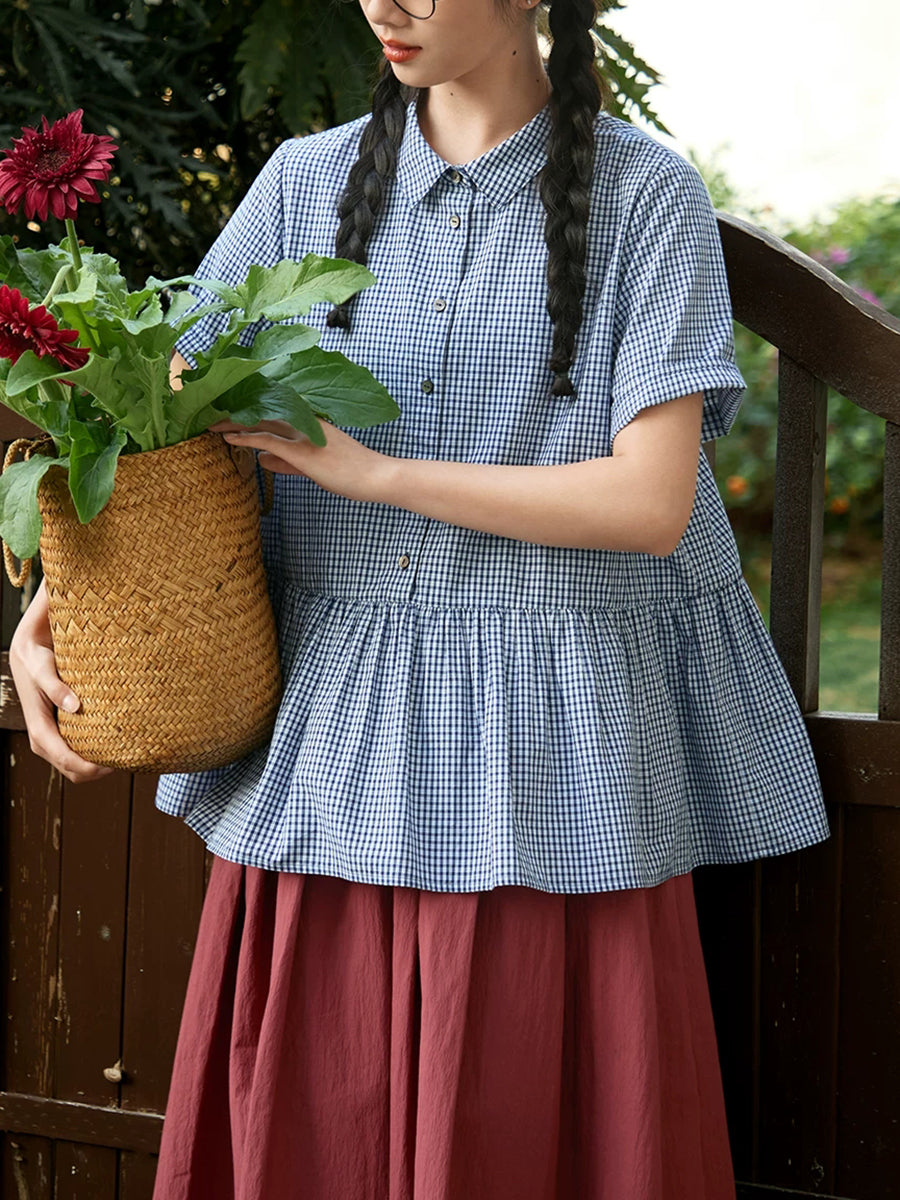 女士夏季格紋圖案100%純棉翻領襯衫
