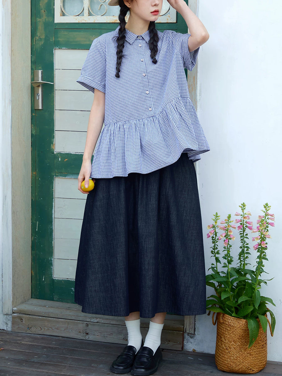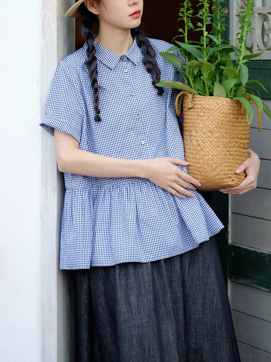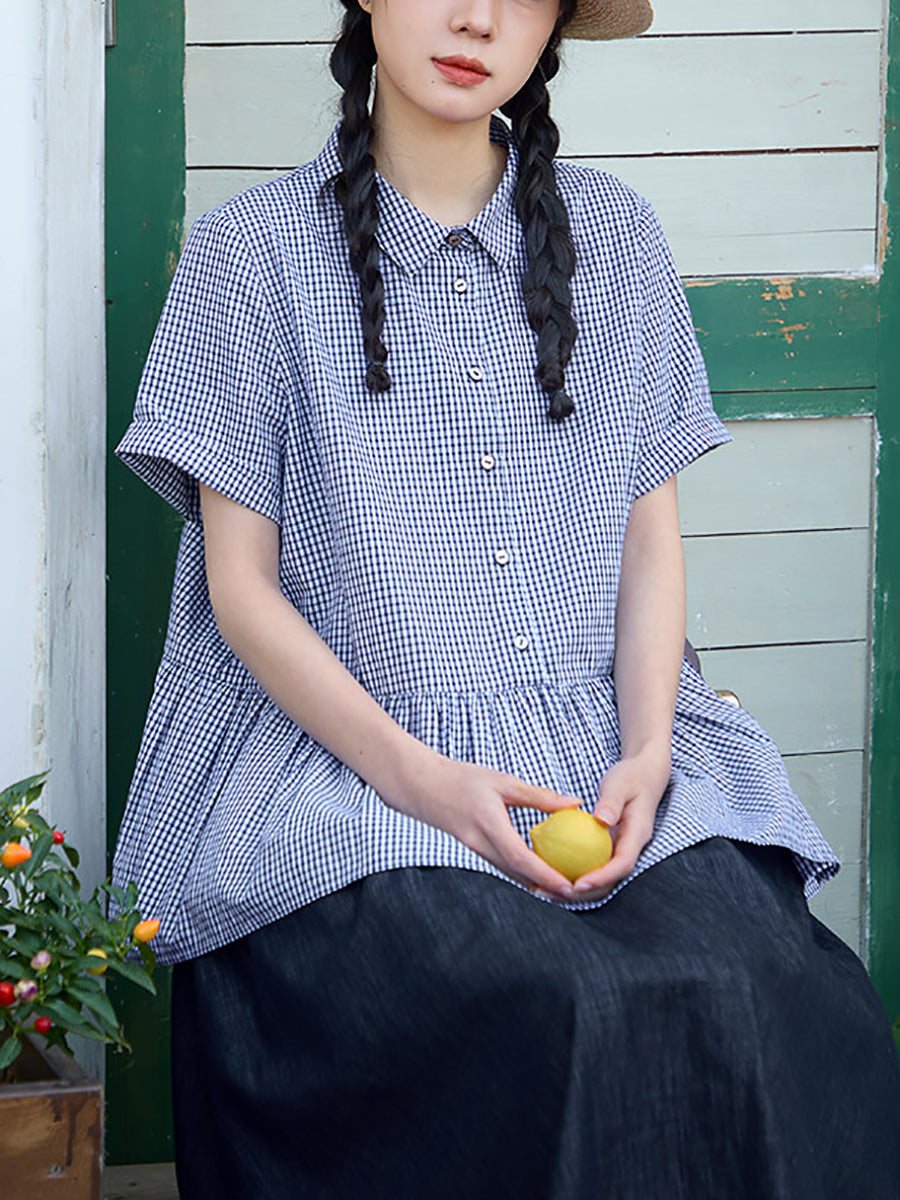 女士夏季格紋圖案100%純棉翻領襯衫