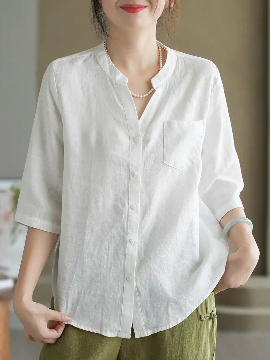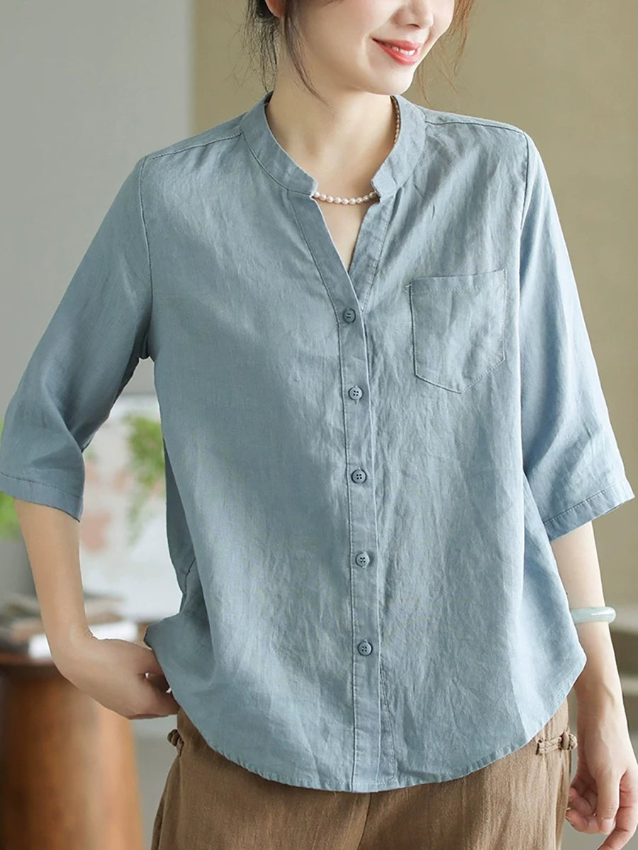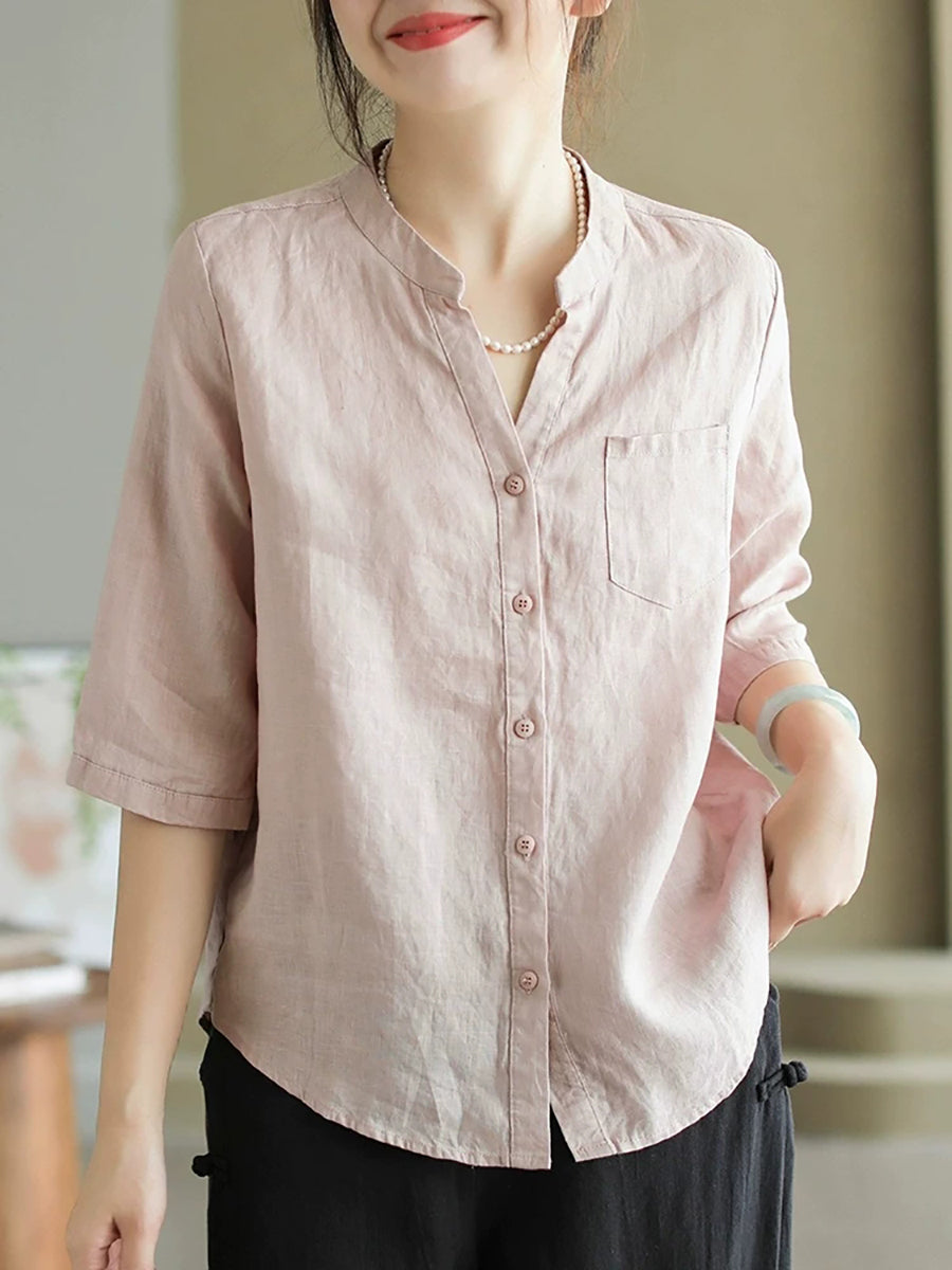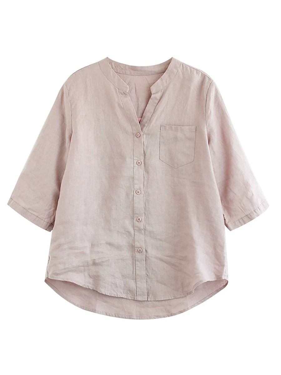 女士夏季純色V領100%亞麻襯衫