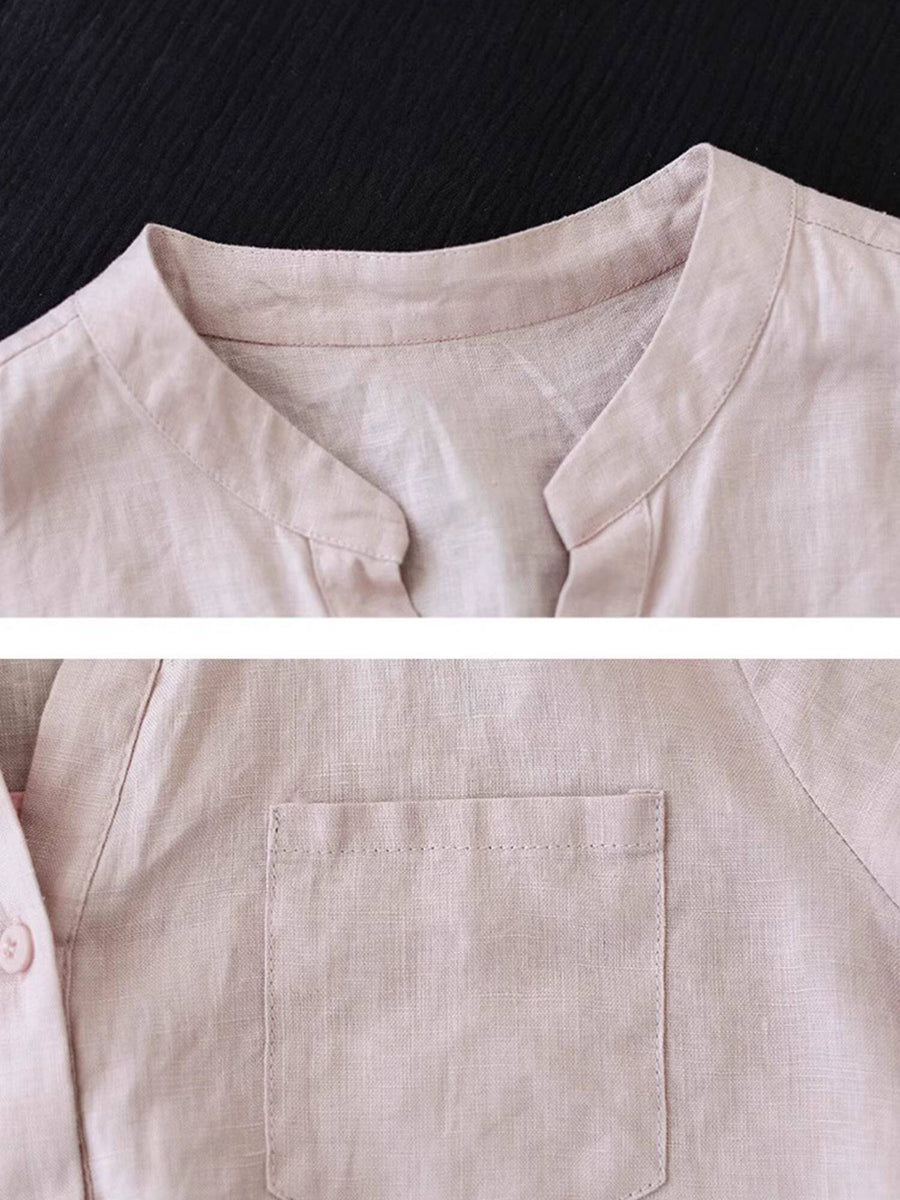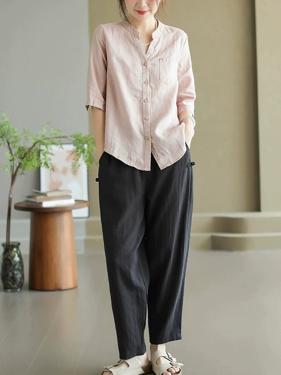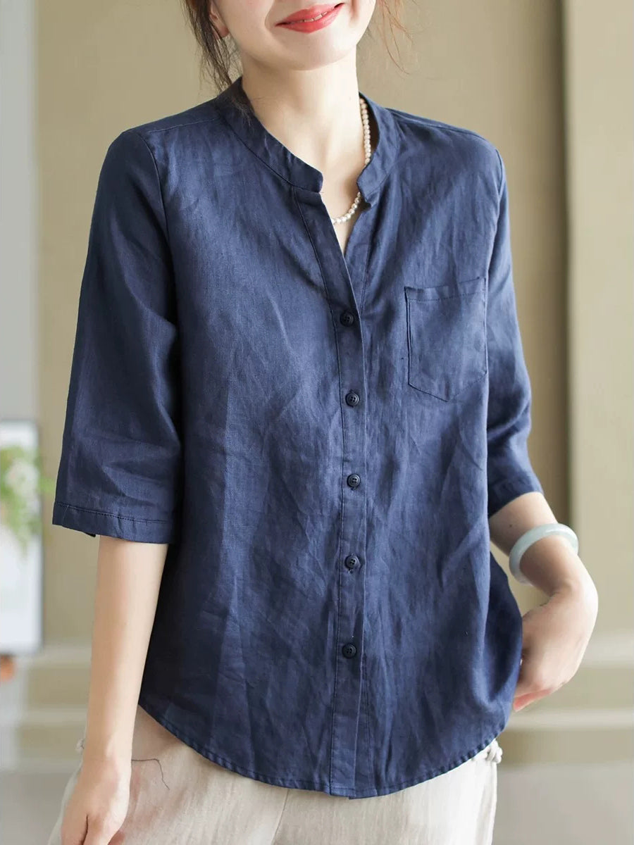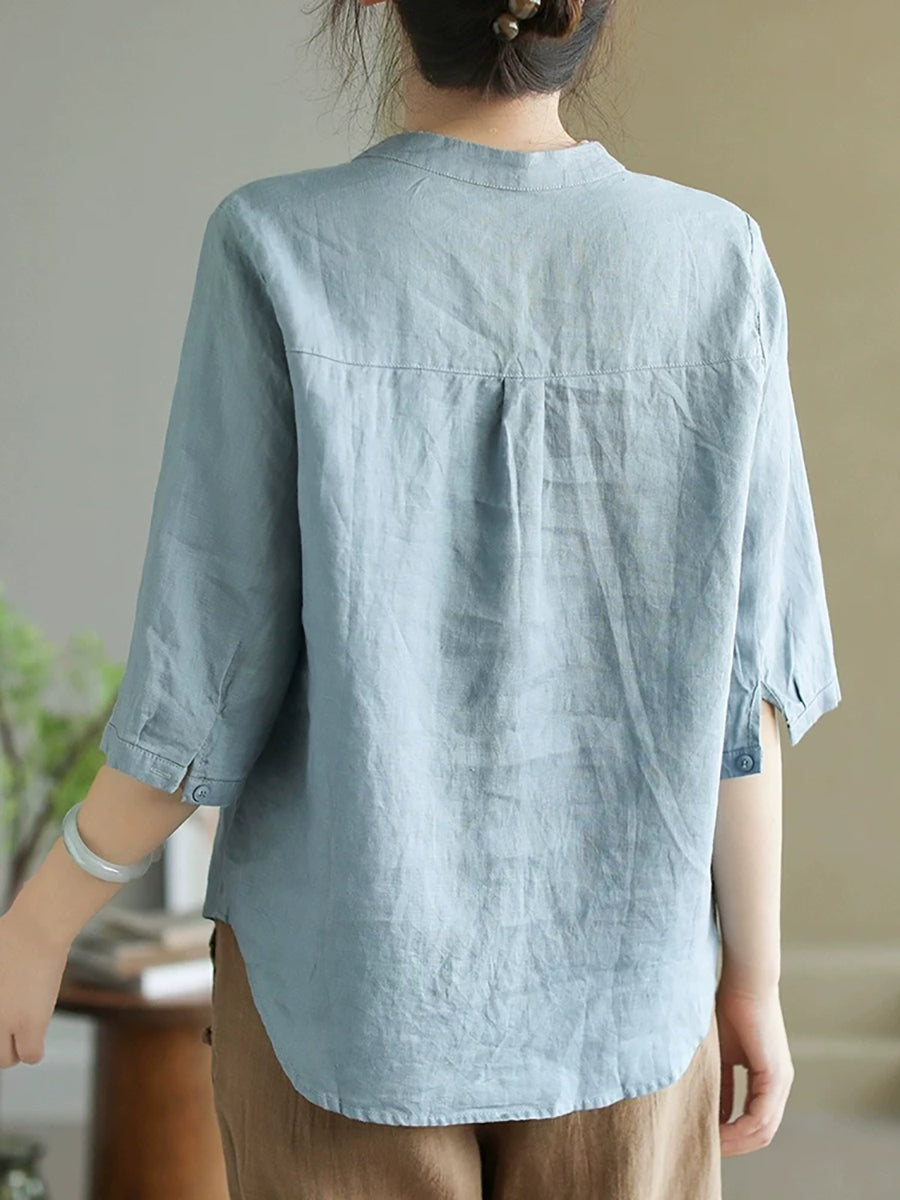 女士夏季純色V領100%亞麻襯衫