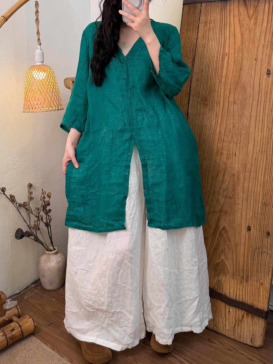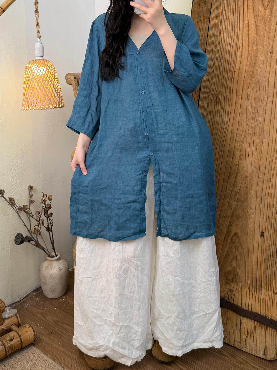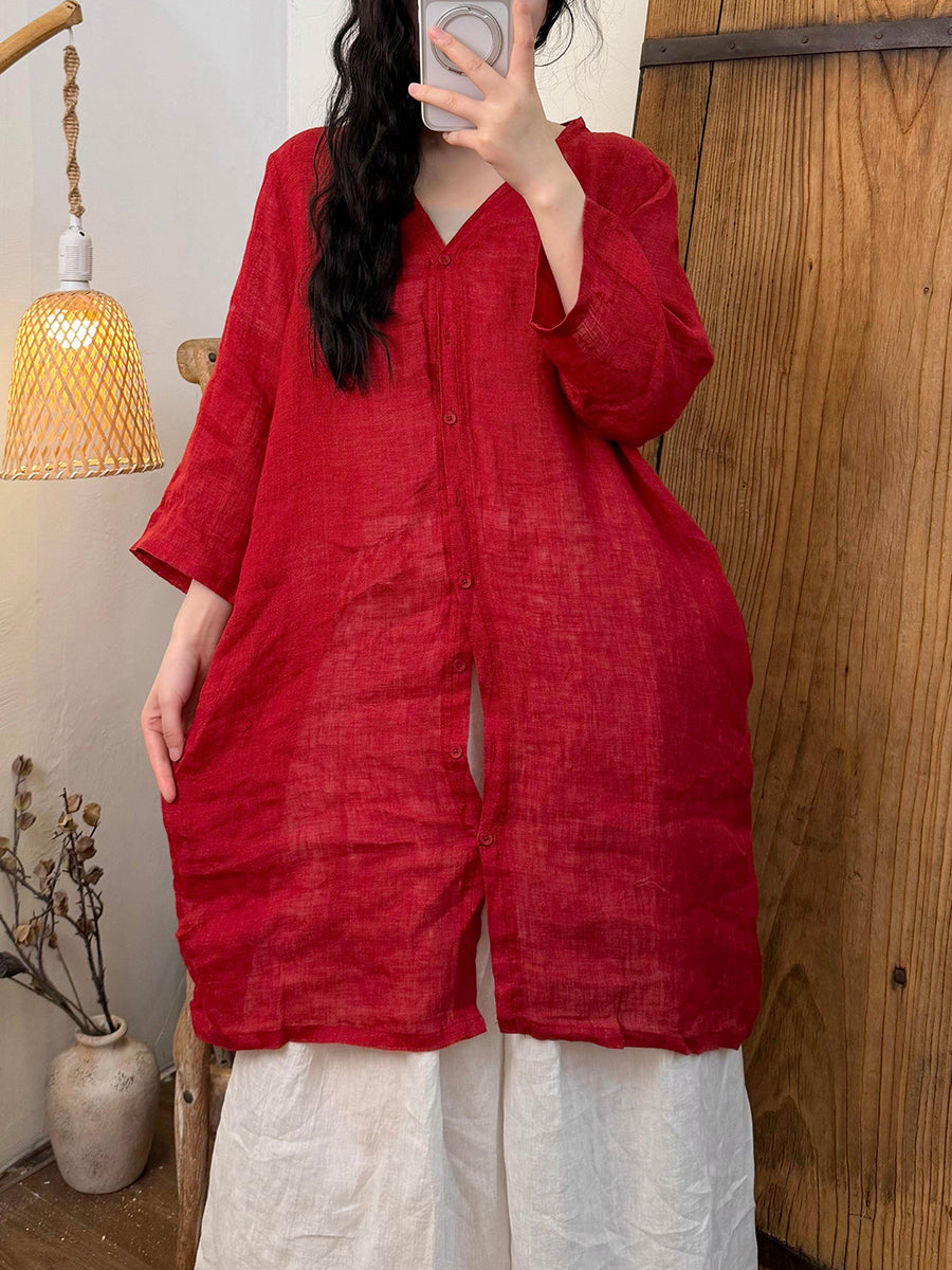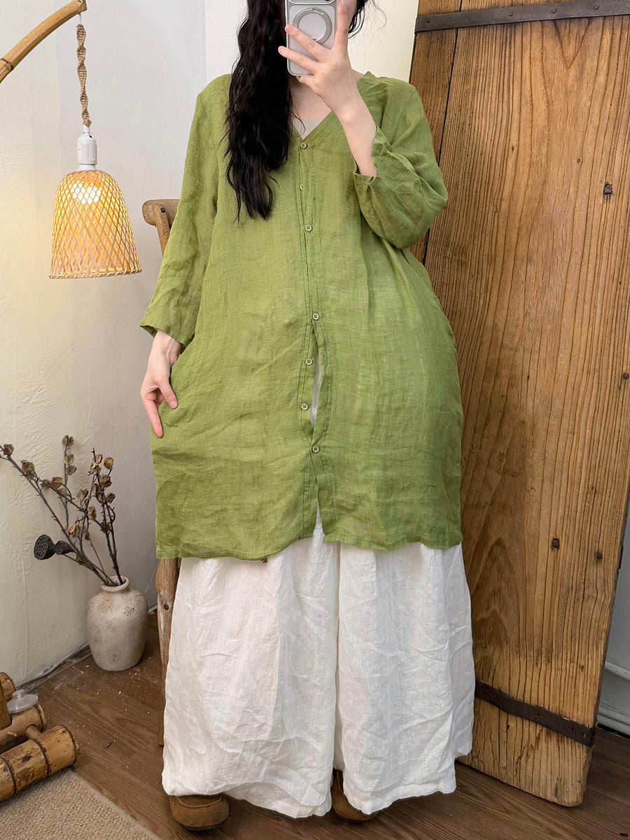 女士夏季純色V領亞麻襯衫