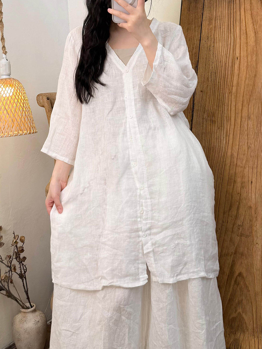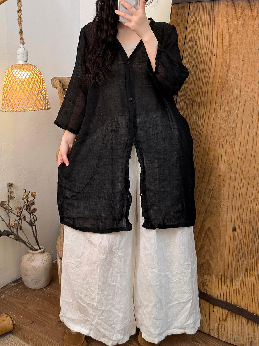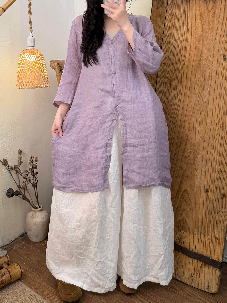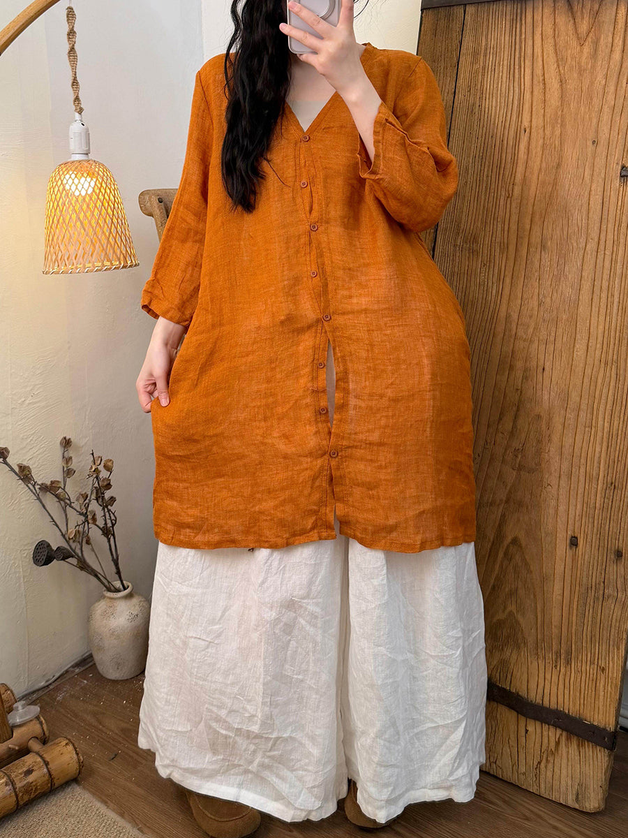 女士夏季純色V領亞麻襯衫