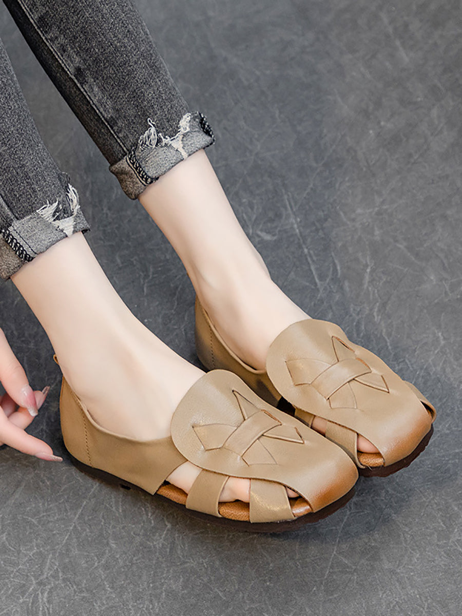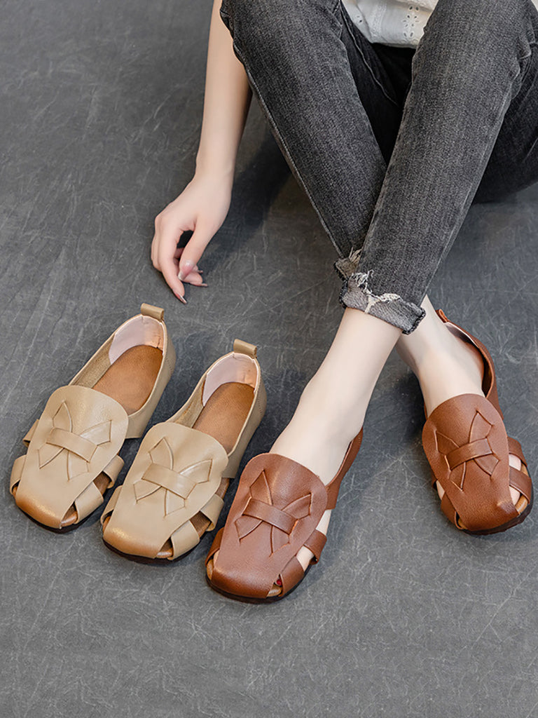 女款夏季純色復古皮革鏤空軟鞋