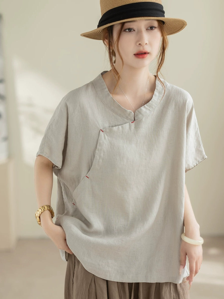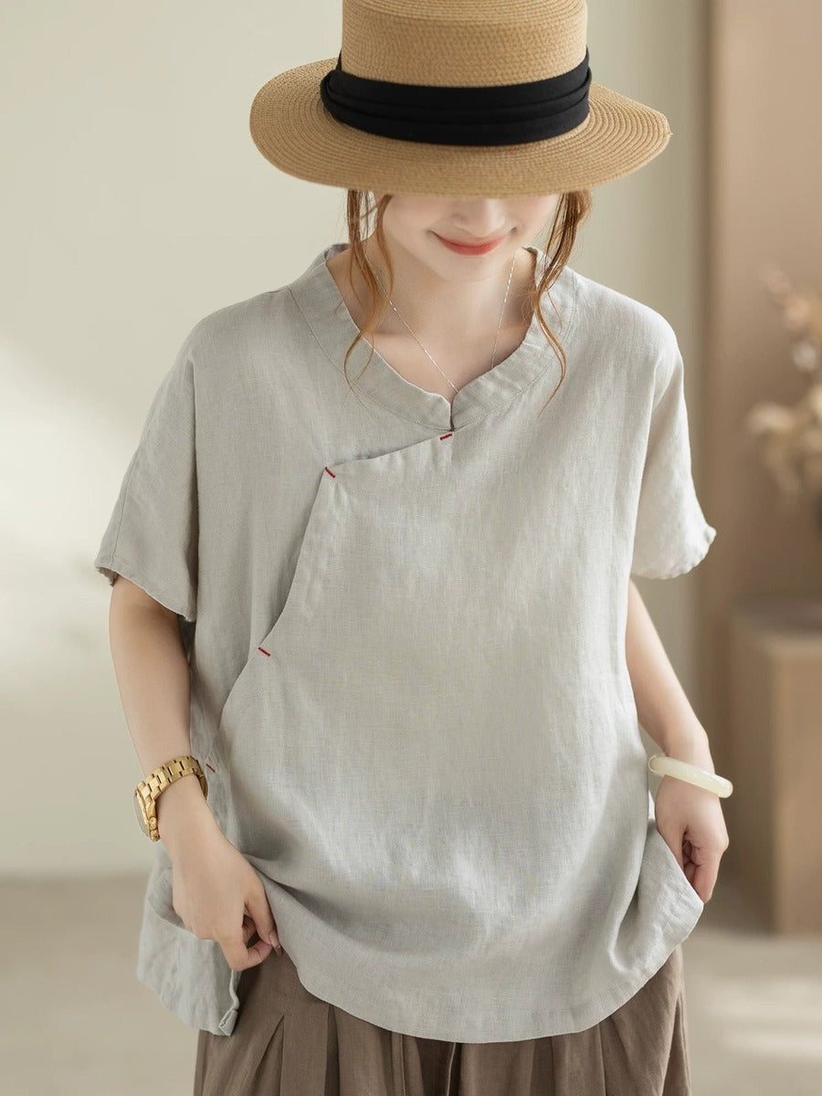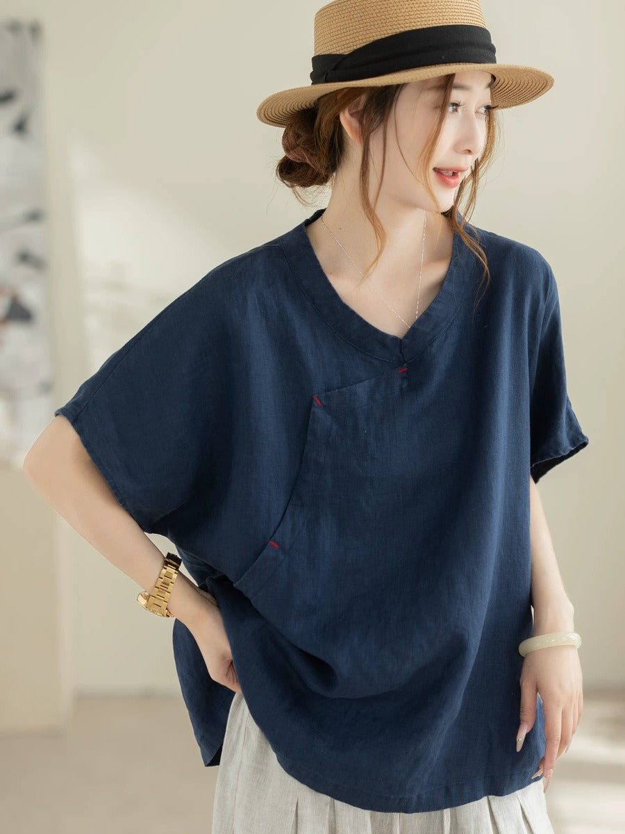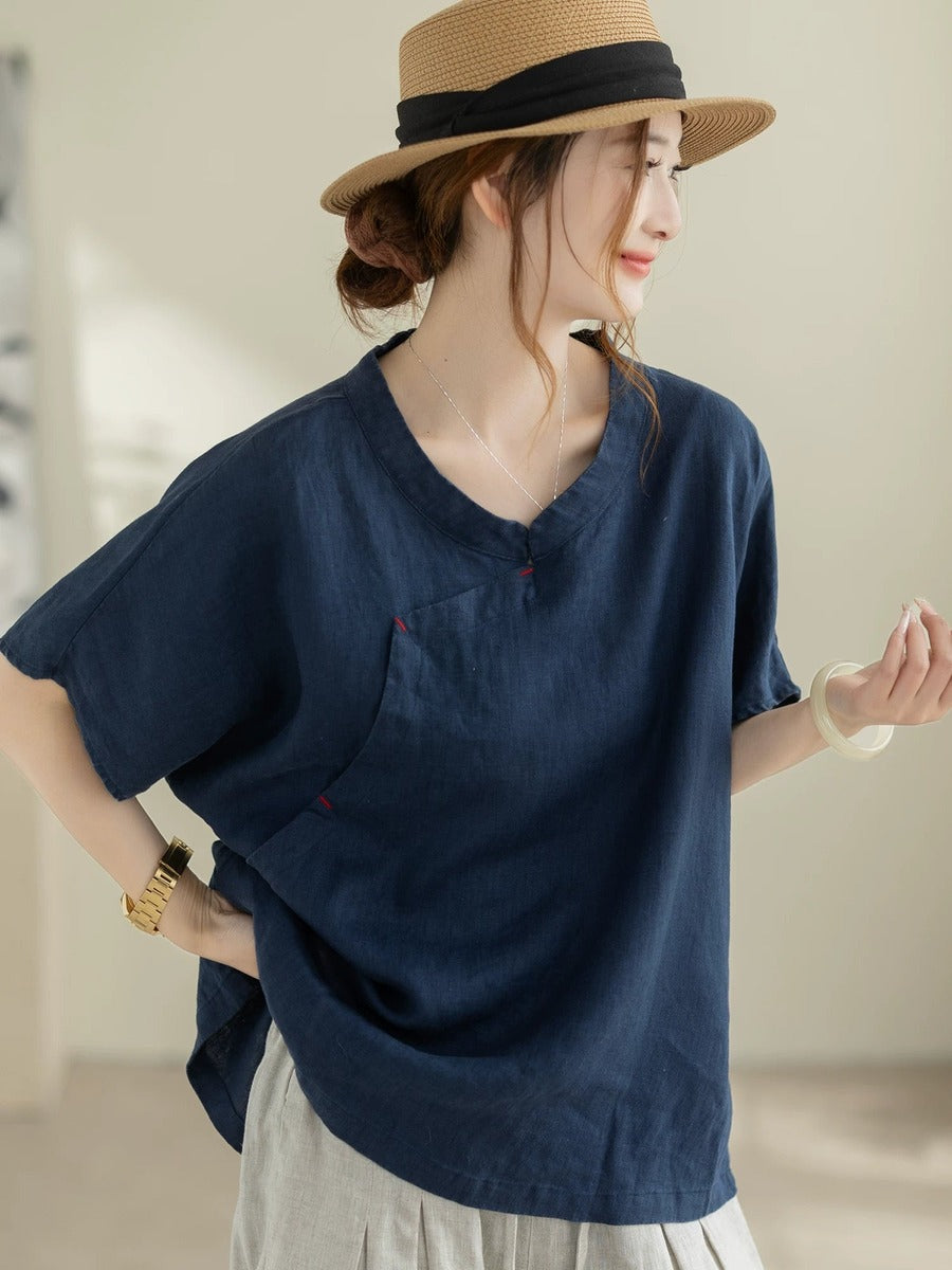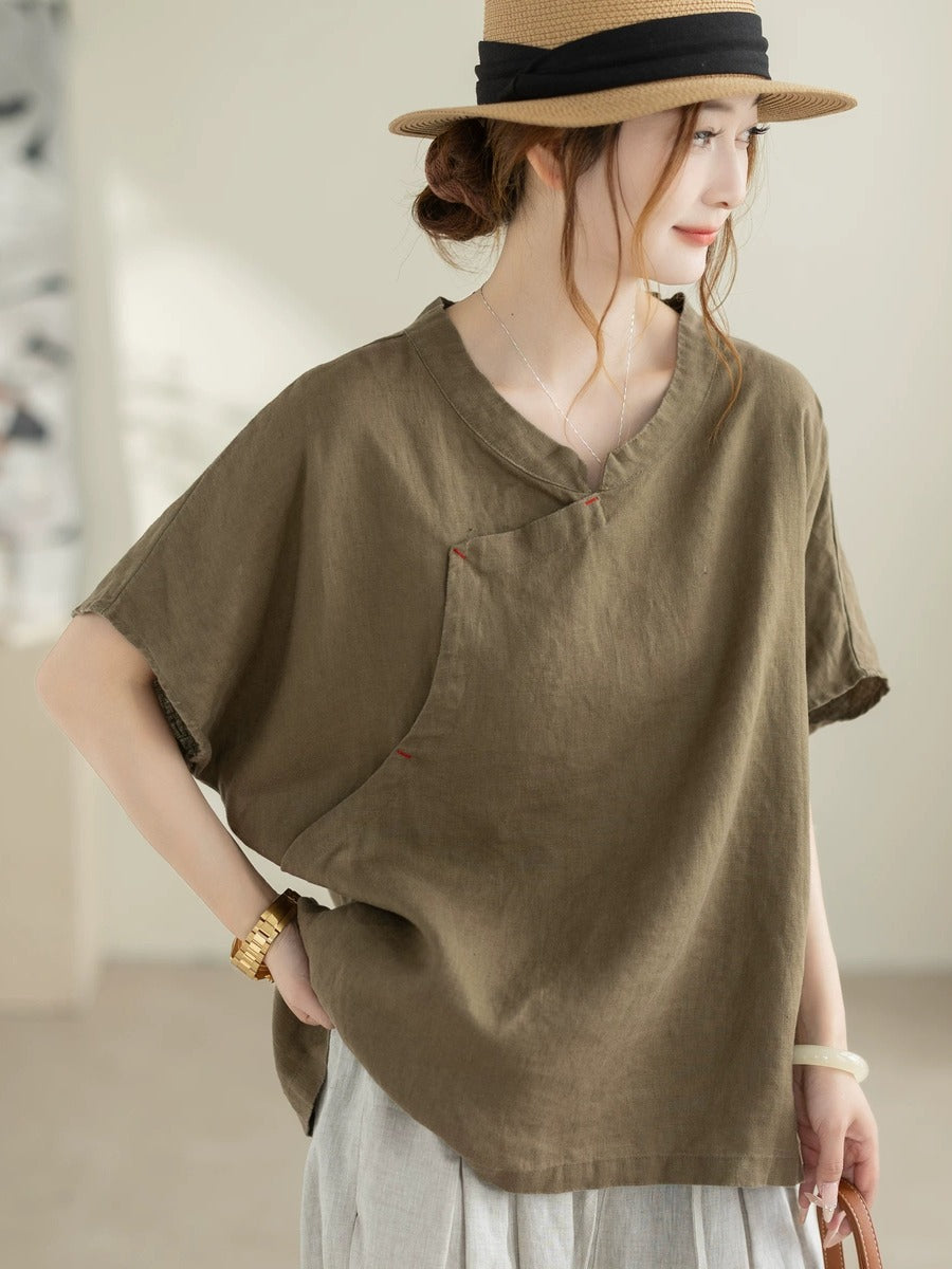 女士夏季復古100%亞麻V領短袖襯衫