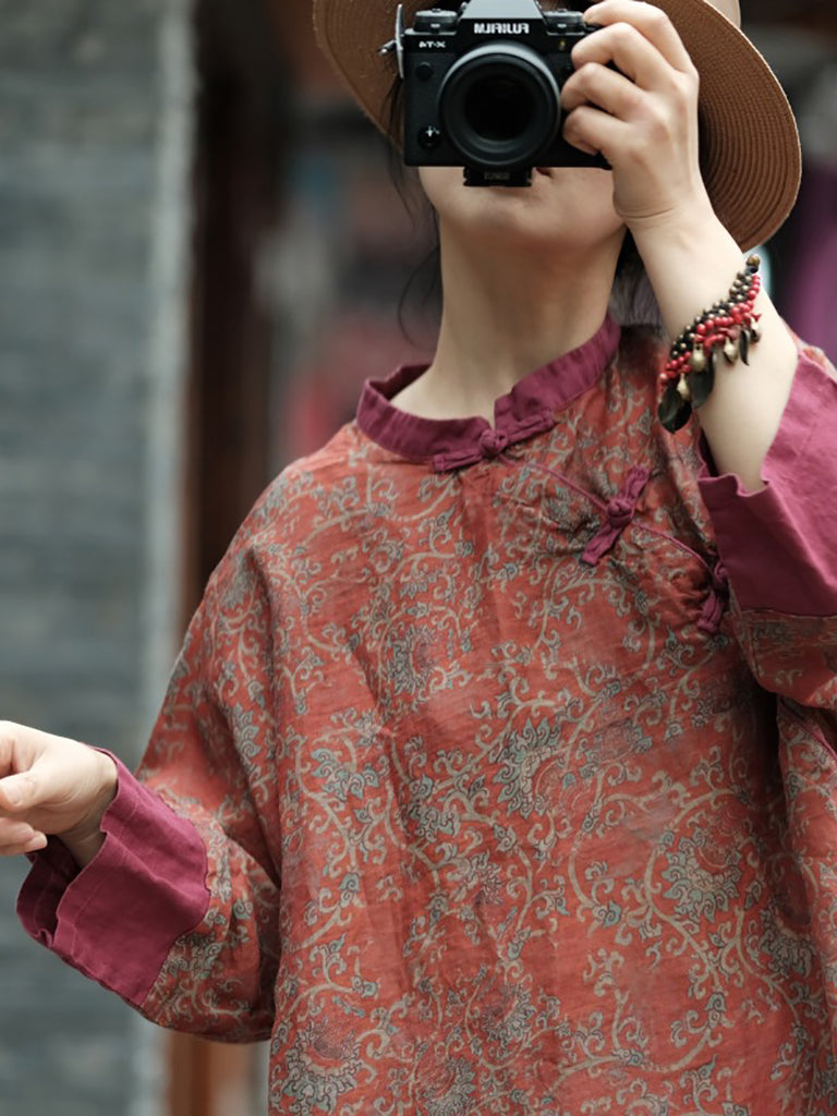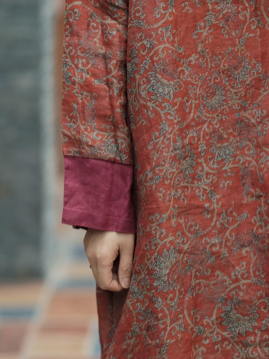 女款夏季復古花卉拼接苧麻洋裝