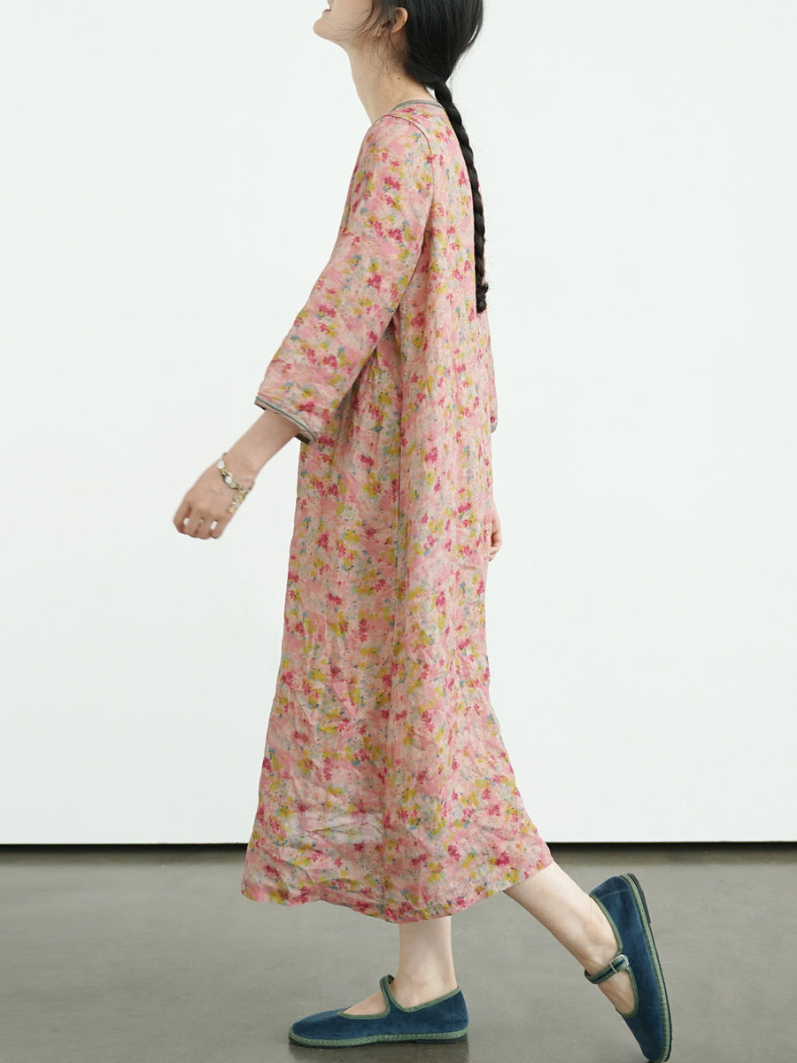 女士夏季復古碎花100%苧麻V領連身裙