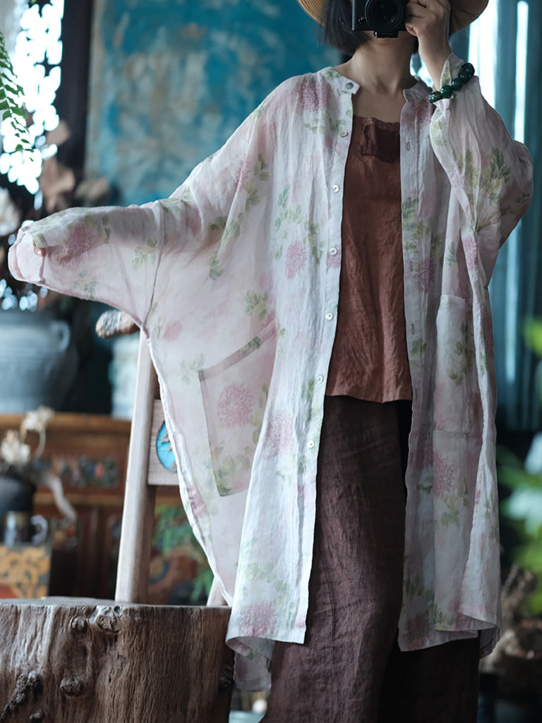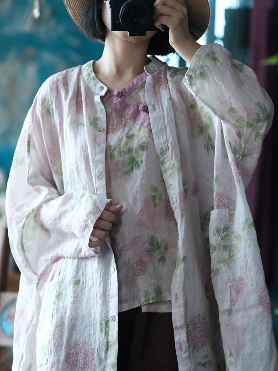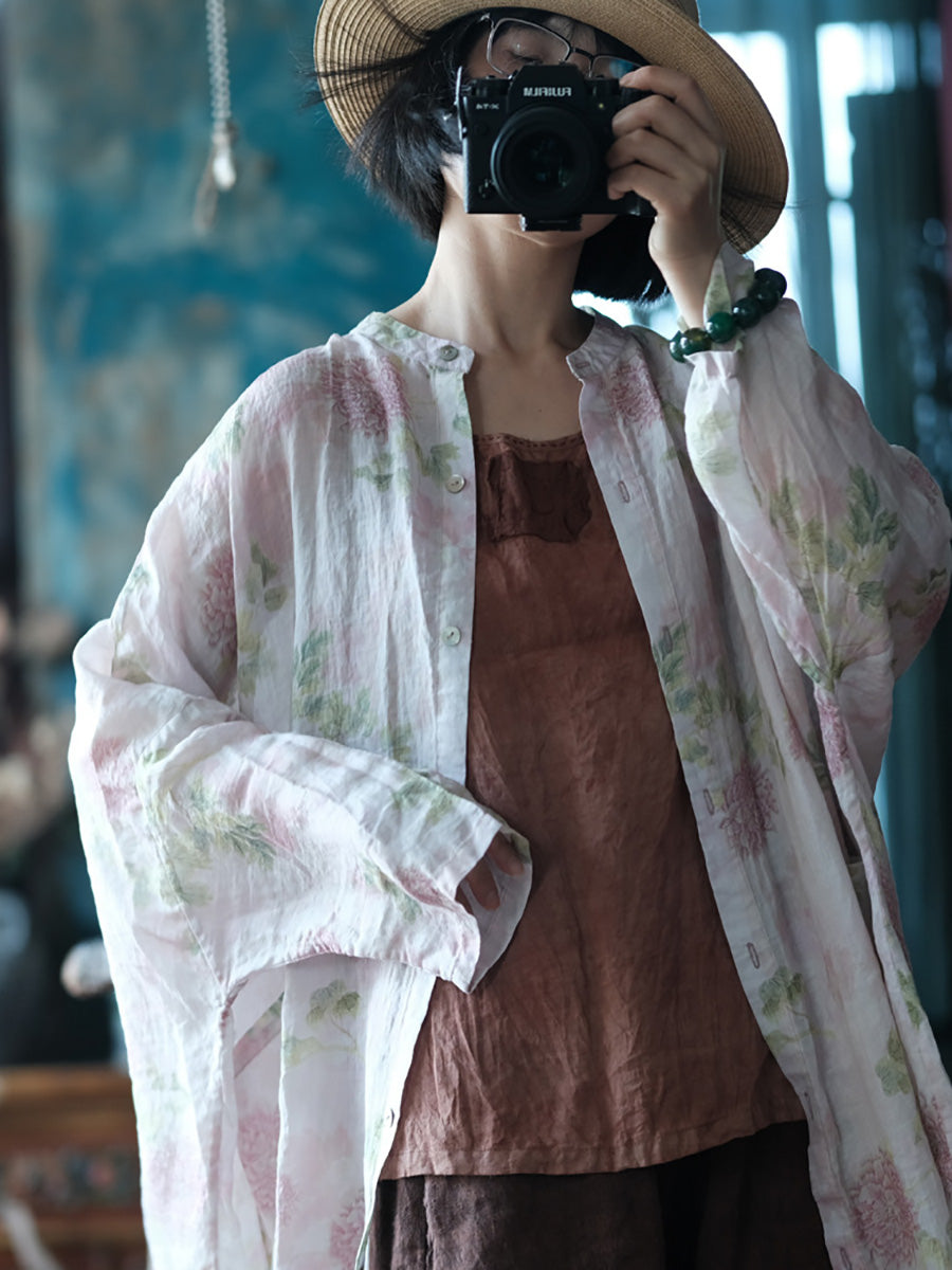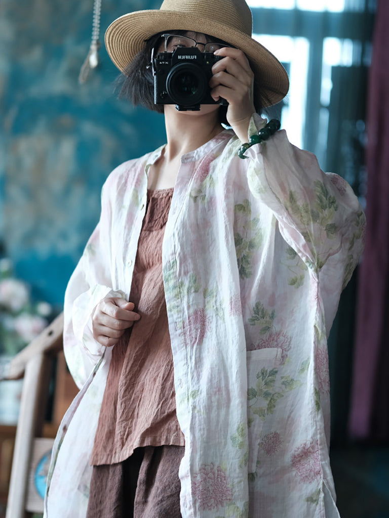 這款女款夏季復古花卉薄長苧麻襯衫採用 100% 苧麻材質精心製作,具有美麗的花朵圖案和經典的 O 領。這款襯衫採用全長插肩袖和復古風格,非常適合春夏季節。