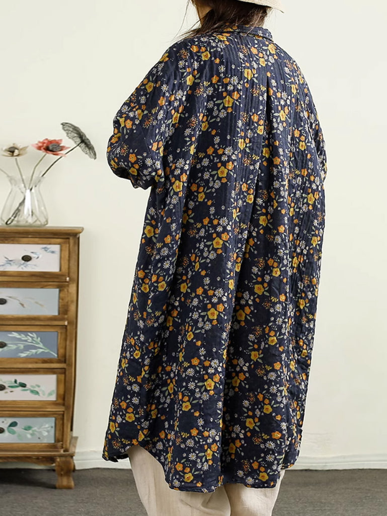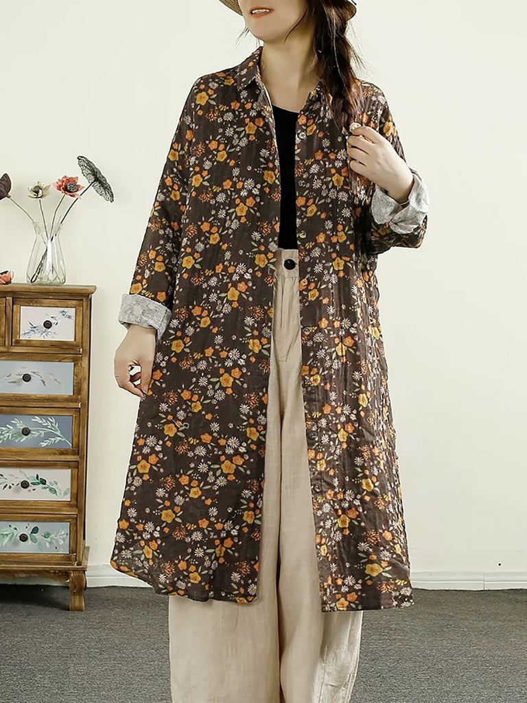 這款外套採用亞麻材質,立領、插肩袖,復古的花朵圖案設計。它非常適合秋冬季節穿著。