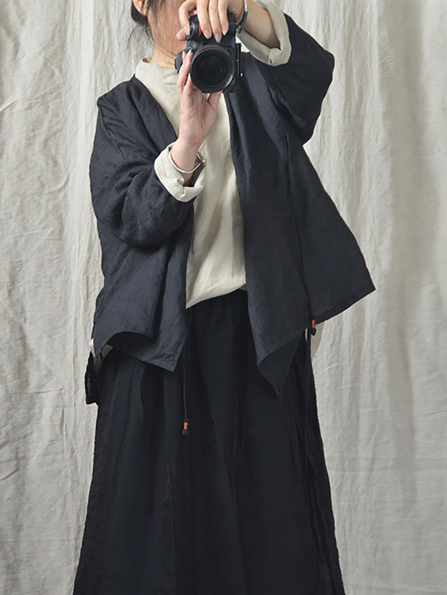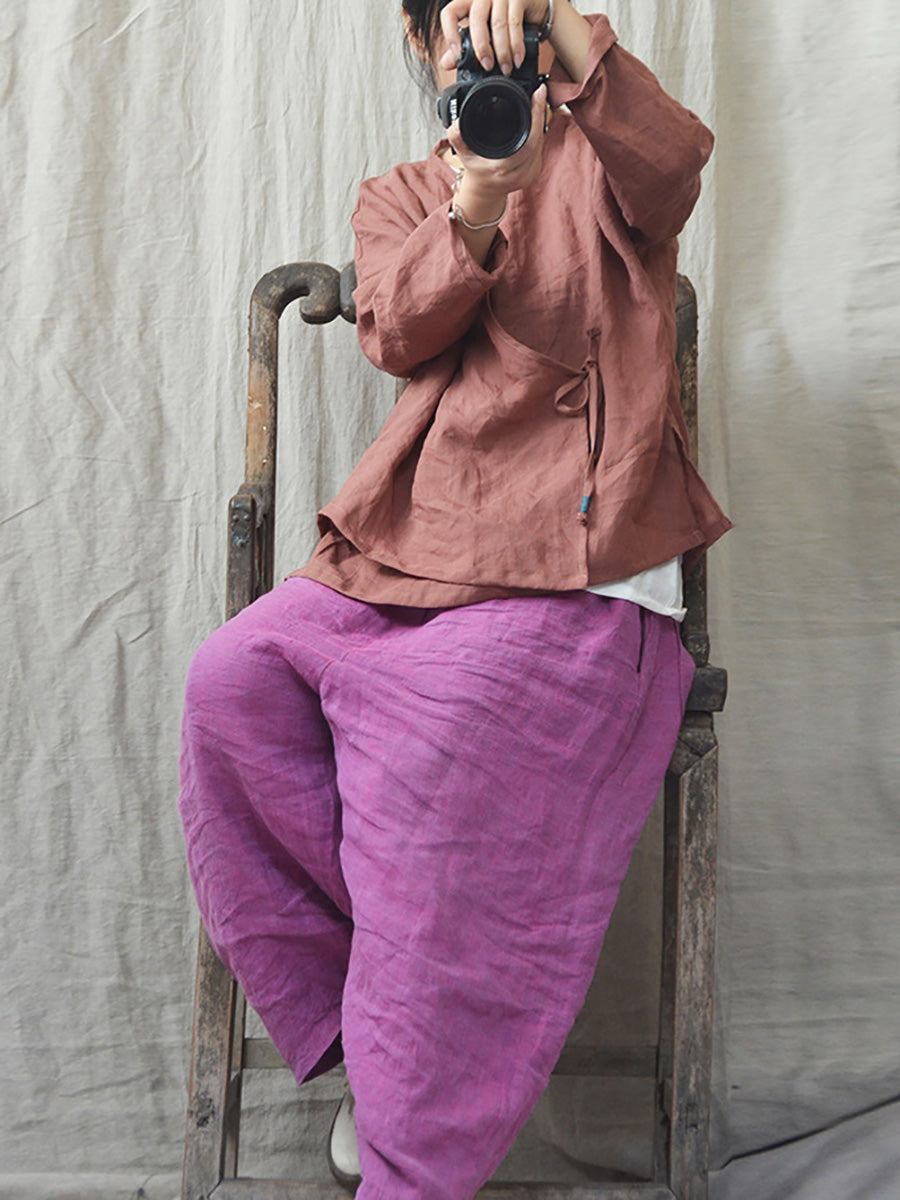 這款復古襯衫採用 100% 亞麻精製而成,具有純色圖案、V 領、插肩袖和復古風格,非常適合秋季和春季。